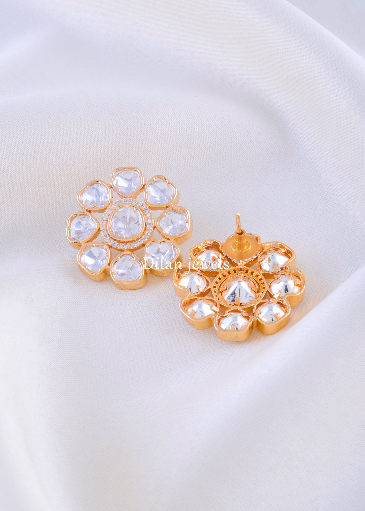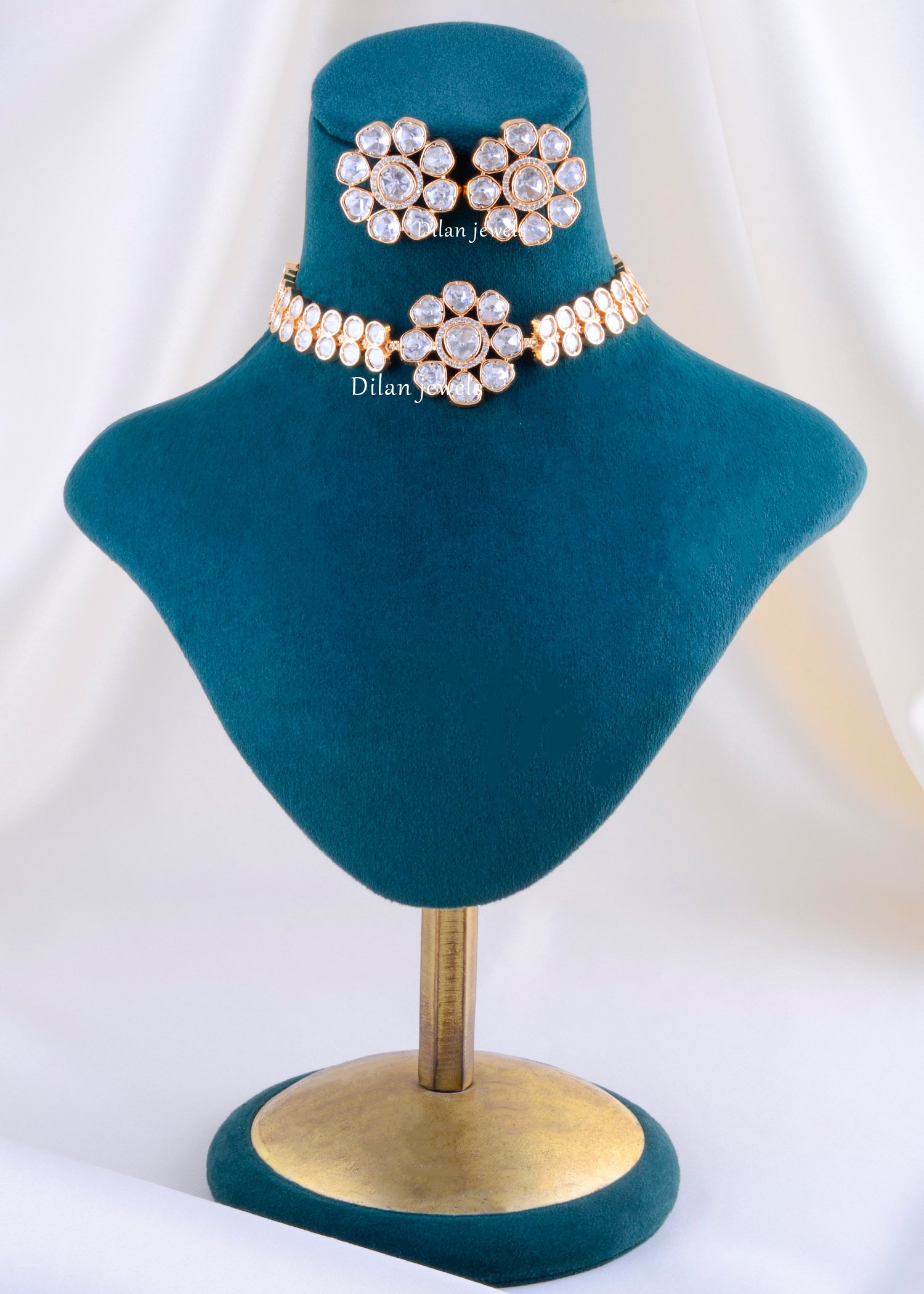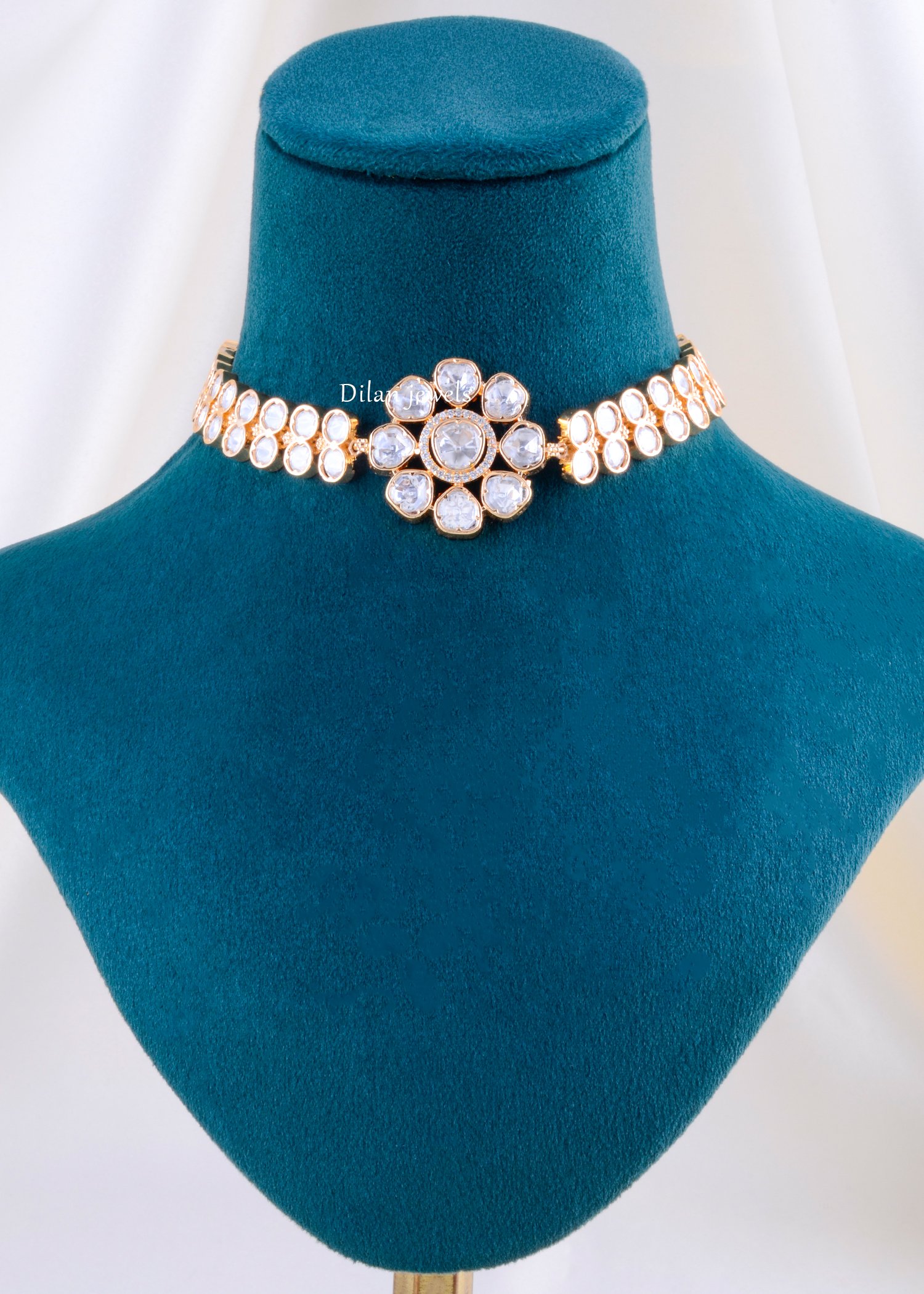 Radiate festive glamour with this exquisite choker necklace set, crafted in premium German silver and finished in rich gold polish. The design features a striking floral centerpiece made of AAA-quality sparkling diamonds and luminous Kundan pulki stones, set along a double row of gleaming Kundan rounds. Matching oversized floral stud earrings echo the choker’s motif, creating a perfectly coordinated, high-impact look. Lightweight yet luxurious, this set is ideal for weddings, sangeet nights, and festive celebrations, pairing beautifully with sarees, lehengas, and contemporary Indo‑western outfits.