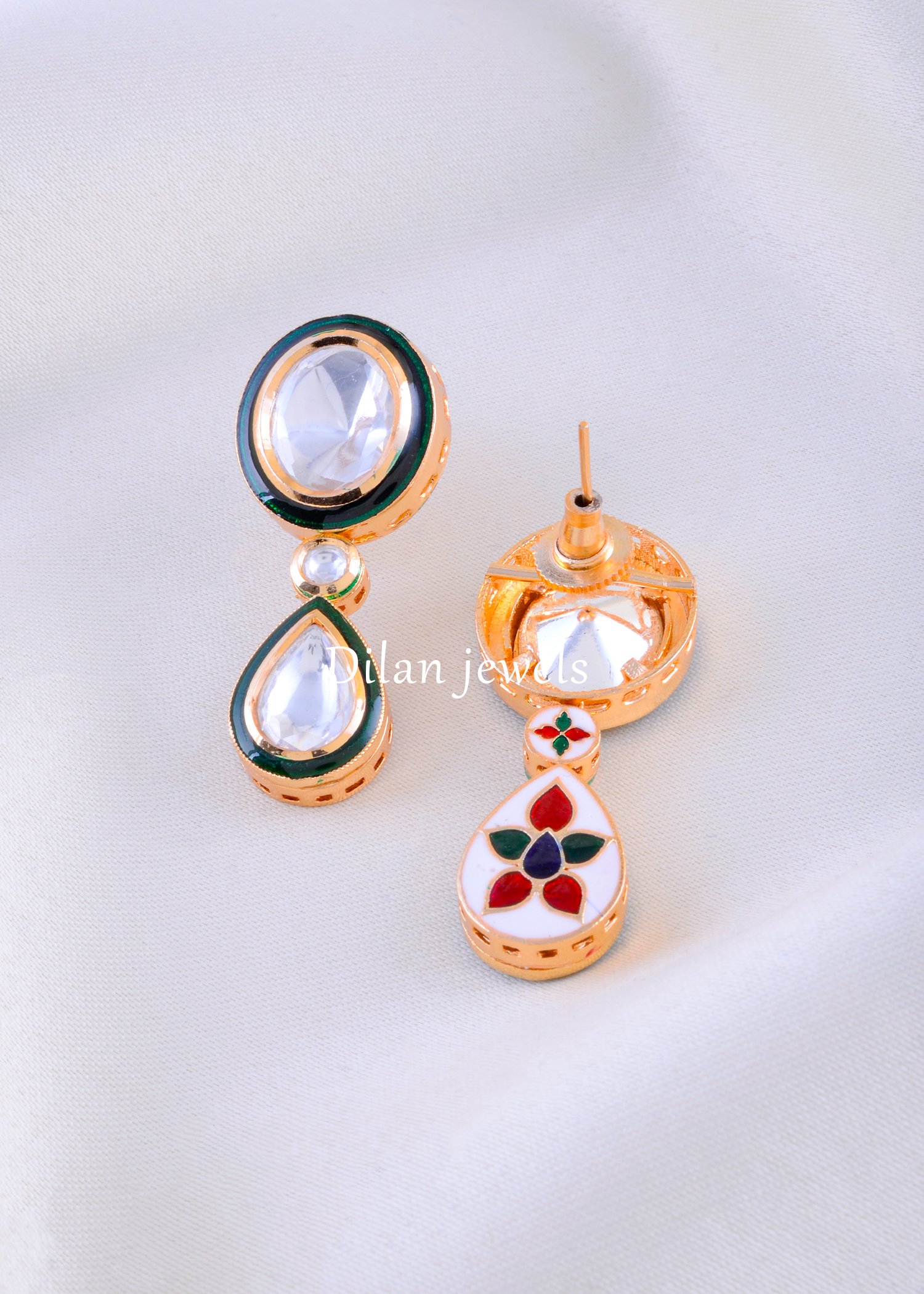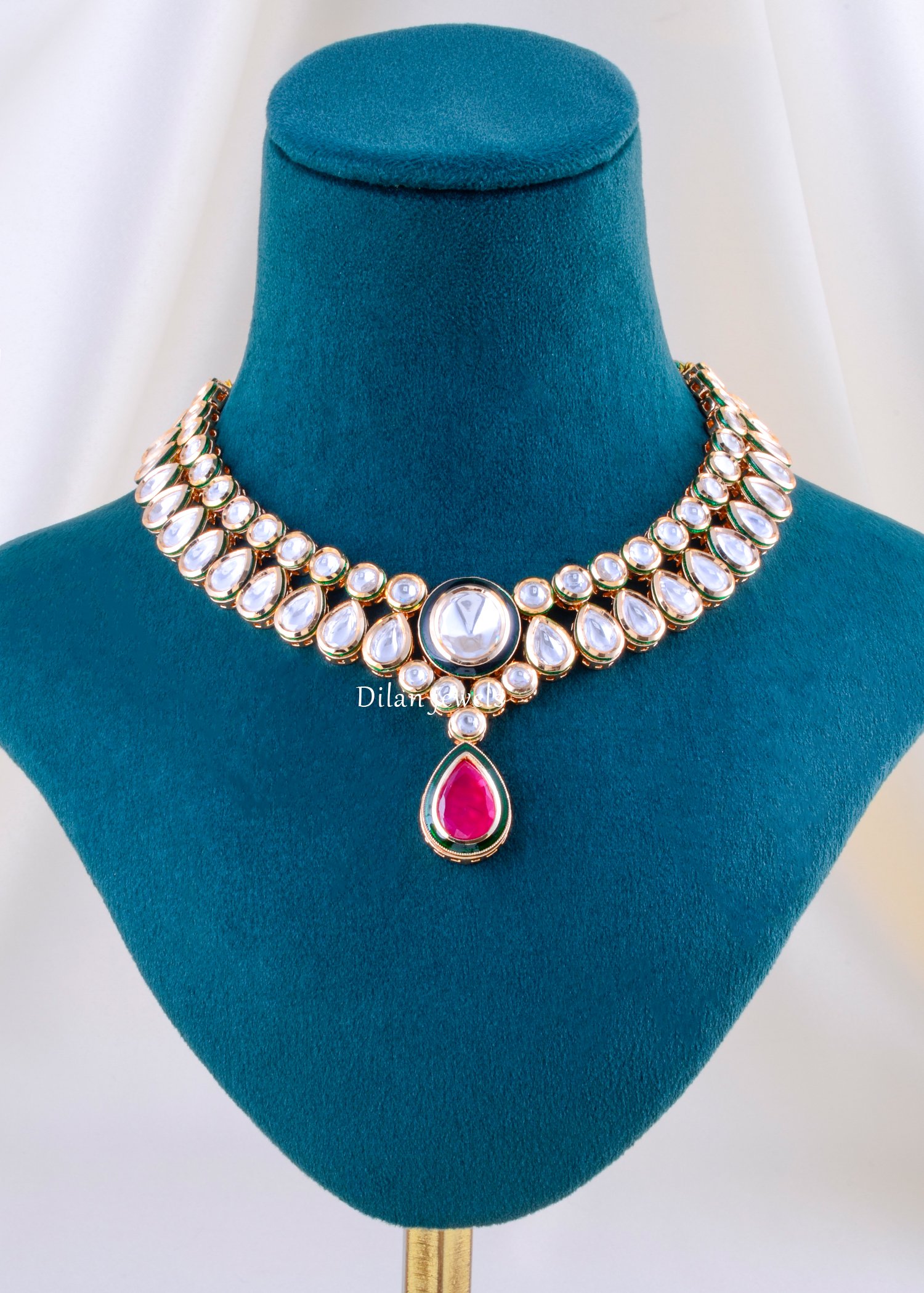 Exude regal elegance with this stunning Kundan Pulki necklace set, expertly crafted in premium German silver with lustrous gold finish. The design features luminous Kundan stones intricately set in traditional bezels, arranged in a double-row pattern that beautifully frames the collarbone. A stunning teardrop ruby accent at the center adds rich color contrast and dramatic appeal. Delicate traditional detailing on the pendant showcases fine craftsmanship. Matching double-drop earrings feature round and teardrop Kundan clusters with ruby accents. This timeless heirloom piece is perfect for weddings, festive celebrations, and special occasions, blending heritage craftsmanship with modern sophistication.