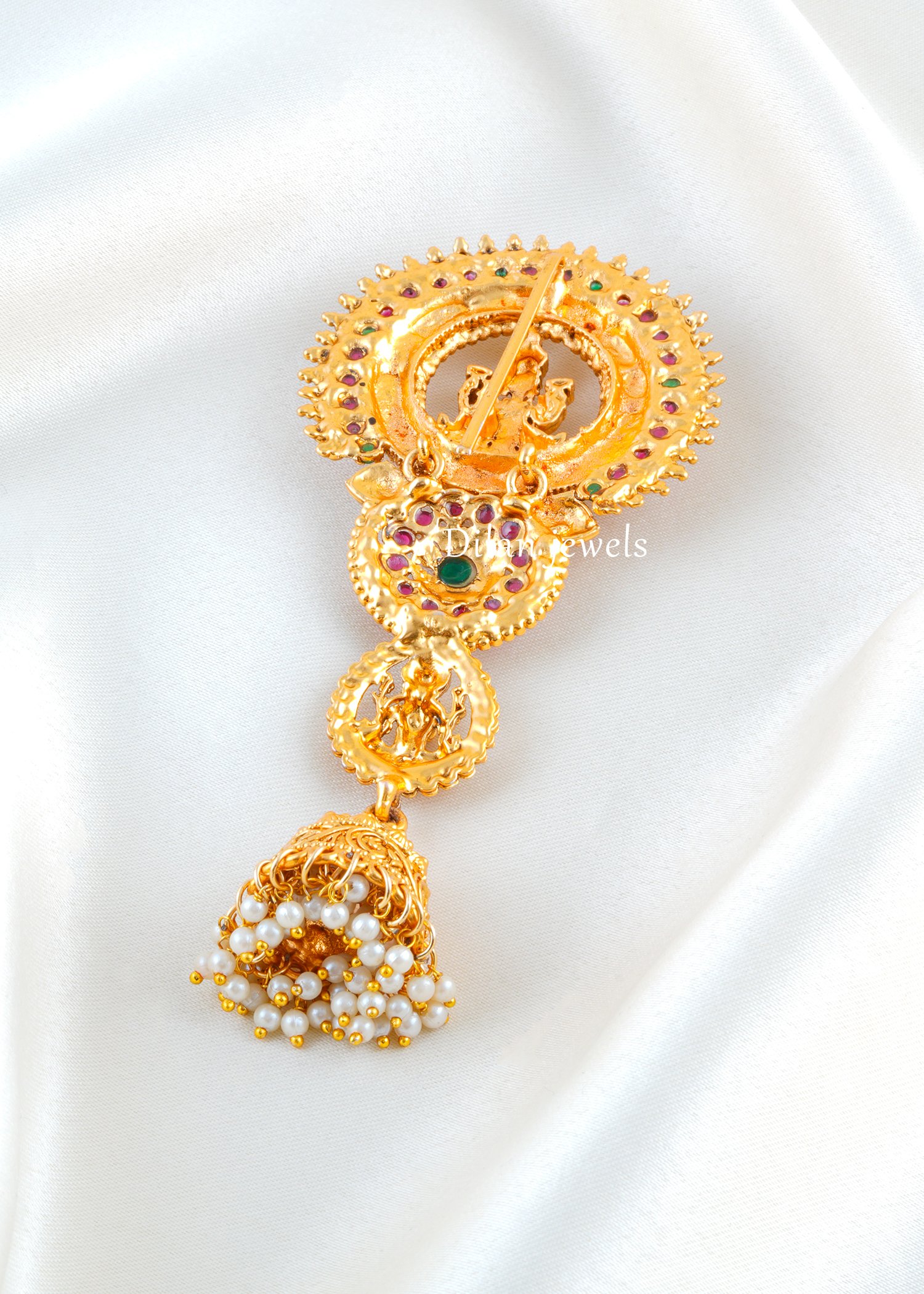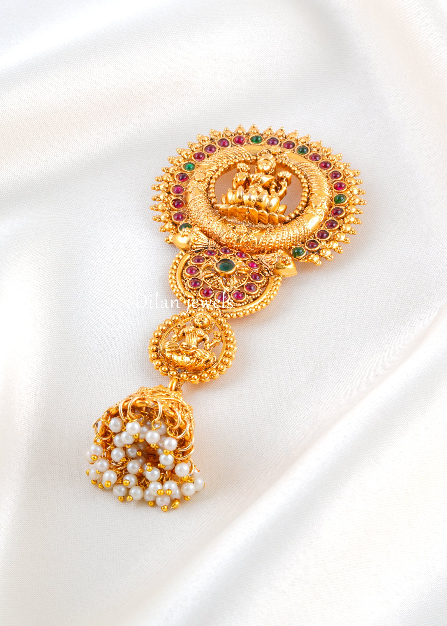Add a divine touch to your traditional look with this exquisitely crafted Juda Pin, made in premium German silver with a rich gold finish. Featuring intricate temple-inspired detailing with a beautifully carved Goddess motif, this piece reflects timeless heritage artistry. The circular design is accented with delicate stone embellishments and finished with elegant pearl danglings that add graceful movement and charm. Perfect for weddings, festive occasions, Bharatanatyam performances, and bridal hairstyles, this Juda Pin enhances your bun with royal elegance and cultural sophistication. A statement accessory for every traditional celebration.