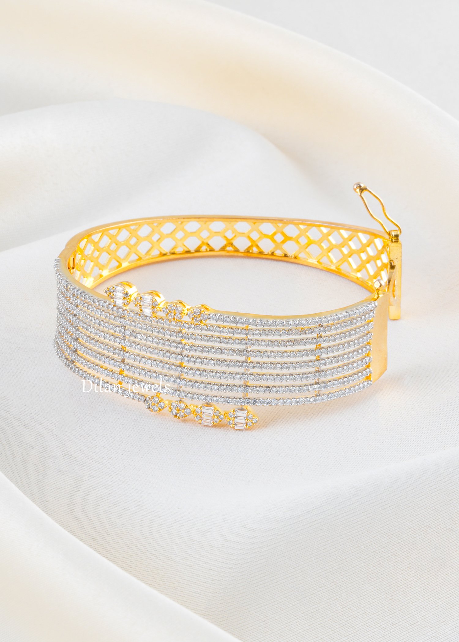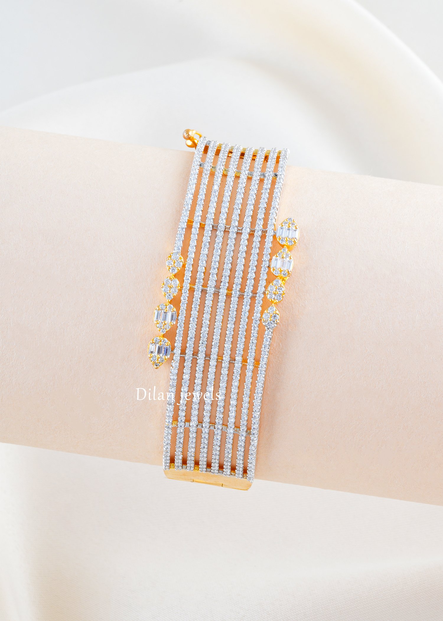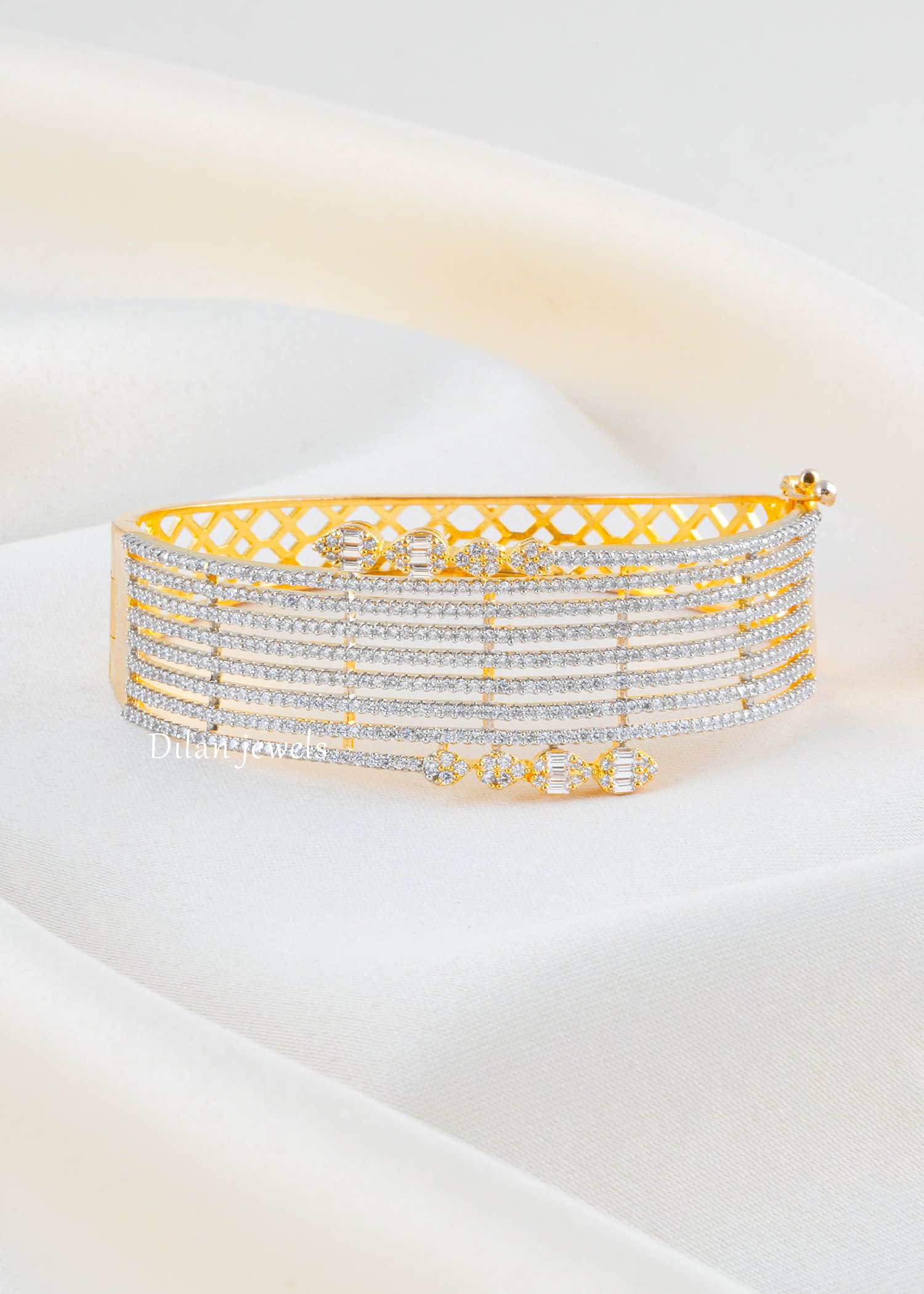 Add statement sparkle to your jewelry collection with this stunning bracelet, crafted in premium German silver and adorned with AAA quality American diamonds. Designed with sleek multi-line stone detailing and highlighted by elegant pear and baguette-inspired motifs, this bracelet blends glamour with sophistication. The broad silhouette gives it a rich, luxurious look, making it perfect for weddings, festive occasions, parties, and evening wear. Its refined finish and radiant brilliance make it an eye-catching accessory that beautifully complements both ethnic and contemporary outfits.