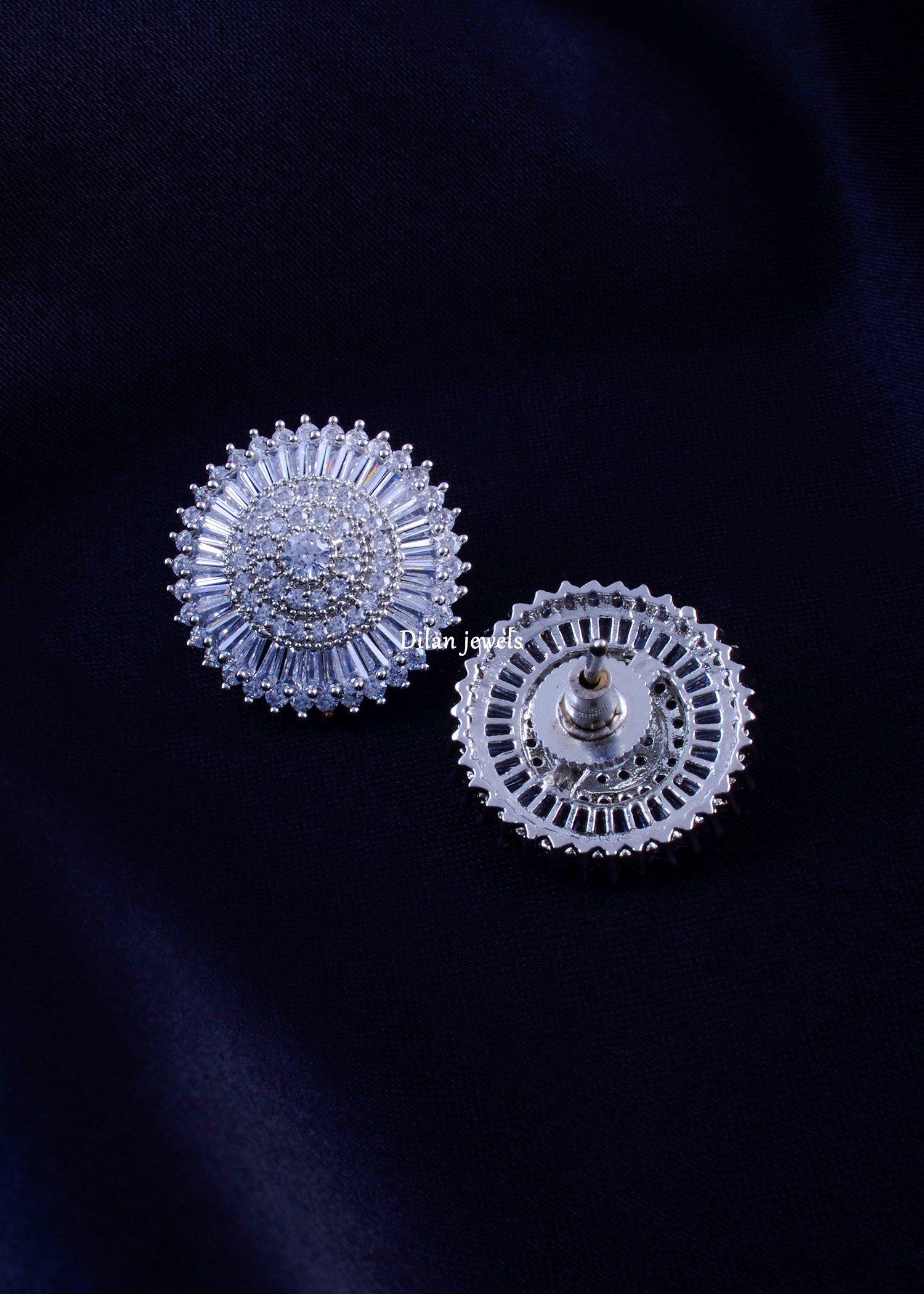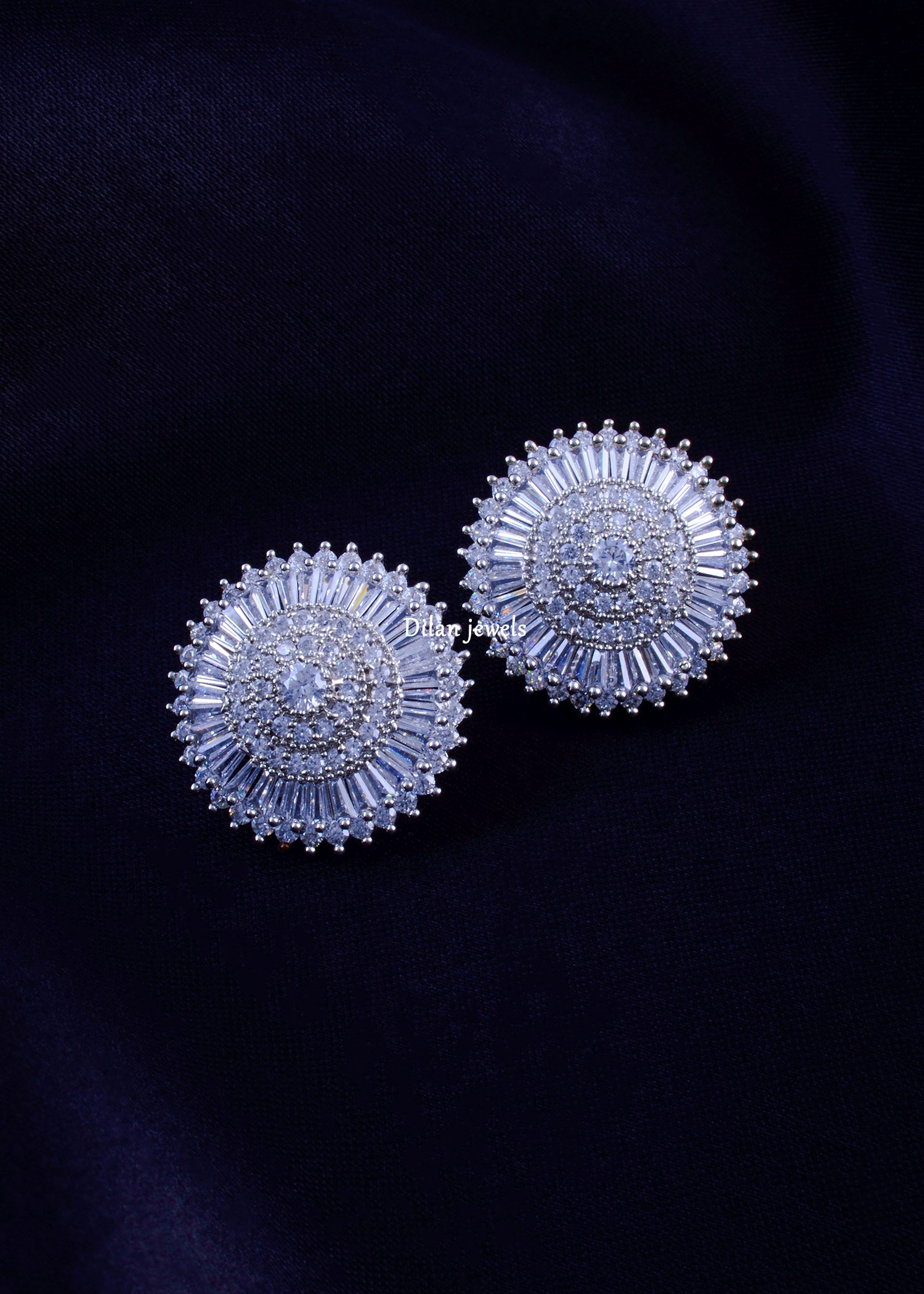Elevate your everyday elegance with these stunning German silver stud earrings, meticulously crafted with AAA quality American diamonds. Designed in a radiant burst pattern, the earrings feature concentric layers of sparkling round and baguette-cut stones that create a luxurious, high-shine effect. Lightweight yet striking, they offer the perfect blend of sophistication and comfort, making them ideal for both festive occasions and refined daily wear. Their timeless circular design ensures they remain a classic addition to any jewellery collection, adding effortless glamour to every look.