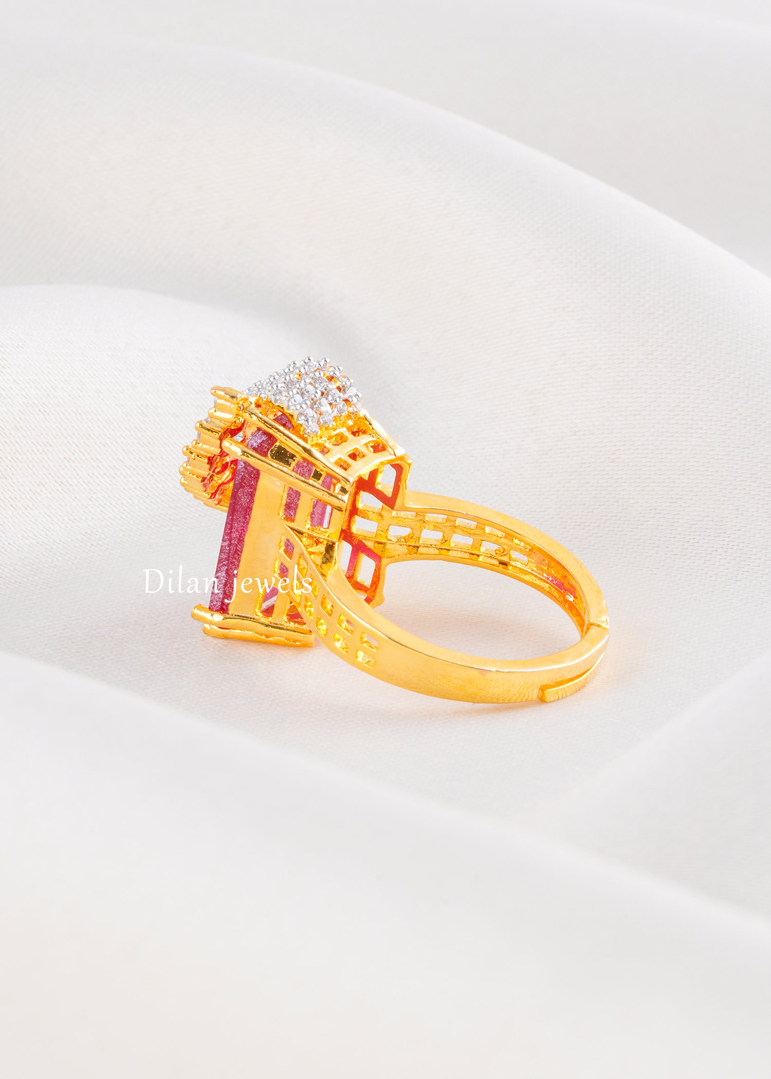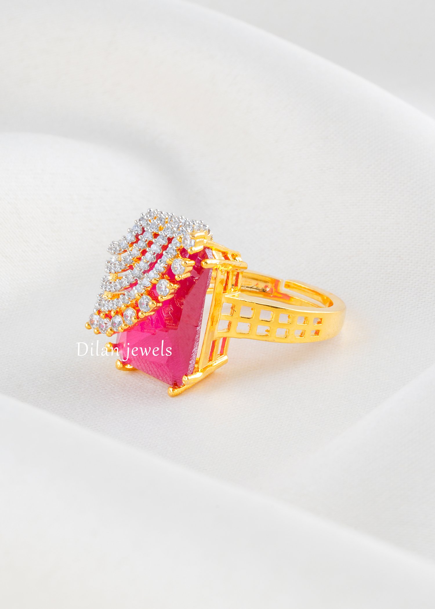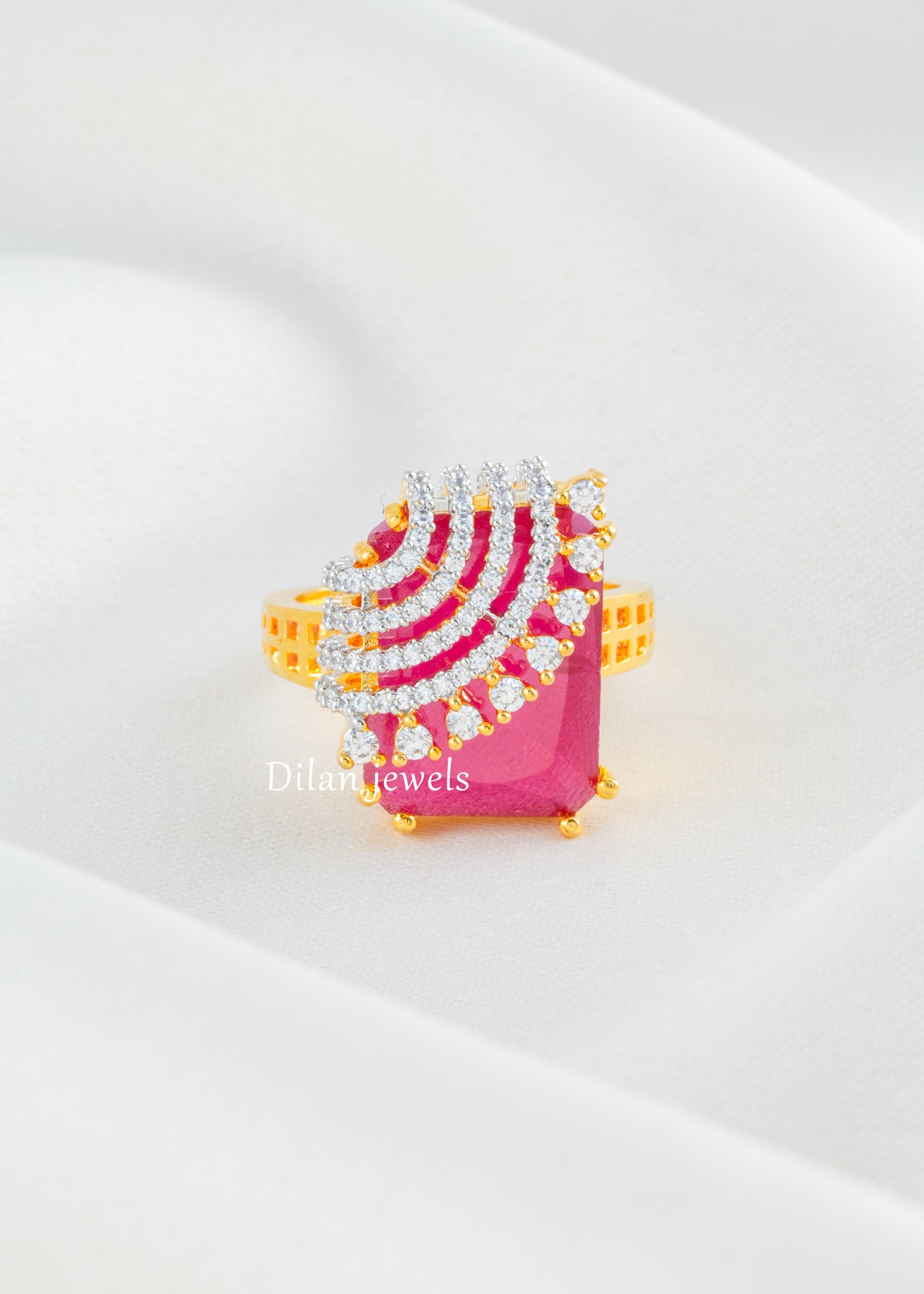 Embrace passionate glamour with this sensational ruby cocktail ring, expertly crafted in premium 22K gold-finish German silver. The design showcases a magnificent cushion-cut ruby gemstone as the striking centerpiece, crowned with an ornate fan-shaped tiara of AAA-quality American diamonds in varying sizes for maximum sparkle and dimension. Ruby-red enamel accents beautifully contrast with luminous diamond pavé, while the intricately pierced band adds contemporary architectural sophistication. Perfect for weddings, celebrations, and special occasions, this statement piece exudes regal opulence and timeless elegance, making it an unforgettable addition to any collection.