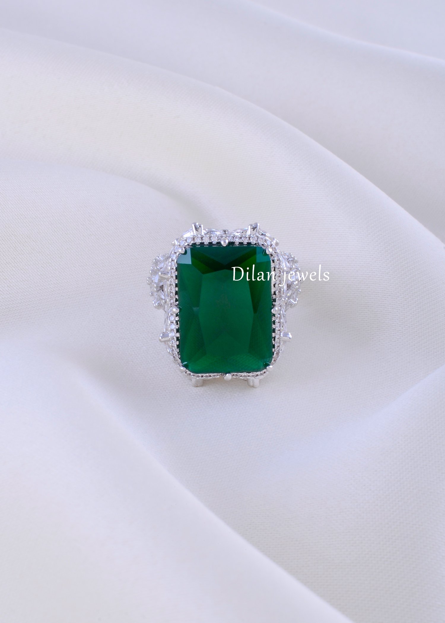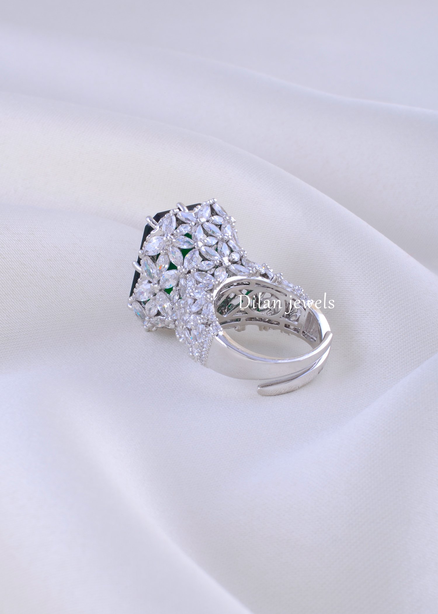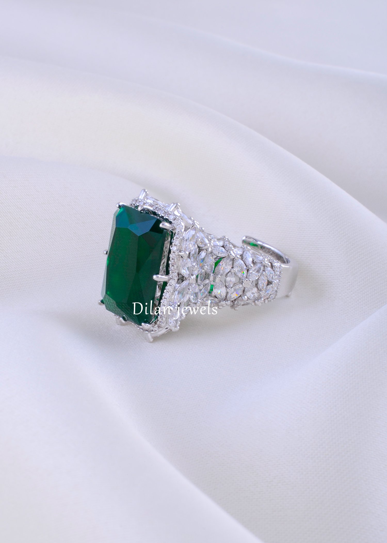 Indulge in luxury with this stunning adjustable statement ring, expertly crafted from premium German Silver with a bright rhodium finish. The ring features a breathtaking emerald-cut green gemstone as the centerpiece, flanked by an exquisite halo of sparkling AAA-quality American Diamonds. The intricate pave setting showcases hundreds of brilliant stones that catch light from every angle, creating a dazzling, high-fashion look. The adjustable band ensures a perfect fit for all occasions, making it ideal for cocktail parties, engagements, or everyday elegance. This timeless piece combines classic sophistication with contemporary design, perfect for the discerning jewelry lover seeking affordable luxury.