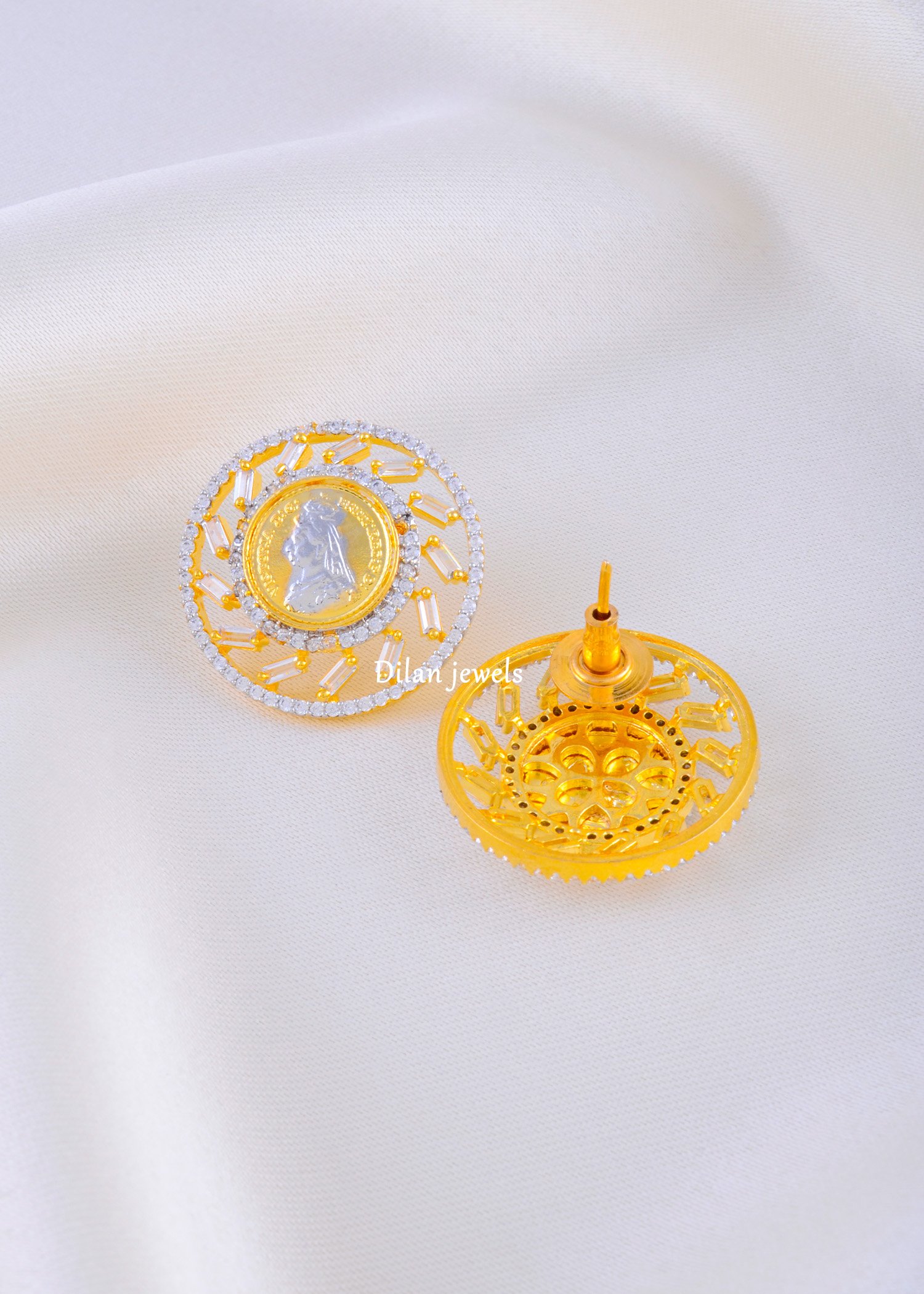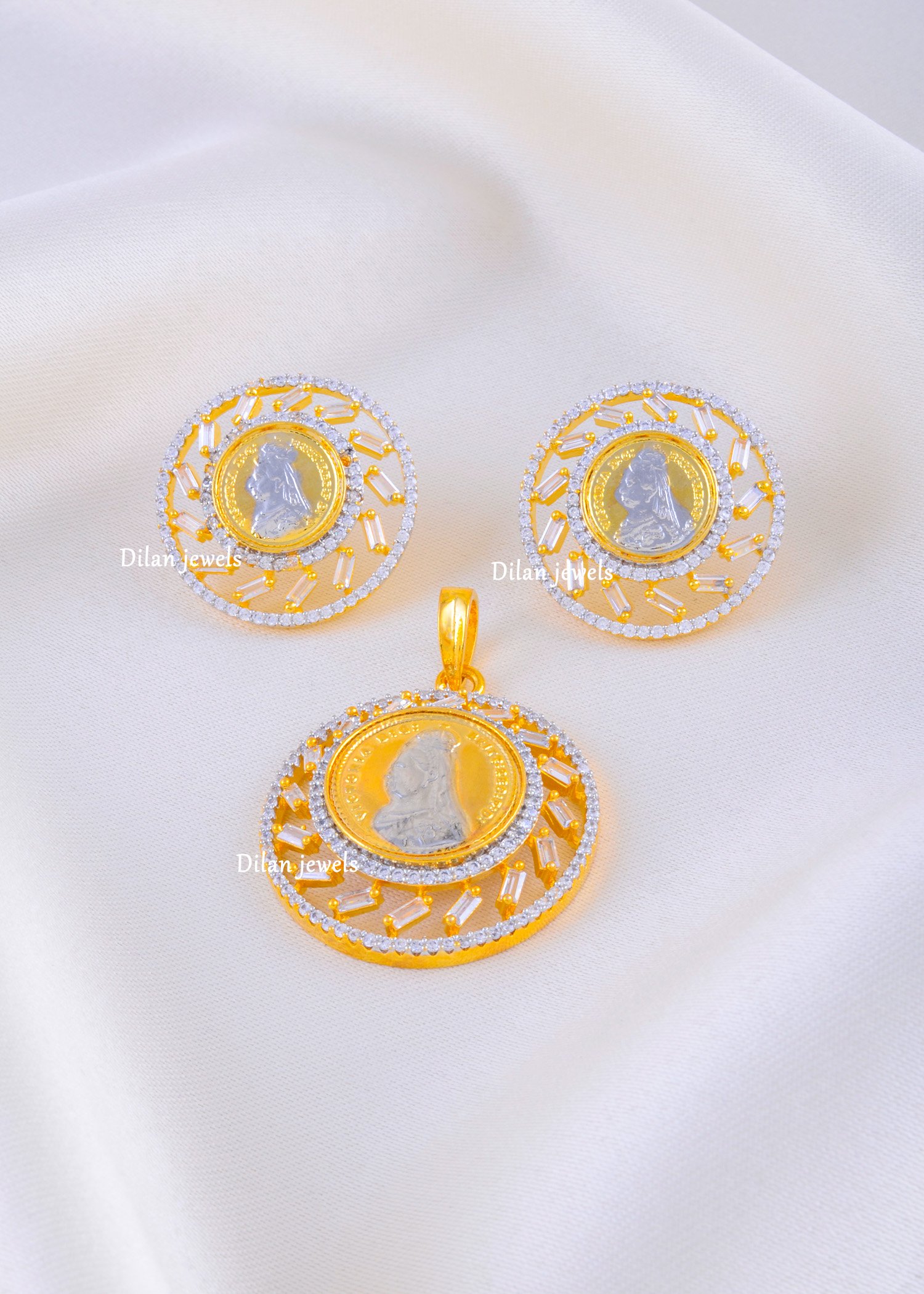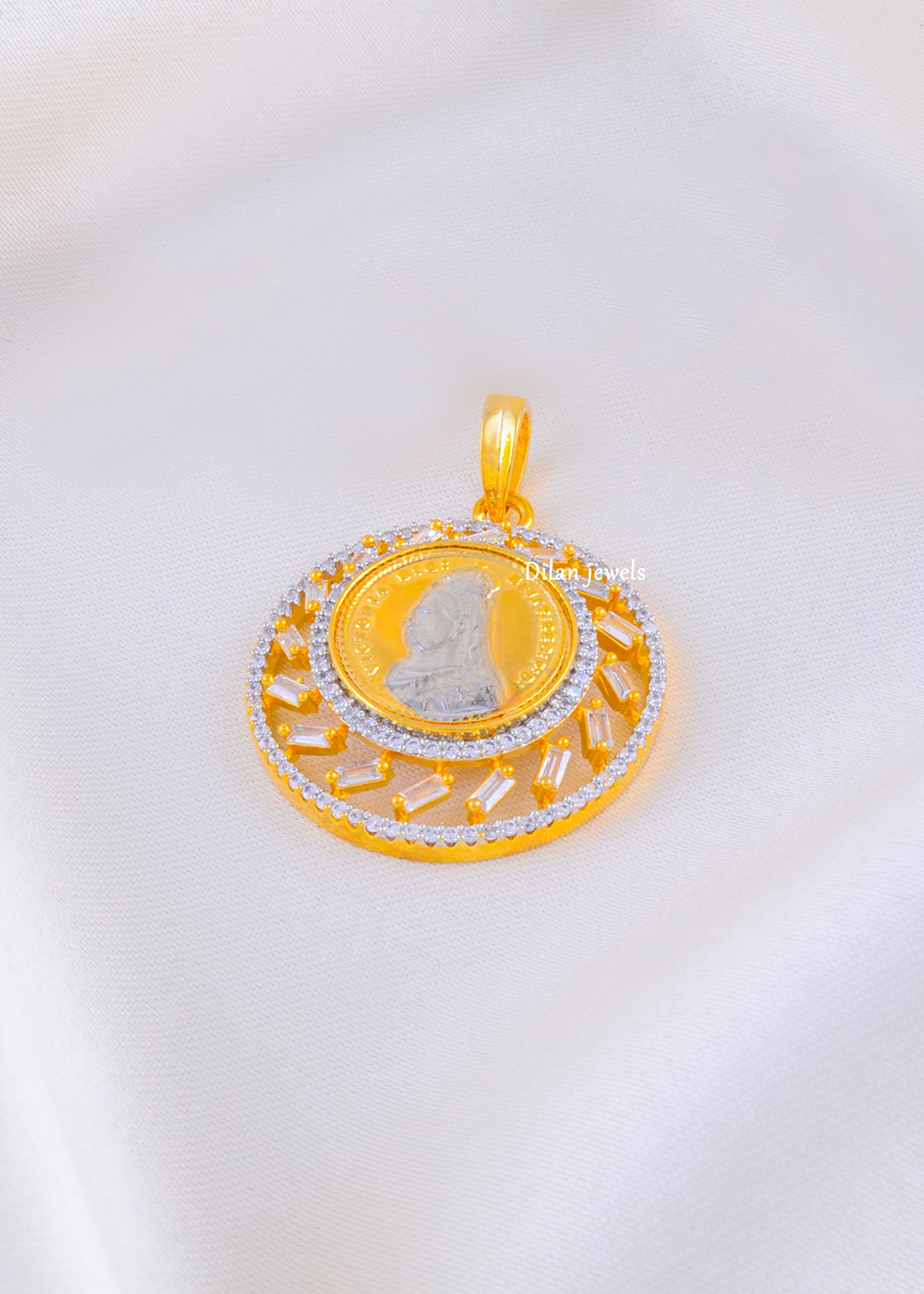 This elegant pendant set is crafted from high-quality German silver and adorned with sparkling AAA-grade American Diamonds. The centerpiece features a classic dual-tone coin design, beautifully surrounded by shimmering baguette-cut and round AD stones that enhance its royal charm. The matching earrings mirror the pendant’s intricate detailing, making the set perfect for festive occasions, weddings, traditional wear, or gifting. Lightweight yet luxurious, this timeless jewellery piece blends heritage style with modern sophistication, adding a touch of regal elegance to any outfit.