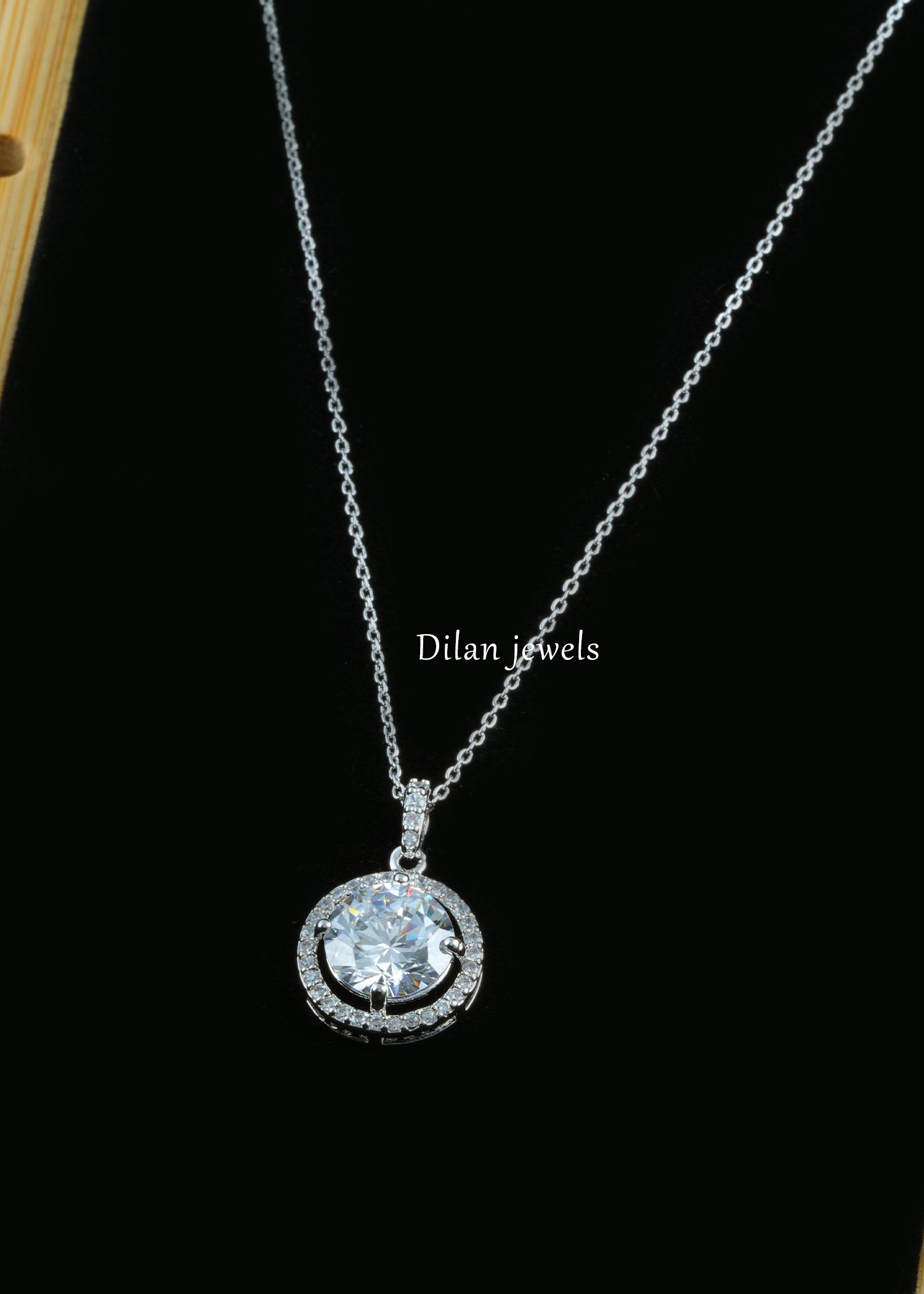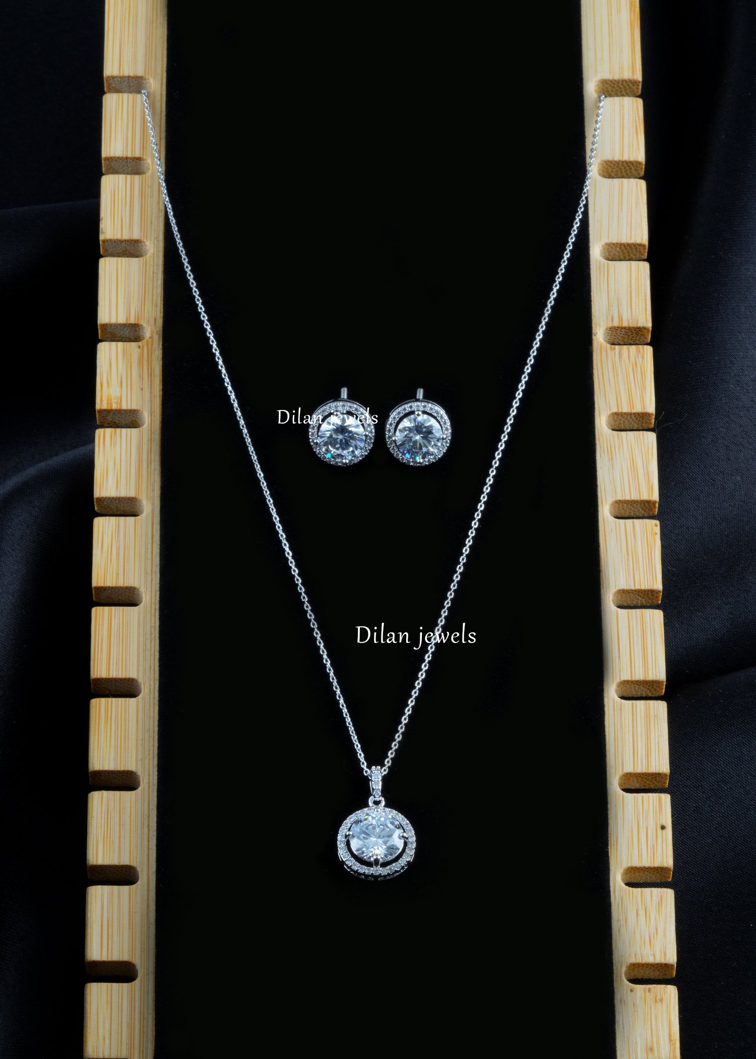 Make a statement of refined elegance with this stunning necklace set, crafted in premium German silver and embellished with AAA quality American diamonds. The pendant showcases a brilliant 3 ct. center stone encircled by a delicate halo, radiating exceptional sparkle and sophistication. Complemented by matching stud earrings featuring 2 ct. stones and a comfortable 1.00 cm length, this set offers a perfect balance of luxury and wearability. Lightweight yet eye-catching, it’s ideal for both special occasions and elegant daily wear, effortlessly enhancing your style with timeless brilliance.