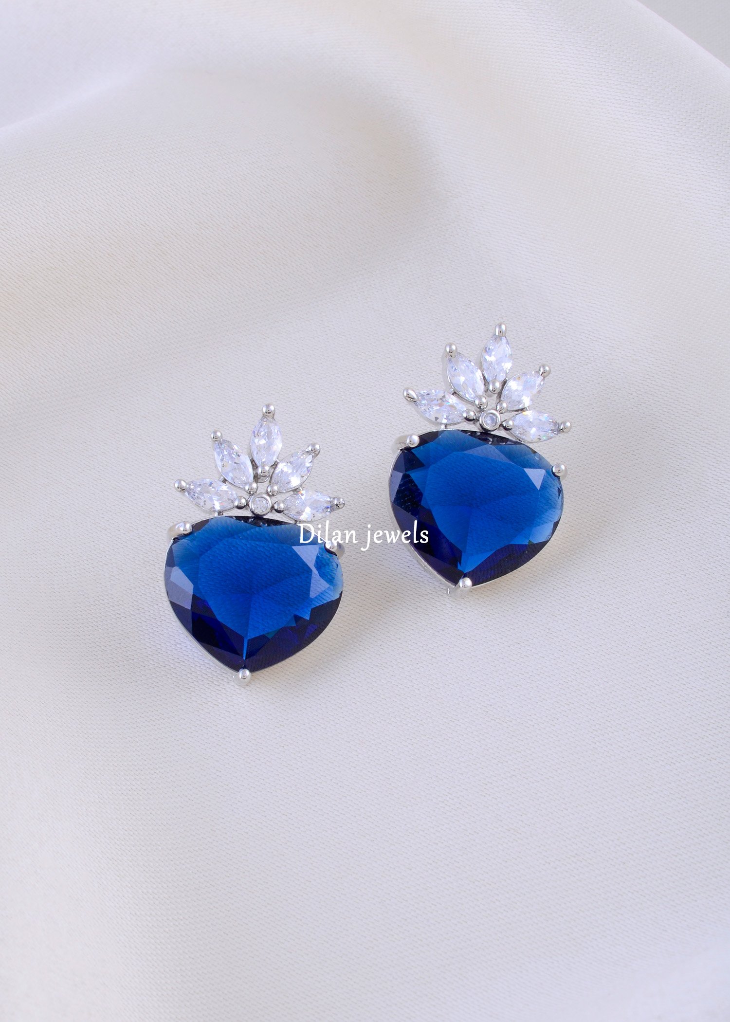 These stunning earrings are crafted in premium German silver and embellished with AAA-quality American diamonds for an elegant, high-shine finish. The deep sapphire-blue heart-shaped stone adds a rich, luxurious pop of color, beautifully complemented by a sparkling floral diamond cluster on top. Designed to make a statement, these lightweight earrings are perfect for parties, weddings, and festive celebrations. Their refined craftsmanship, vivid brilliance, and timeless charm make them a standout addition to any jewellery collection.