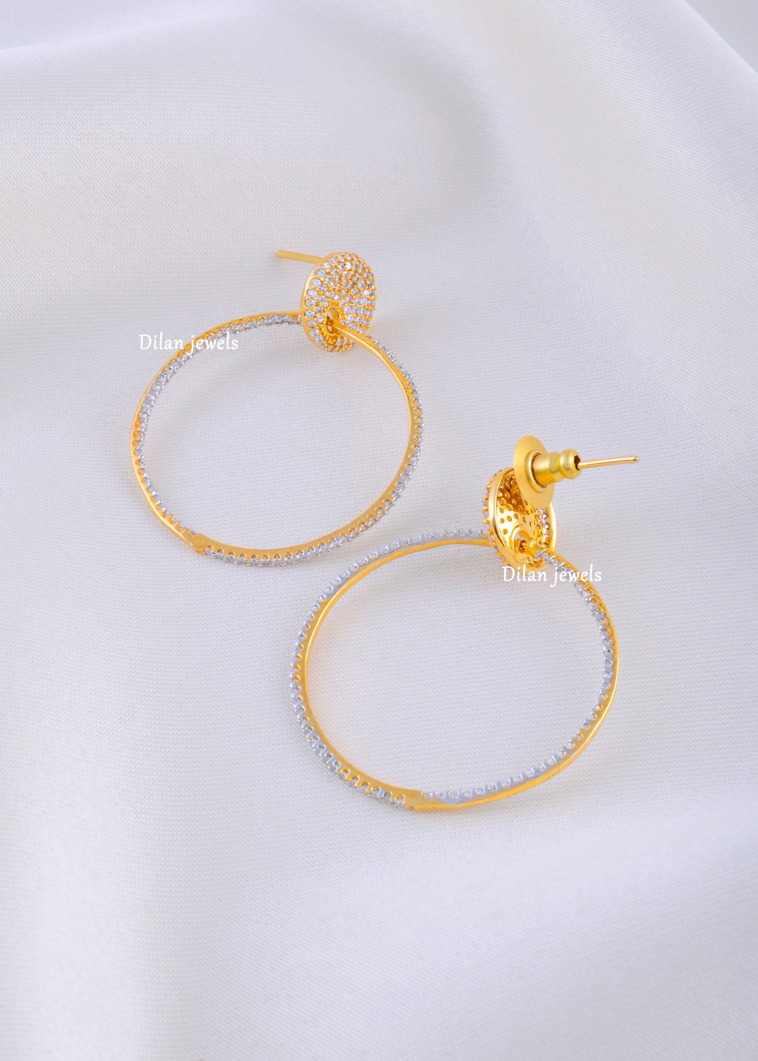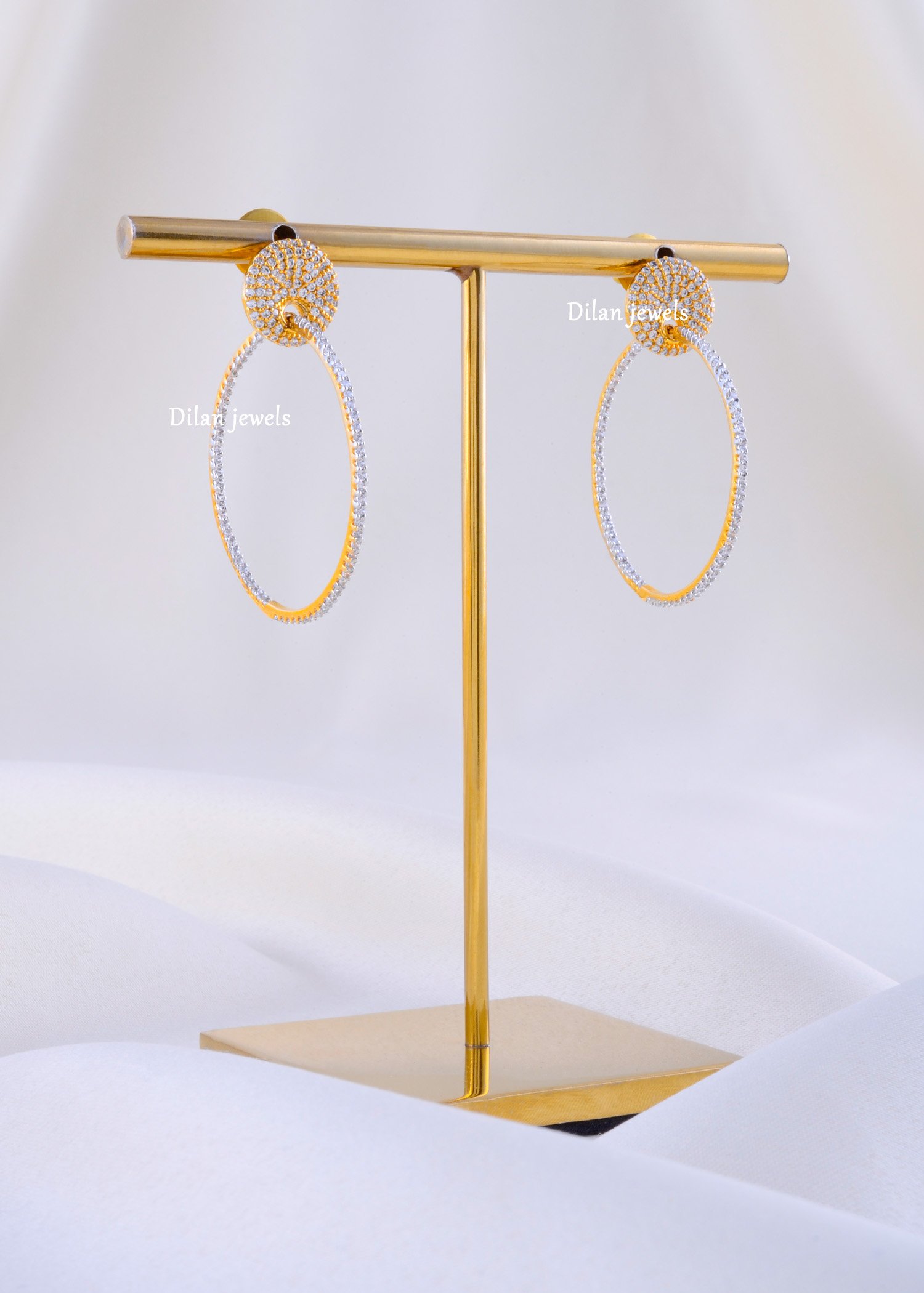 Step into modern elegance with these Sleek Gold-Plated Pave Oval Hoops, masterfully crafted from German Silver. This contemporary design features a shimmering, crystal-encrusted button stud that suspends a large, slender oval halo. The front-facing silhouette is fully lined with AAA quality American Diamonds, creating a continuous ribbon of sparkle that frames the face beautifully. Minimalist yet striking, these lightweight geometric earrings offer a sophisticated “diamond-look” finish, making them the perfect accessory to elevate your office attire or add a refined glow to your evening cocktail wear.