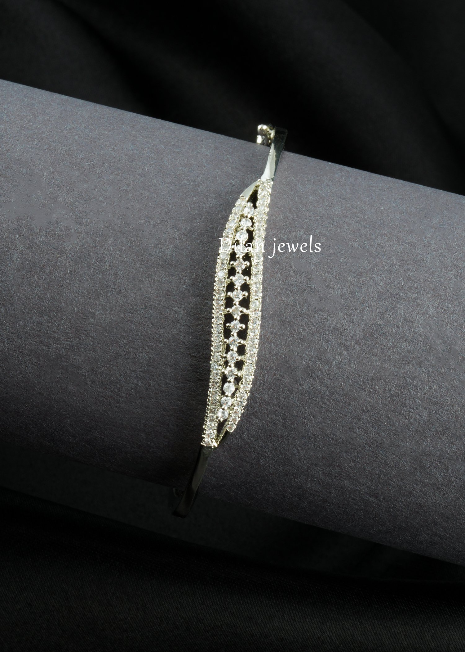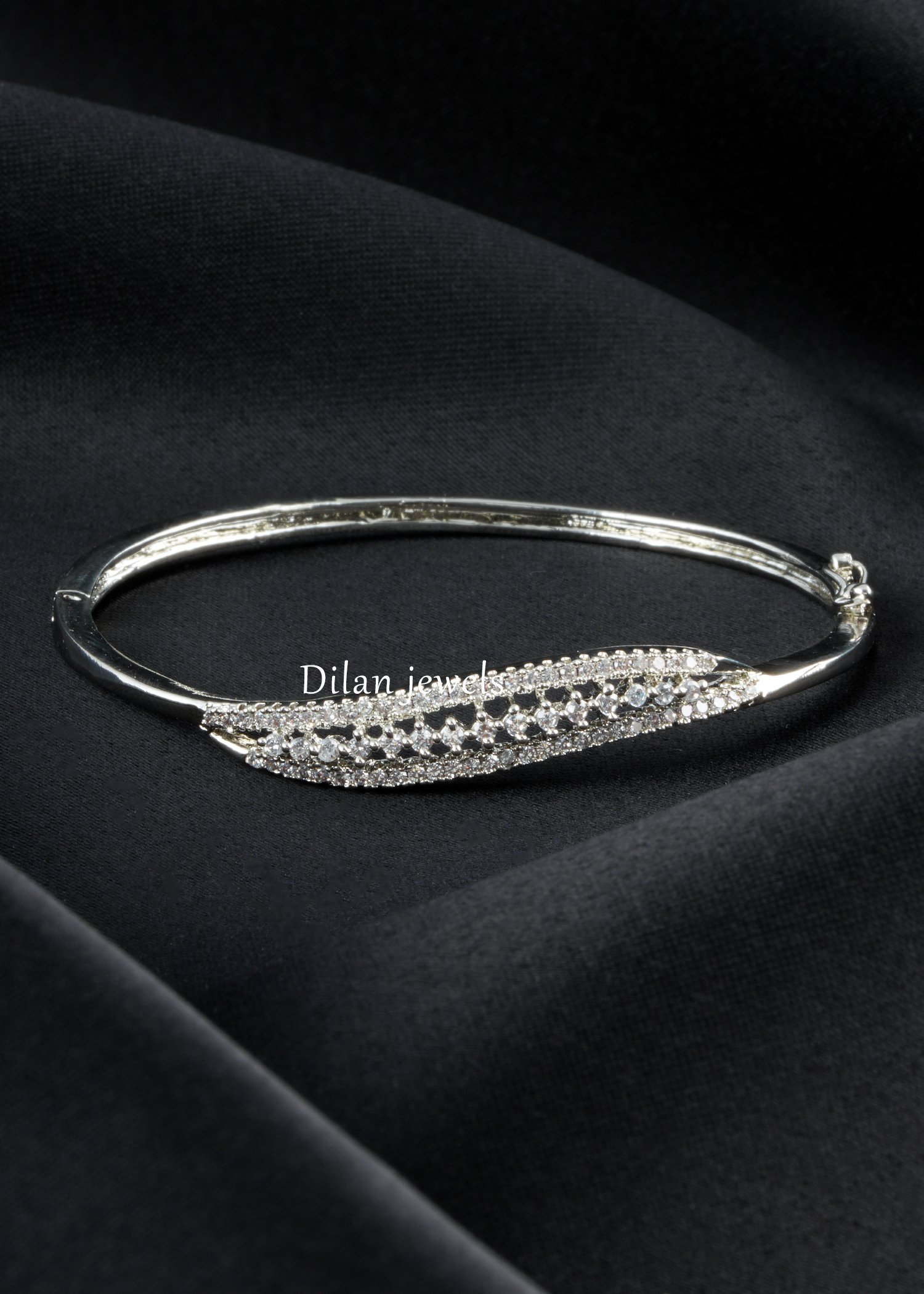 A sophisticated German silver bangle featuring a stunning leaf-shaped pave design densely studded with AAA-grade American diamonds. The graceful curved form creates an elegant, modern aesthetic while maintaining traditional craftsmanship excellence. The intricate pave work ensures brilliant sparkle from every angle, showcasing superior diamond quality and precision setting. The smooth, polished German silver band provides a sleek contrast to the glittering leaf pendant. Perfect for everyday luxury, office wear, or special occasions. The secure hinged closure guarantees comfortable wear. This refined statement piece combines minimalist design with maximum brilliance, ideal for those seeking sophisticated, contemporary jewelry with timeless appeal.