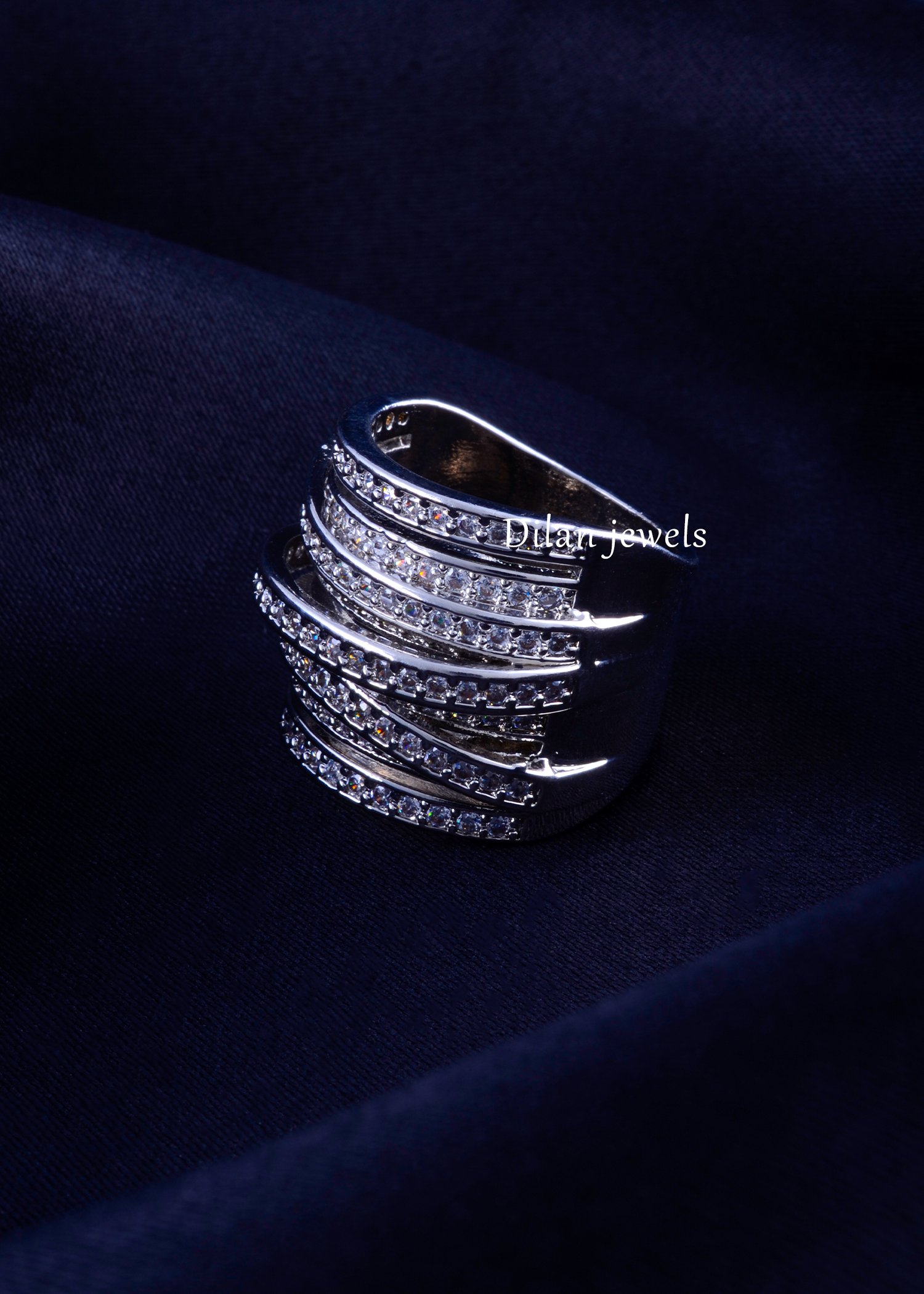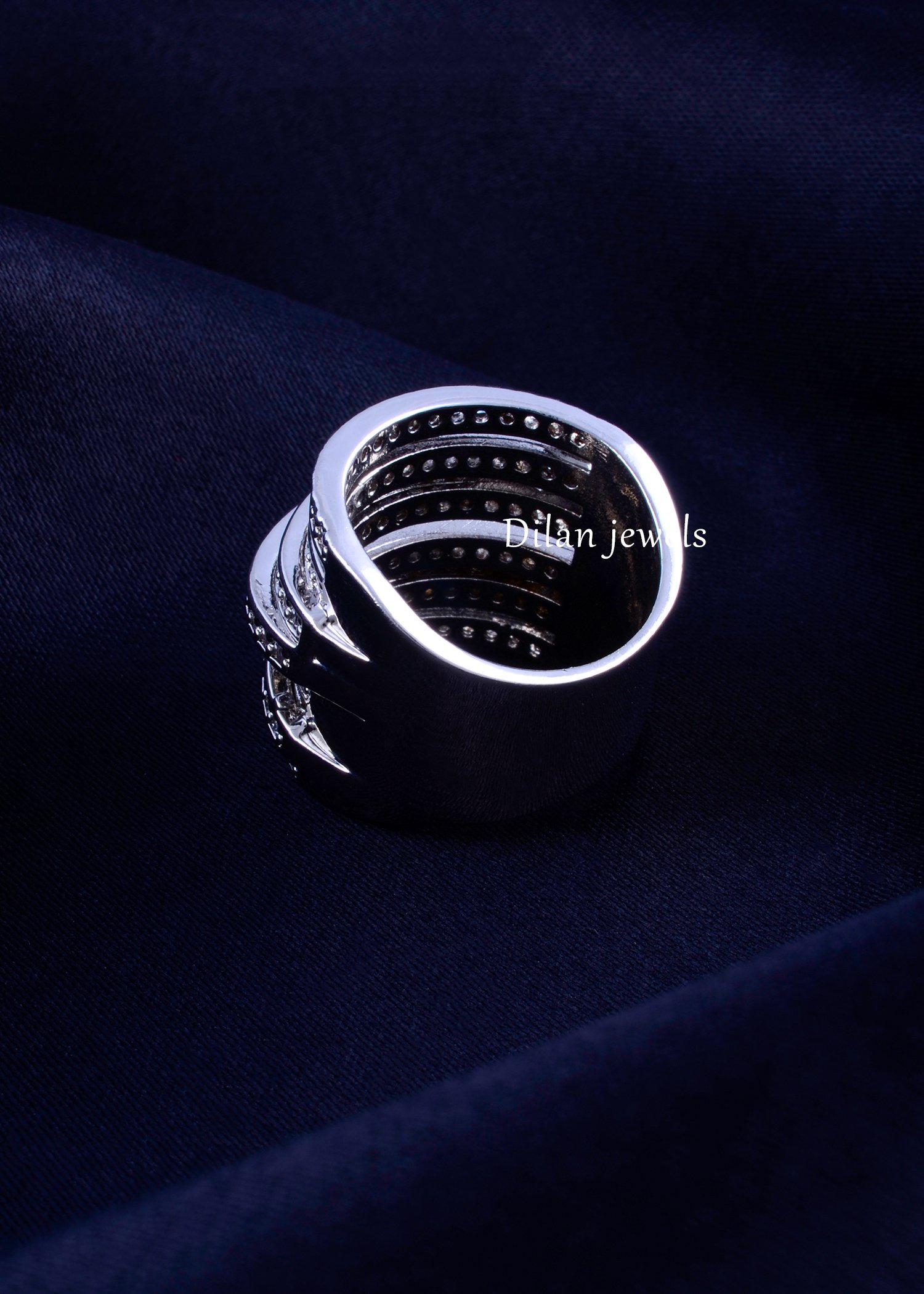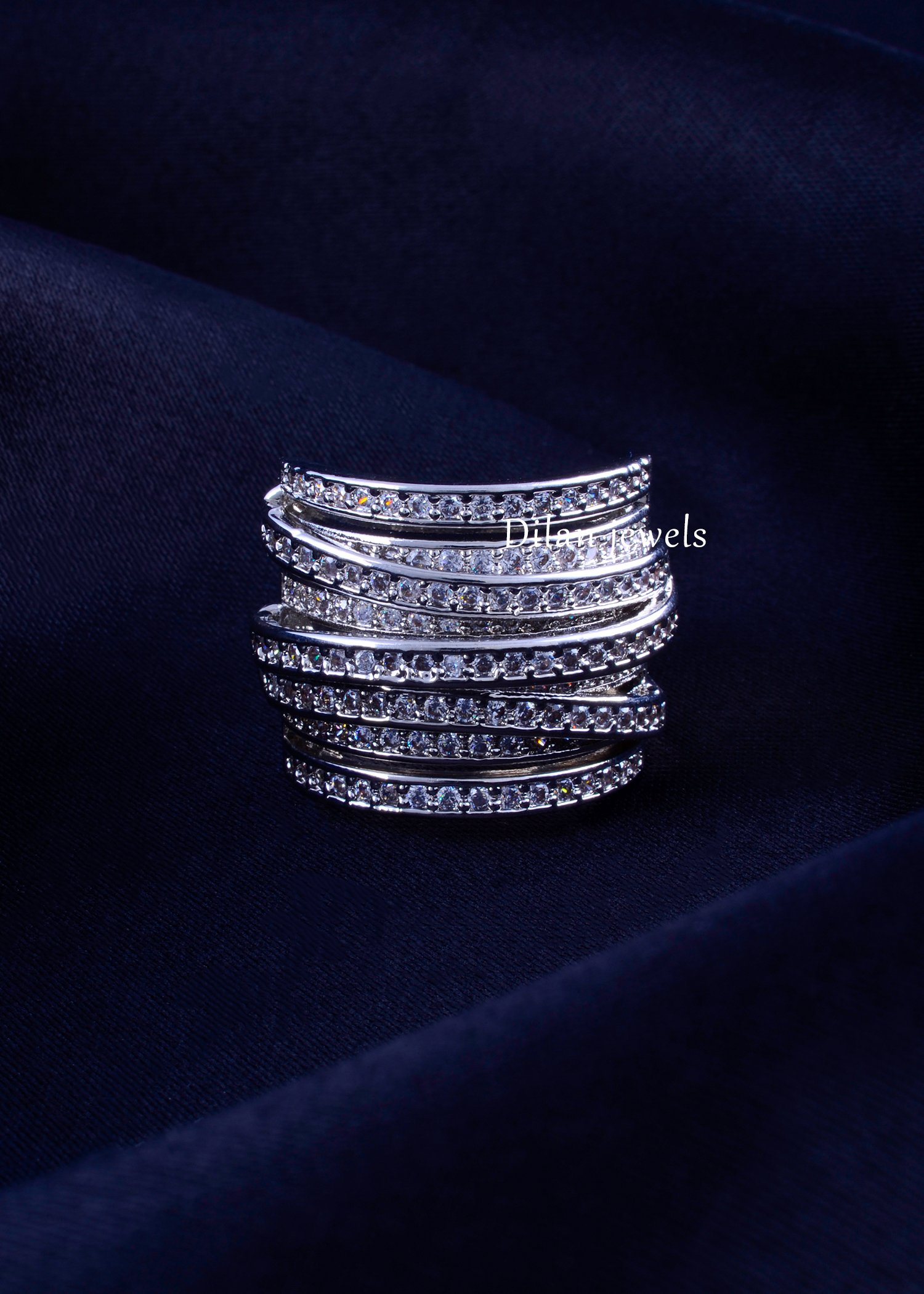 Make a bold fashion statement with this exquisite German Silver ring, designed with a contemporary multi-layer wrapped aesthetic. The wide band features intertwining rows densely set with sparkling AAA-quality American Diamonds, creating a mesmerizing effect of continuous brilliance. Its unique crossover silhouette simulates the look of stacked rings, offering modern sophistication and luxury. The channel-set stones, appearing as sleek baguettes, provide a seamless flow of light. Perfectly polished and comfortable to wear, this statement piece is ideal for cocktail parties or elevating your everyday style with a touch of modern glamour.
