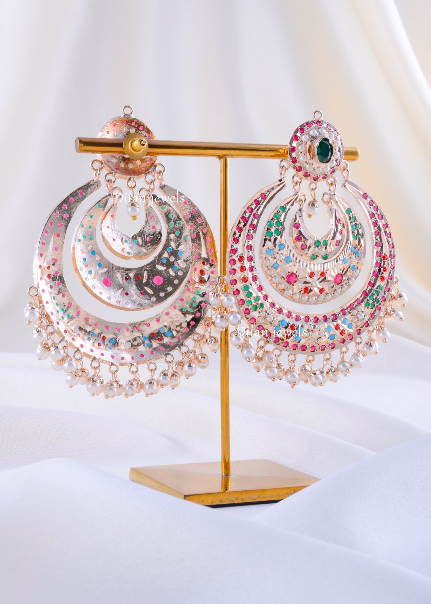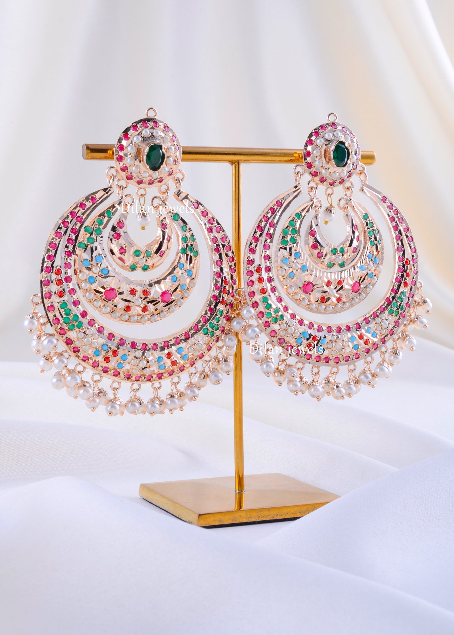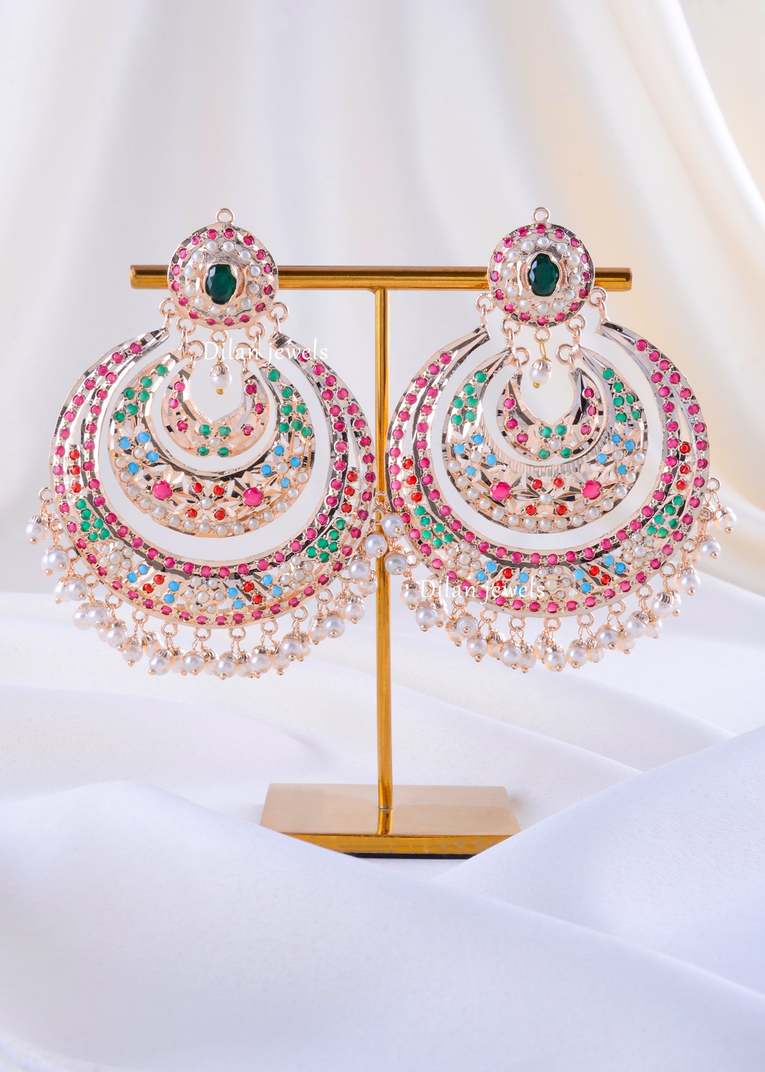 Captivate with these breathtaking multi-colored gemstone concentric chandelier earrings, expertly crafted from premium German Silver with luxurious gold plating. The design showcases an ornate filigree spherical bead top adorned with vibrant ruby, emerald, sapphire, and cubic zirconia stones, capping a stunning emerald-centered circular motif. Below unfolds an intricate three-layered concentric design, each adorned with brilliant multi-hued gemstones arranged in sophisticated patterns. The combination of white and gold filigree creates a mesmerizing kaleidoscopic effect. Elegant lustrous pearl drops cascade gracefully below, adding timeless femininity and movement. Perfect for weddings and festive celebrations, these statement earrings beautifully merge traditional Indian craftsmanship with contemporary glamour and undeniable luxury.