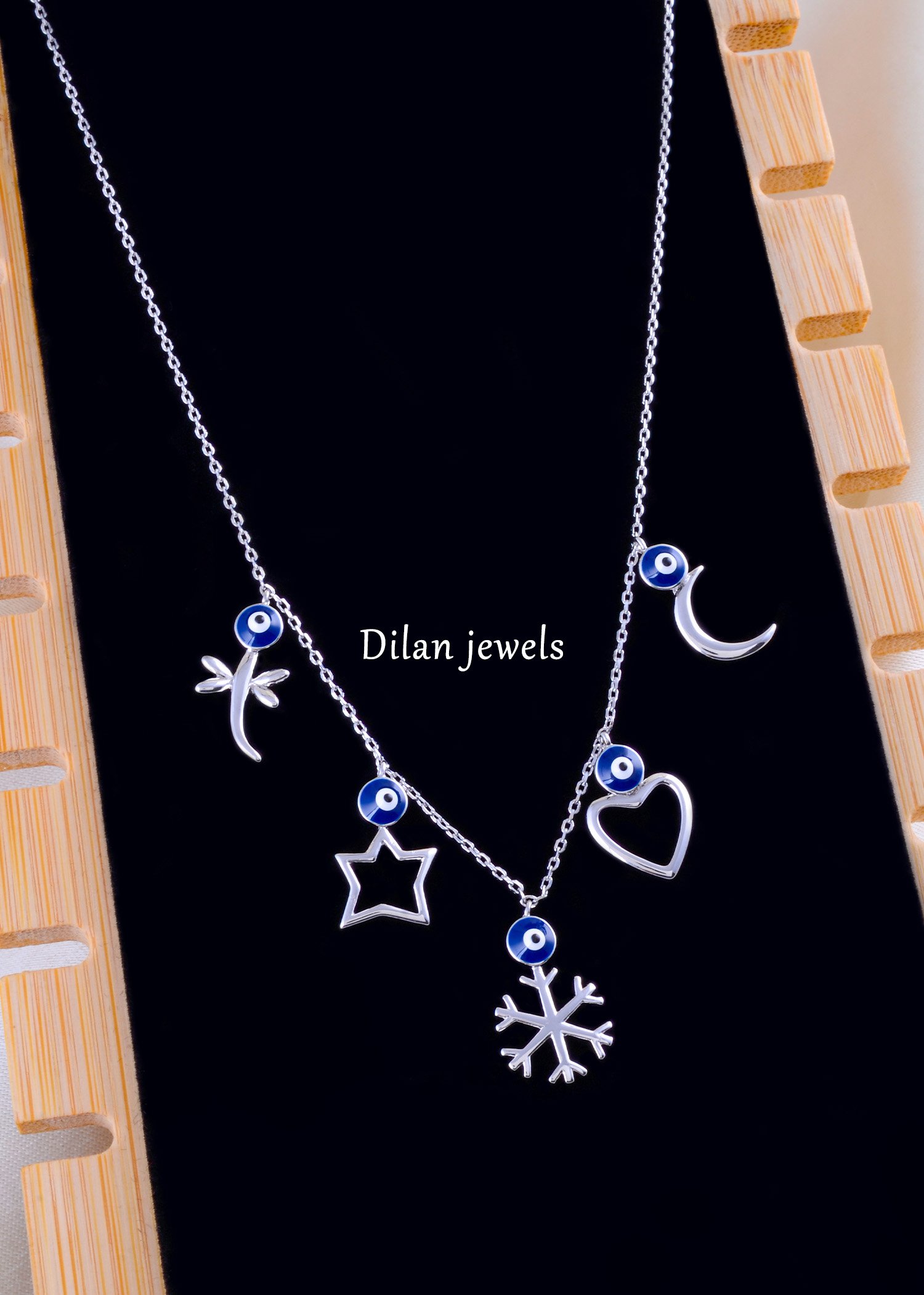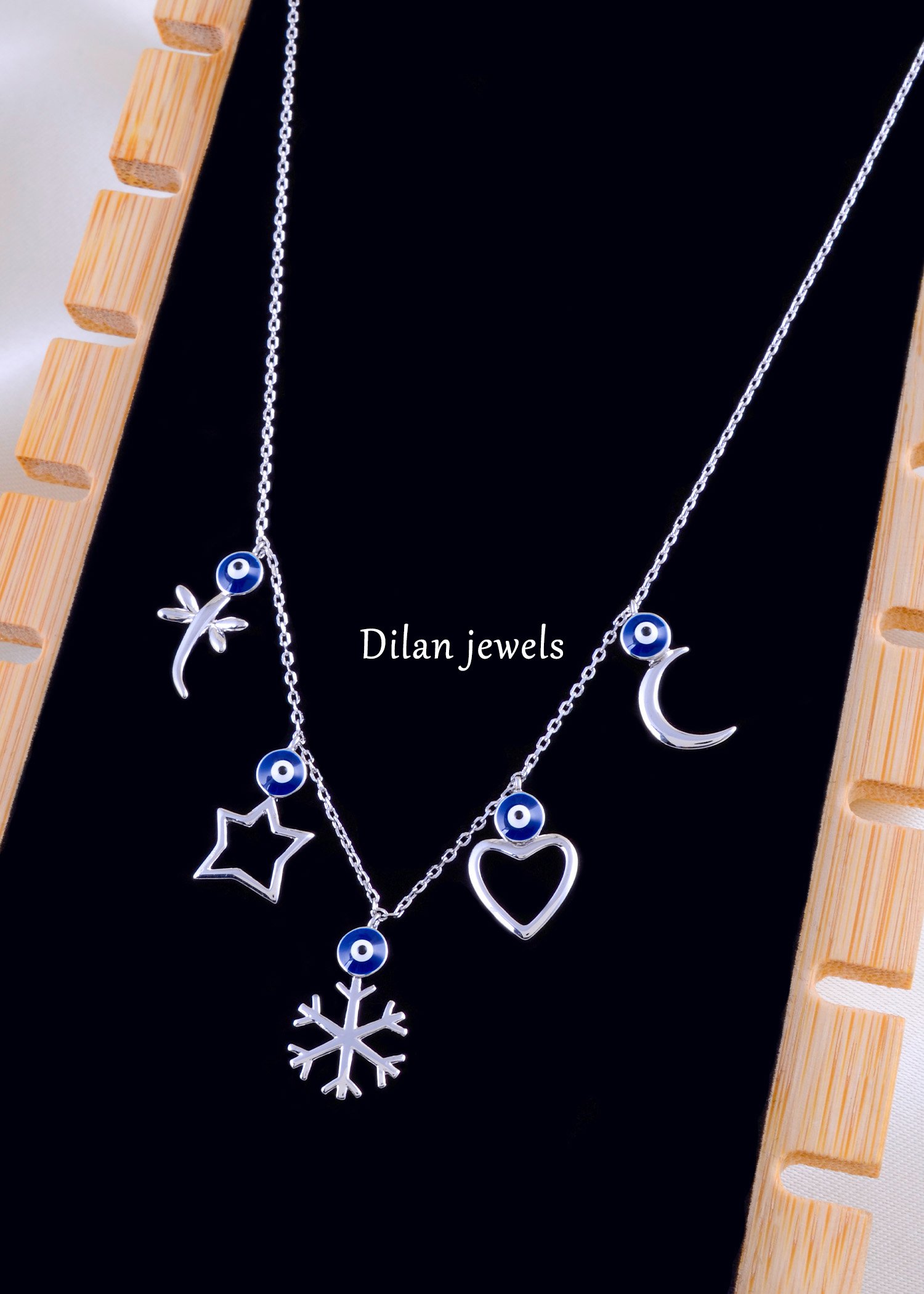 Ward off negativity in style with this enchanting Evil Eye Charm Necklace, crafted from premium German Silver. This delicate piece features a whimsical collection of silver dangling charms—including a crescent moon, open star, heart, snowflake, and dragonfly—each topped with a protective blue Evil Eye bead. The fusion of celestial and nature motifs creates a trendy, boho-chic aesthetic perfect for everyday wear. Lightweight and versatile, this necklace serves as both a fashionable accessory and a lucky talisman. It looks stunning worn alone or layered with other chains for a modern stacked look.