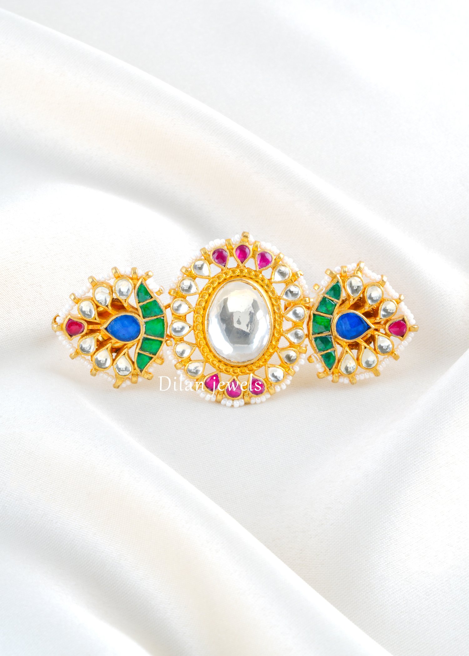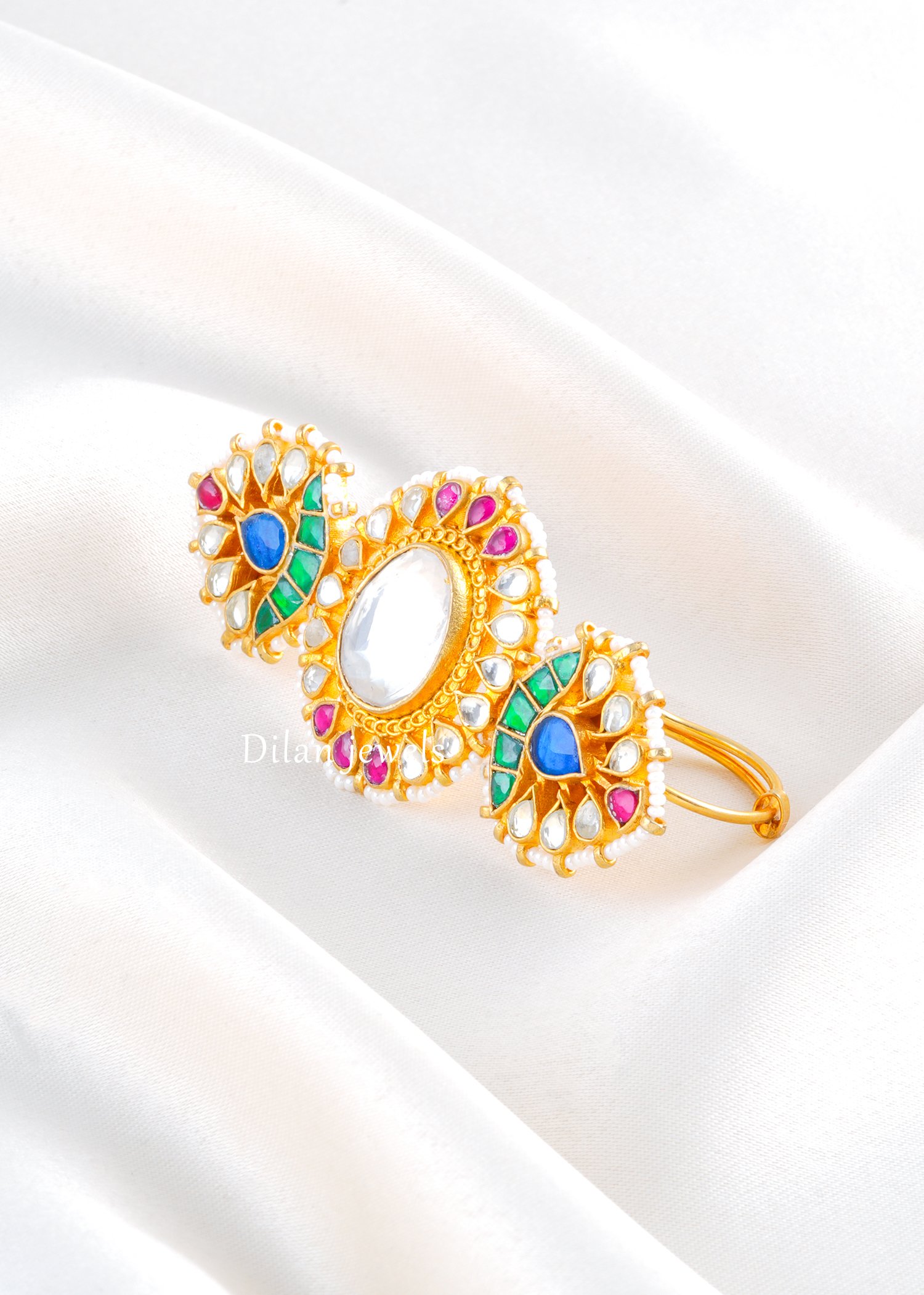 Celebrate timeless tradition with this stunning statement ring, crafted in high-quality German silver with a rich gold finish. The design features a bold central Kundan Polki stone, beautifully surrounded by intricate detailing and accented with vibrant coloured stones in royal blue, emerald green, and ruby pink tones. Delicate pearl beading enhances its regal appeal, giving it a classic heritage touch. Perfect for weddings, festive occasions, and ethnic celebrations, this adjustable ring offers both comfort and grandeur. A true masterpiece that adds colour, elegance, and royal charm to any traditional ensemble.