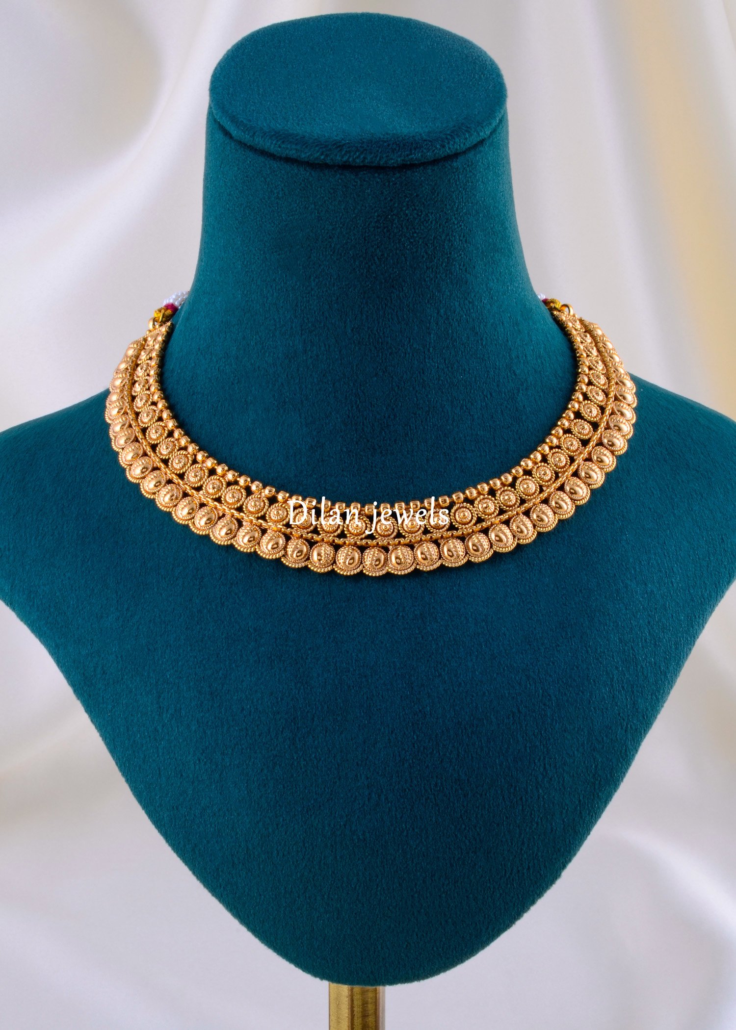 This exquisite necklace set from Dilan Jewels is crafted in premium German silver with a rich antique gold finish, capturing the timeless charm of traditional temple jewelry. The intricate beadwork and the classic motif pendant with a hint of ruby stone detailing exude heritage elegance. Perfect for festive occasions, weddings, or cultural events, this piece adds a royal touch to any ethnic outfit. Lightweight yet grand in design, it’s a true symbol of grace and tradition brought to life through fine craftsmanship.