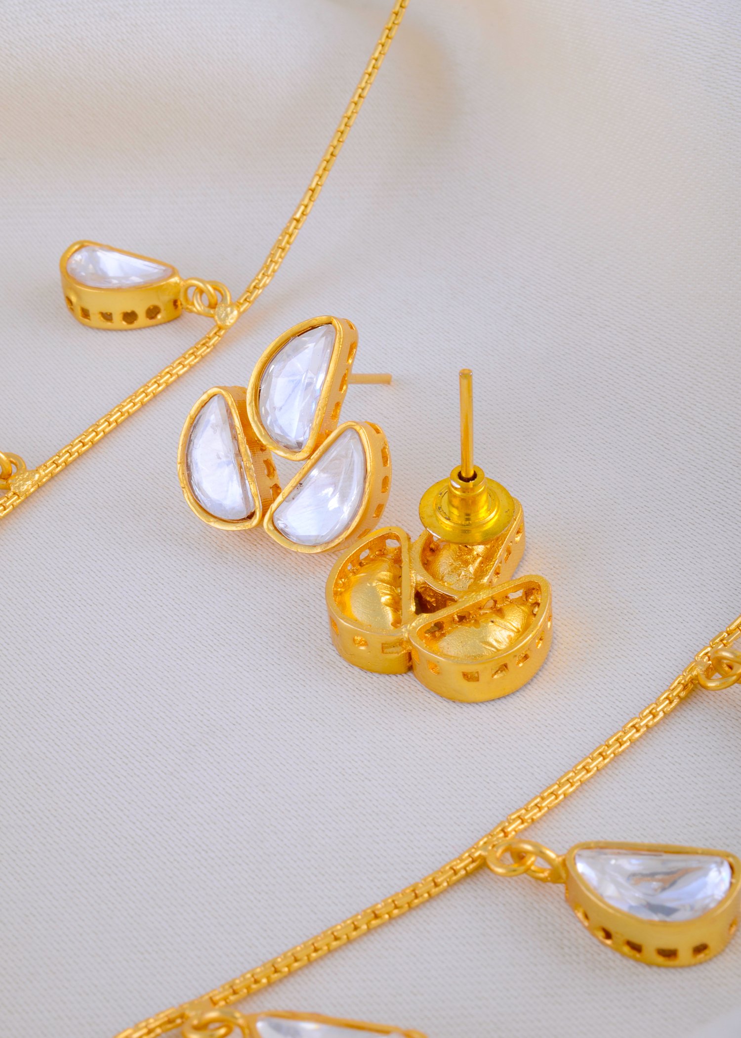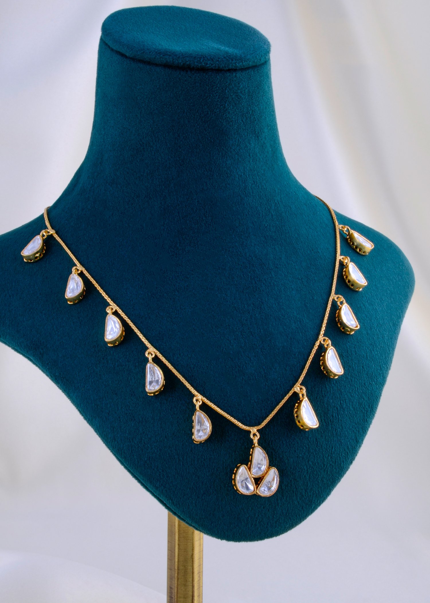 This elegant necklace set, crafted in premium German Silver, showcases the timeless beauty of Kundan Polki work. Designed with delicate teardrop motifs, each stone radiates a soft brilliance, capturing the essence of traditional artistry with a modern touch. The lightweight design makes it perfect for both festive occasions and everyday elegance, while the matching earrings complete the look with subtle grace. Finished in a golden hue for added richness, this necklace set reflects a fine blend of heritage craftsmanship and versatile styling. A treasure to cherish for years.