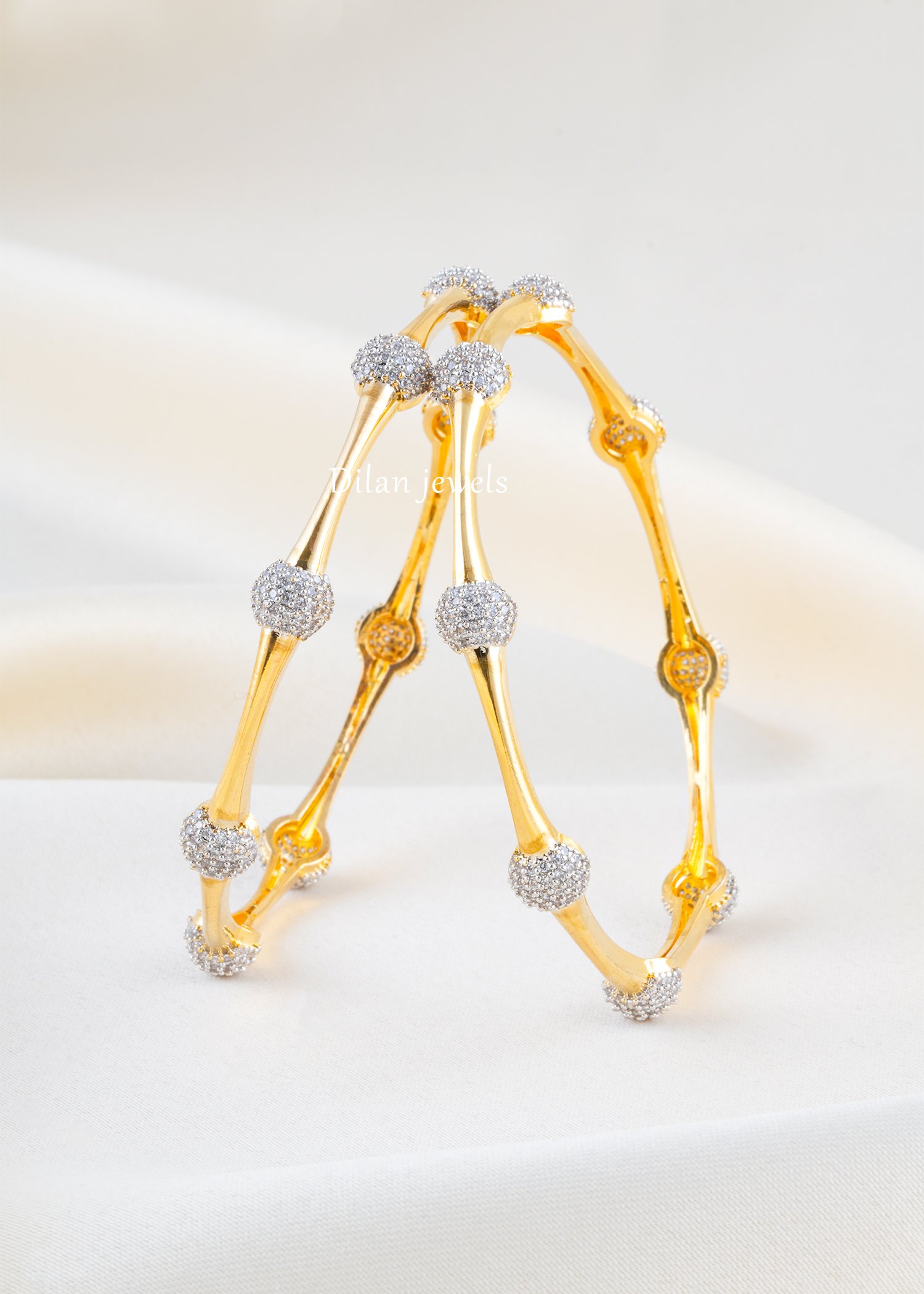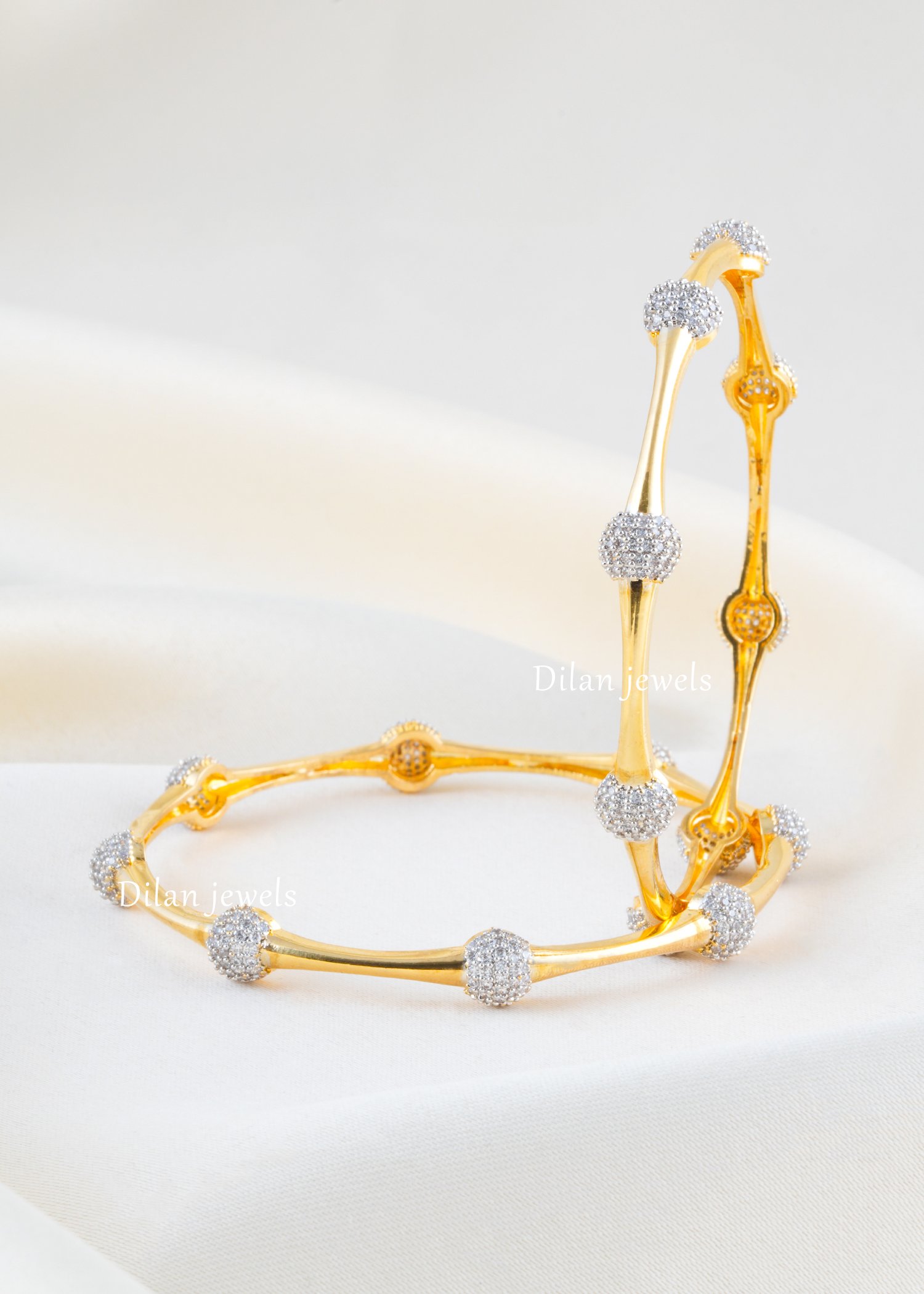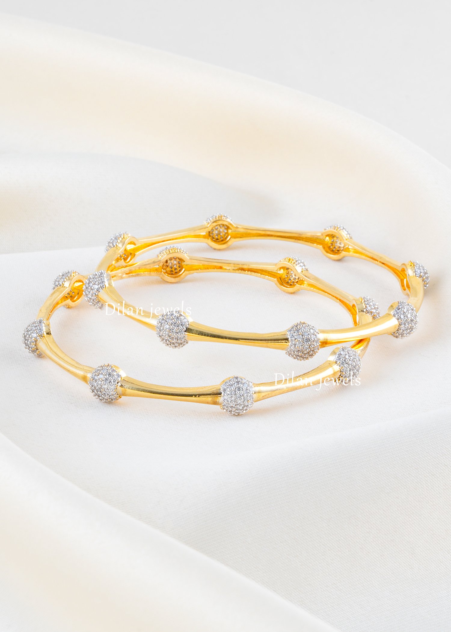 Add timeless elegance to your jewelry collection with this beautifully crafted bracelet, made in premium German silver and adorned with AAA quality diamonds. Designed with a sleek gold-tone finish and highlighted by shimmering studded sphere accents, this piece offers a perfect balance of minimal charm and festive sparkle. Its refined silhouette makes it ideal for everyday elegance, parties, festive occasions, and special gatherings. Lightweight, stylish, and easy to pair with both ethnic and modern outfits, this bracelet is a graceful statement piece for every jewelry lover.