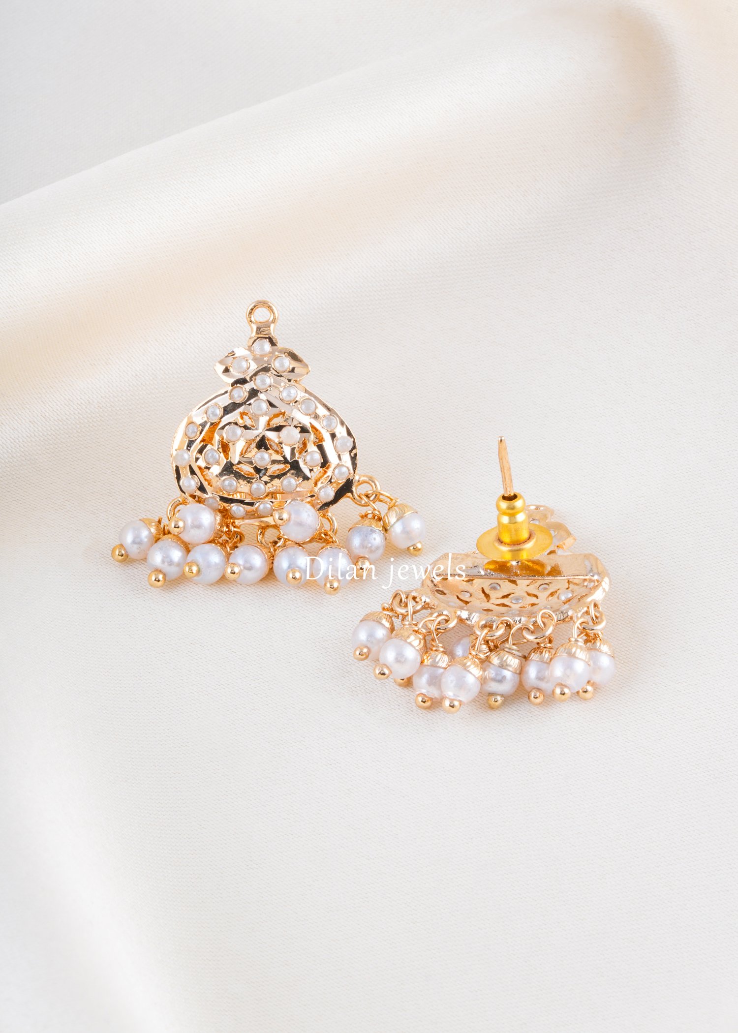 Elevate your jewelry collection with this exquisite German silver pendant set featuring lustrous freshwater pearls and intricate floral filigree craftsmanship. The design showcases beautifully sculpted dome-shaped pendants adorned with elaborate three-dimensional lattice work and sparkling cubic zirconia embellishments. Gracefully cascading pearl drops create a mesmerizing waterfall effect, adding elegance and movement. The refined multi-layered pattern demonstrates masterful metalwork artistry. This versatile set blends traditional Indian aesthetic with contemporary sophistication, making it ideal for festive celebrations, weddings, and formal occasions. The durable German silver construction ensures lasting beauty and wearability.
