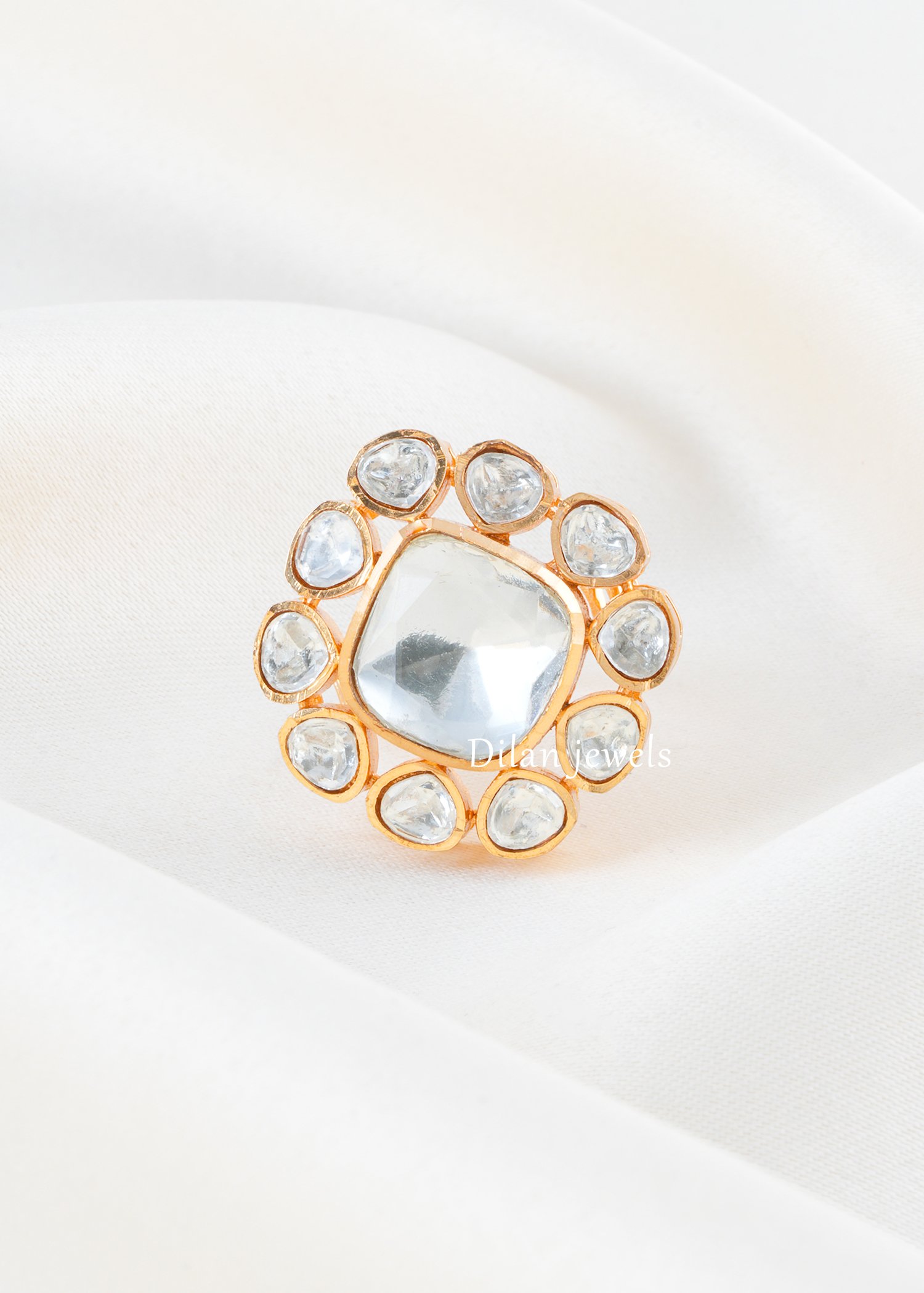 Add a regal touch to your festive look with this German silver ring, crafted in a rich gold-tone finish and adorned with classic Kundan Polki styling. The design features a bold, cushion-shaped centerpiece surrounded by a halo of polki stones, creating a beautiful floral-sunburst effect that catches light from every angle. With detailed craftsmanship on the band and a comfortable fit, it’s perfect for weddings, sangeet, mehendi, and traditional celebrations. Pair it with kundan sets or ethnic wear for instant elegance.