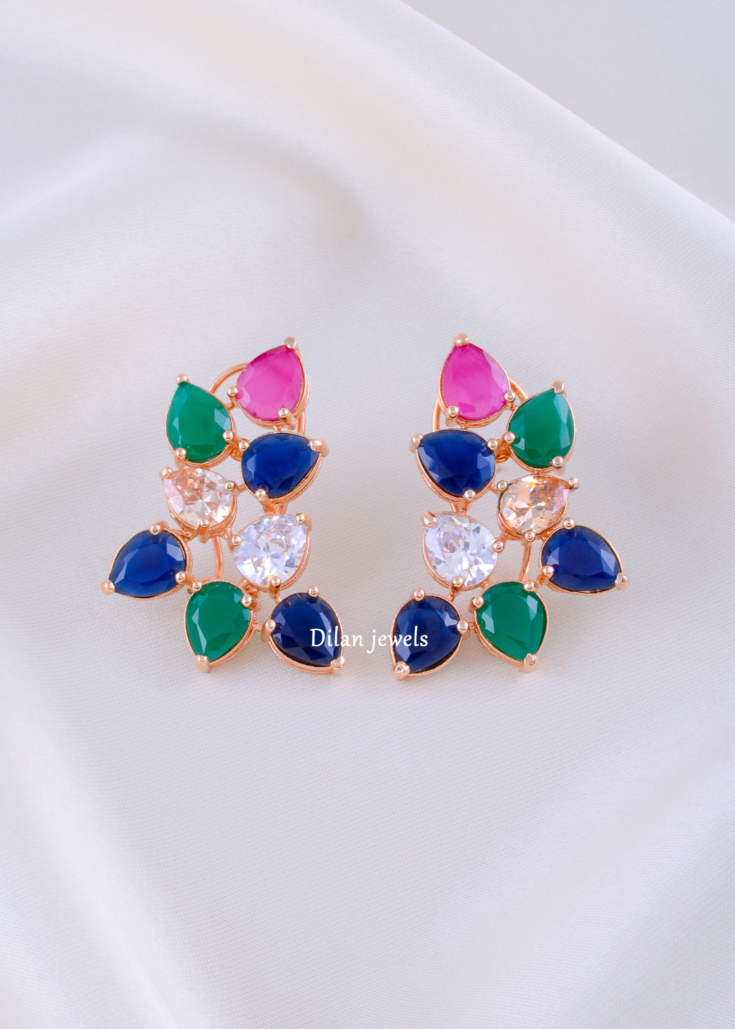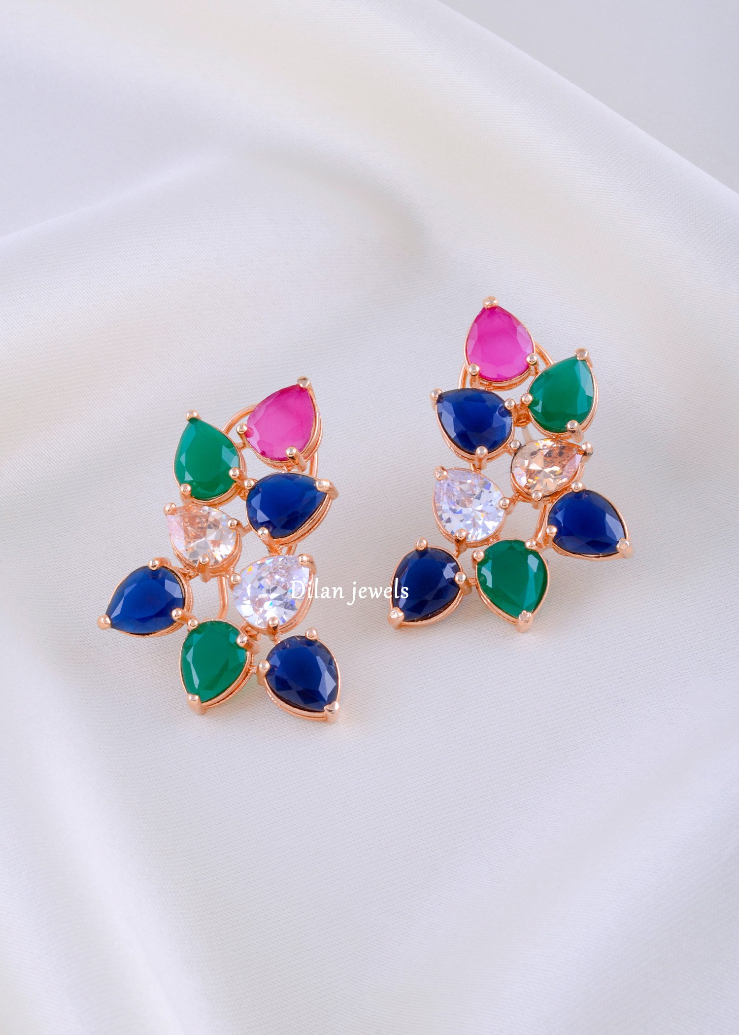 These vibrant German silver earrings feature a stunning arrangement of multicolour stones paired with AAA-quality American diamonds for a brilliant, eye-catching finish. The elegant teardrop gemstones in pink, green, blue, and clear tones create a stylish fusion of colours, making these earrings perfect for festive, party, and everyday premium wear. Lightweight yet luxurious, they offer a modern, chic look that stands out effortlessly. Crafted with fine detailing and a glossy finish, these earrings add a refreshing pop of colour to any outfit, enhancing your style with elegance and charm.