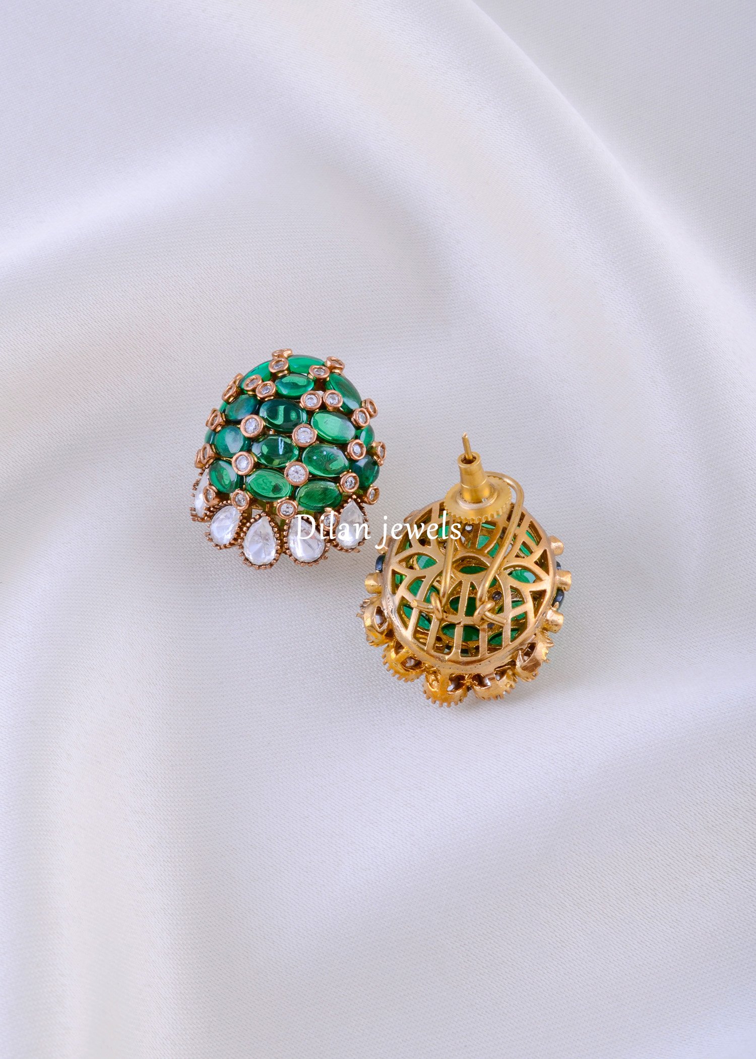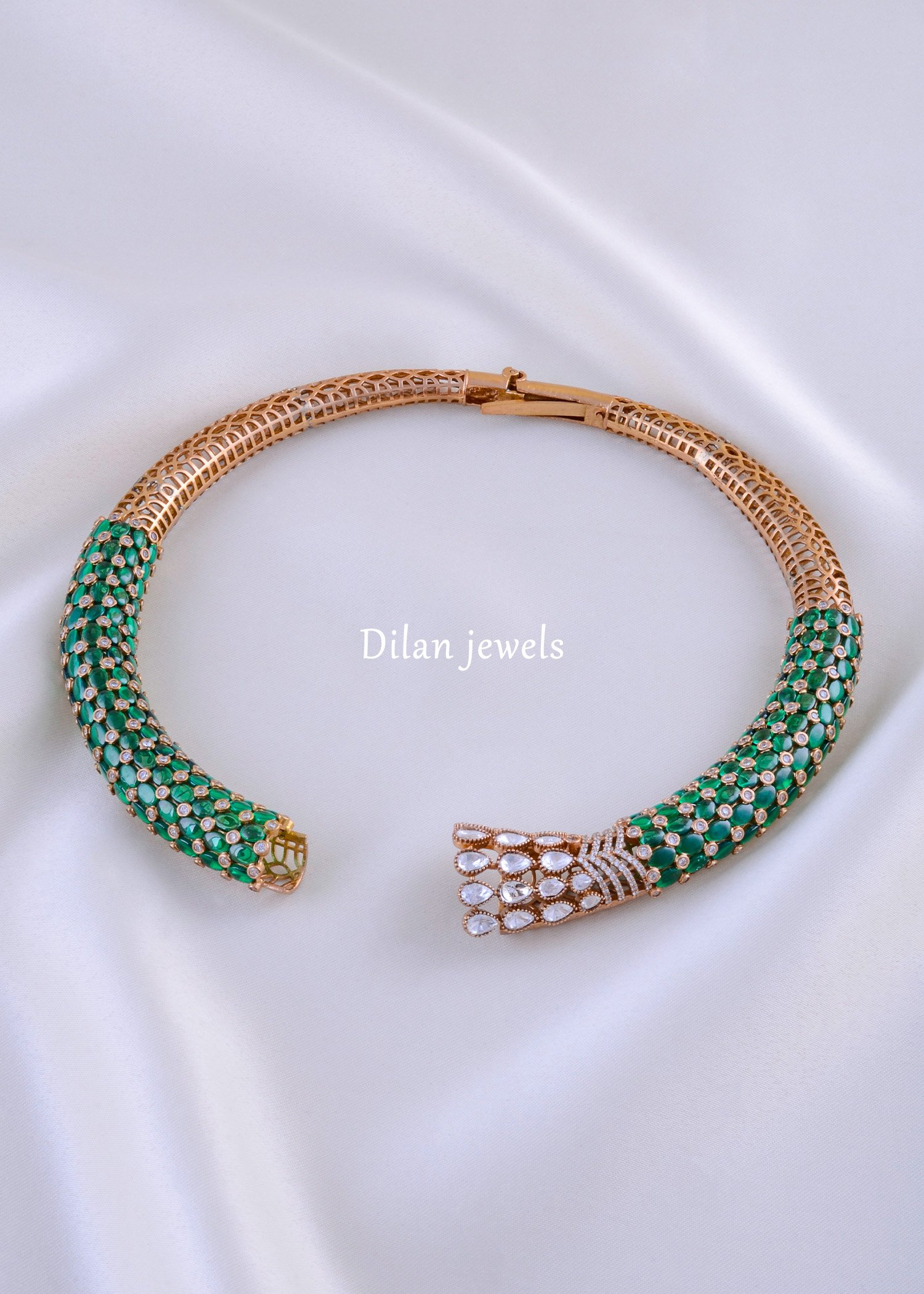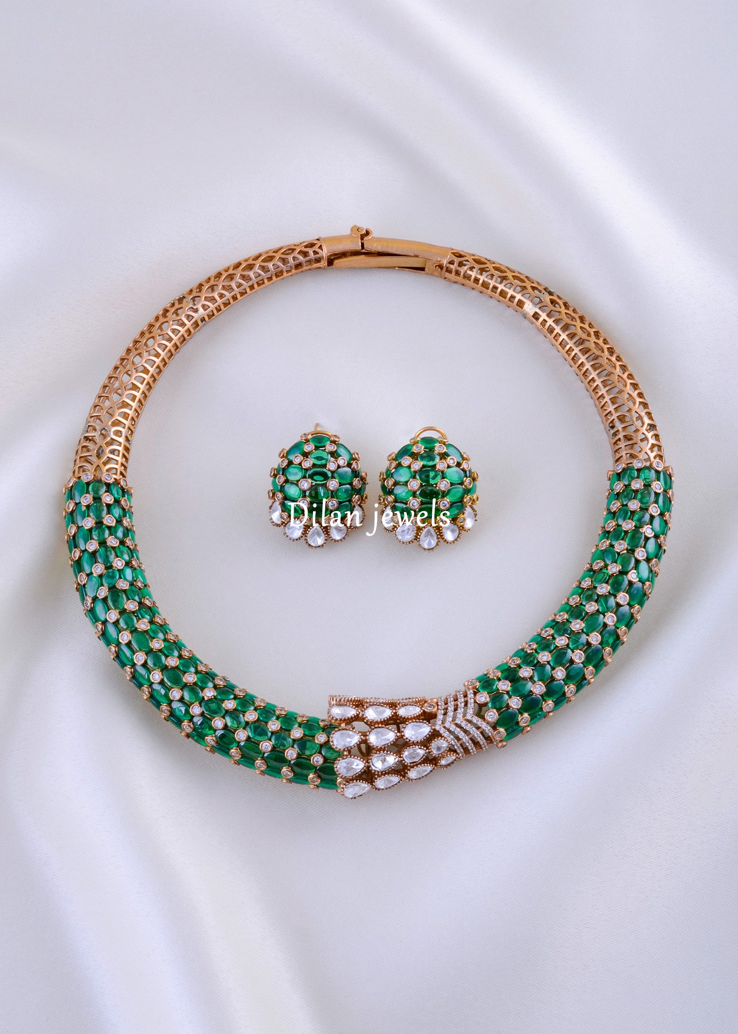 An epitome of timeless grandeur, this Hasli necklace set by Dilan Jewels is crafted in premium German silver with a luxurious Victorian finish. Adorned with vibrant color stones, kundan polki, and AAA quality American diamonds, it radiates regal charm and contemporary elegance. The intricate craftsmanship and striking emerald tones make it a perfect statement piece for festive occasions, weddings, or grand celebrations. Designed to blend tradition with sophistication, this exquisite set redefines modern royal allure.