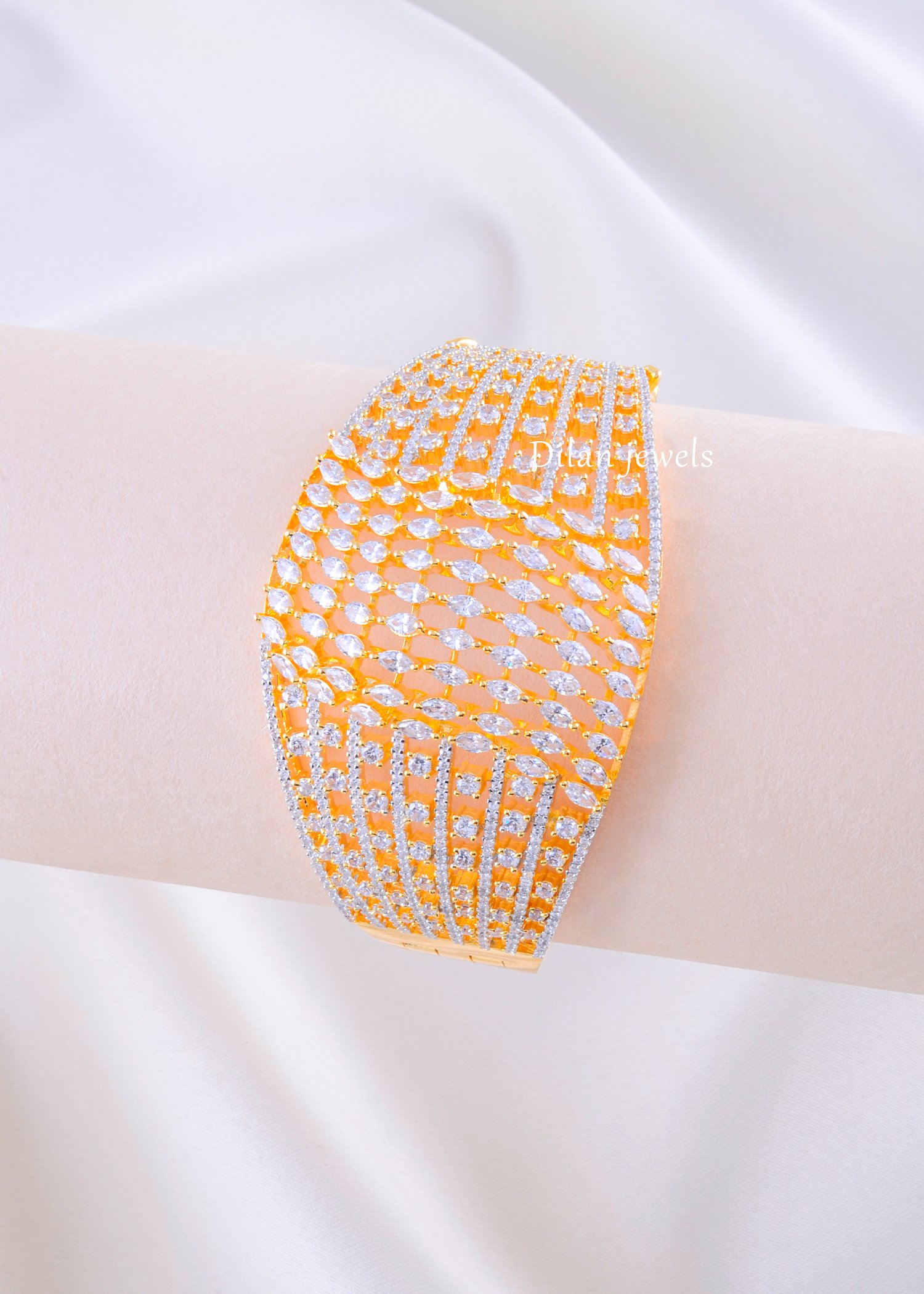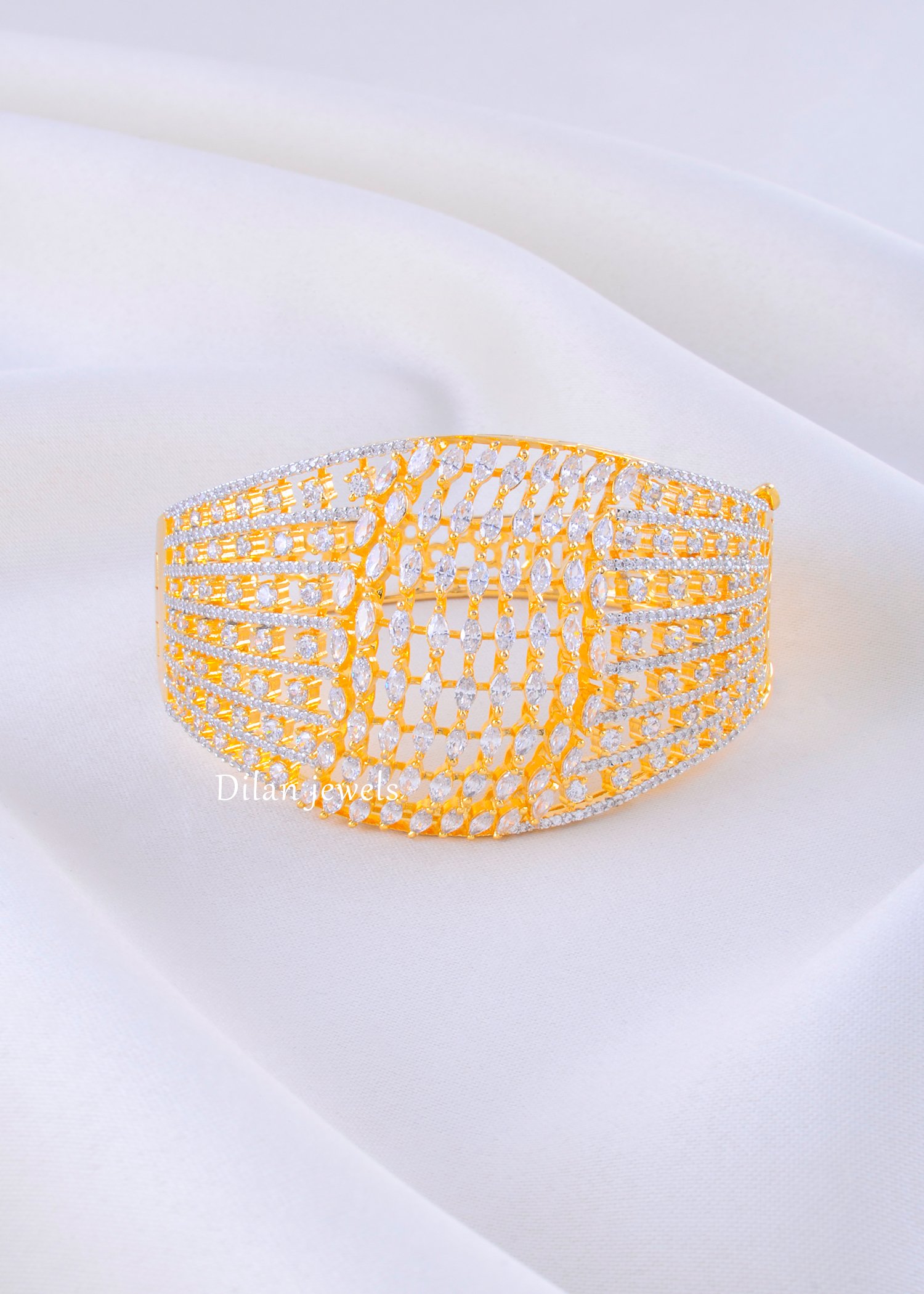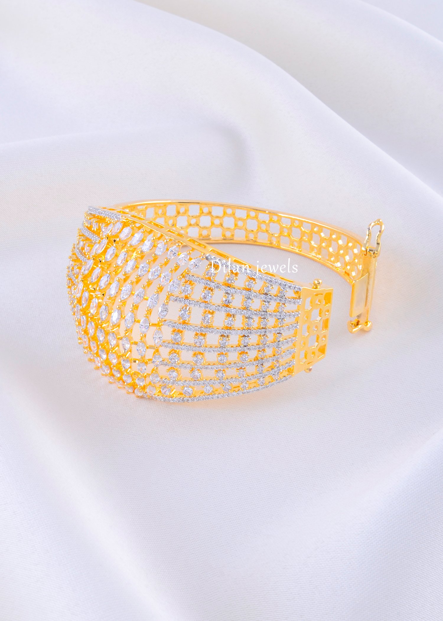Radiate timeless sophistication with this stunning diamond bracelet, expertly crafted from premium German Silver with a luxurious gold plating. The bracelet features an elegant wide cuff design adorned with intricate lattice metalwork embellished with hundreds of brilliant AAA-quality American Diamond stones arranged in a mesmerizing geometric pattern. The pave-set diamonds create a dazzling sparkle that catches light from every angle, making it a show-stopping piece. The secure clasp ensures comfortable wear throughout the day. Perfect for weddings, formal occasions, festive celebrations, and special events, this glamorous bracelet elevates any look. The complete design delivers affordable luxury with undeniable sophistication and contemporary elegance.