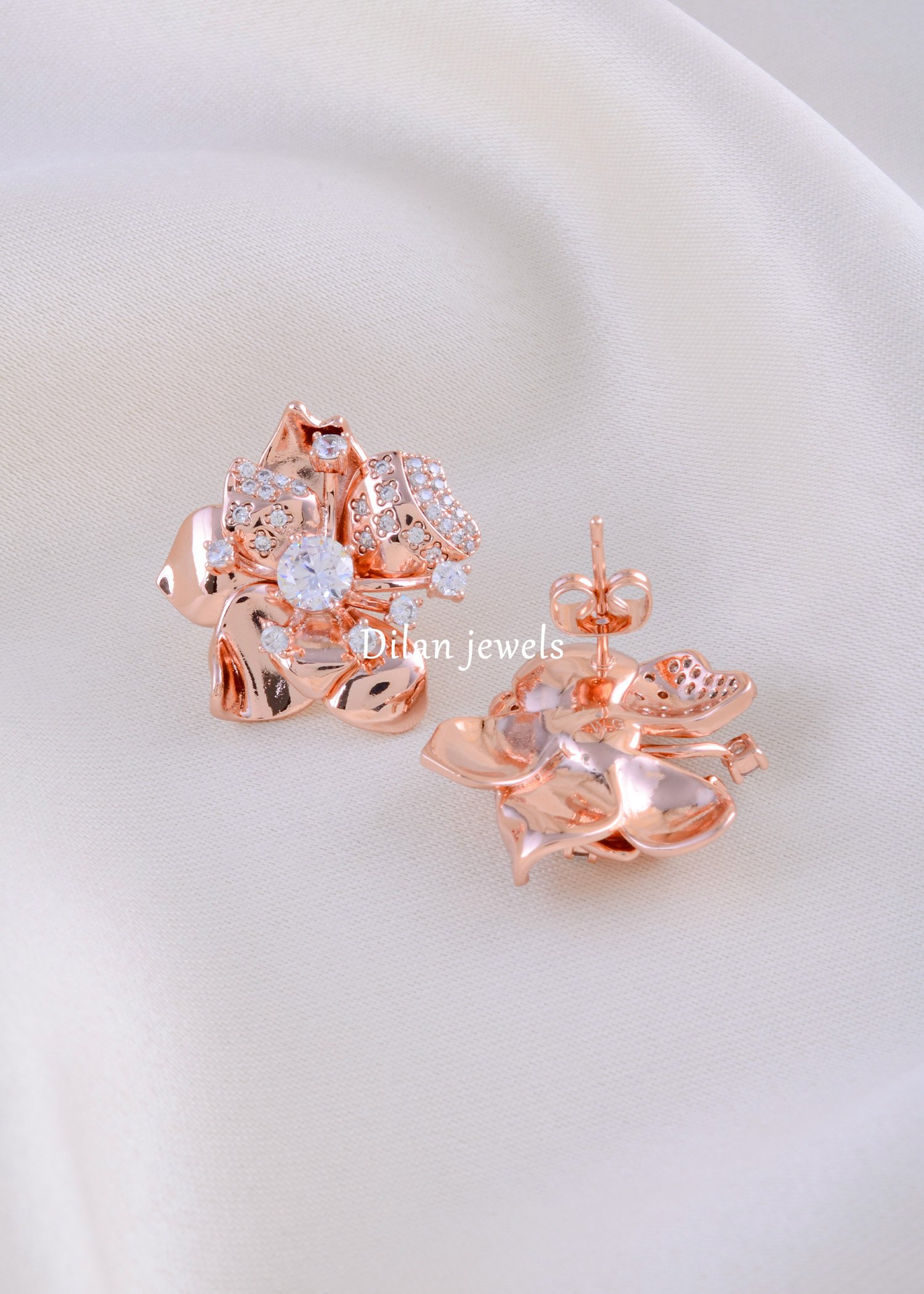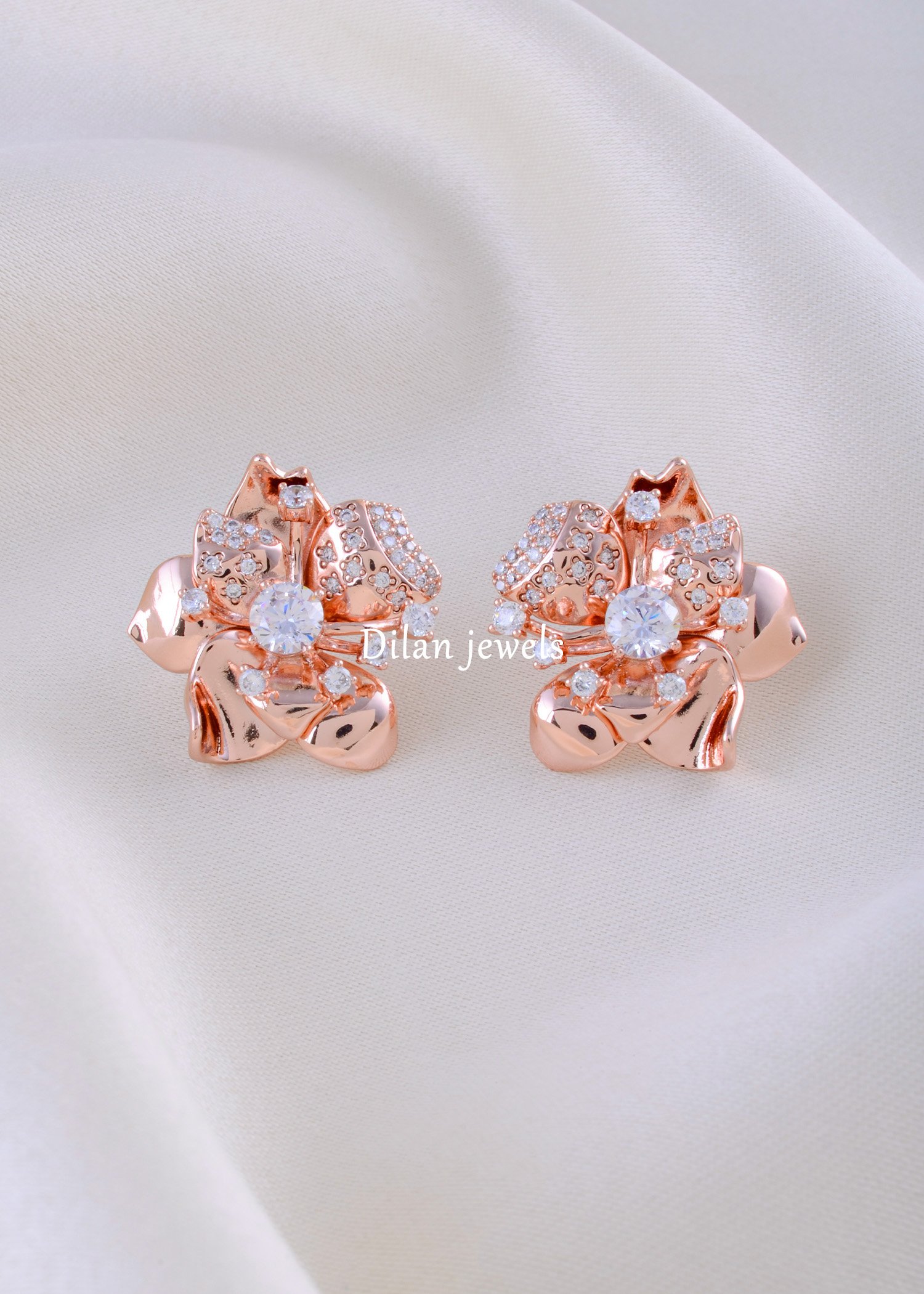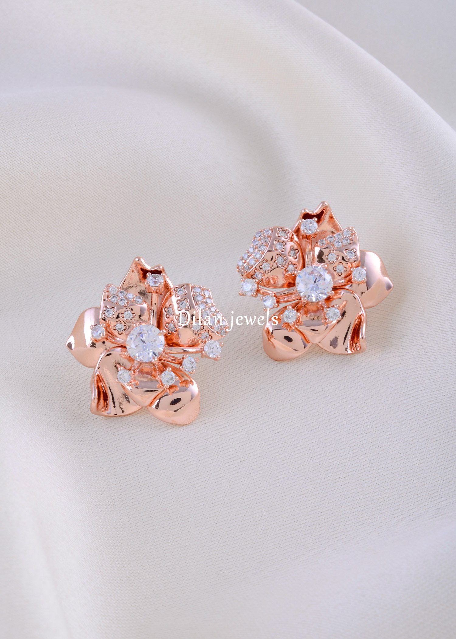 These exquisite earrings from Dilan Jewels are crafted in premium German silver and adorned with dazzling AAA-quality American diamonds. The elegant design radiates a luxurious brilliance, perfectly blending sophistication with modern style. Lightweight yet striking, these earrings elevate any outfit—from festive ensembles to evening wear—with effortless grace. The shimmering diamonds and rose gold detailing make them a timeless addition to your jewelry collection, reflecting unmatched craftsmanship and elegance.