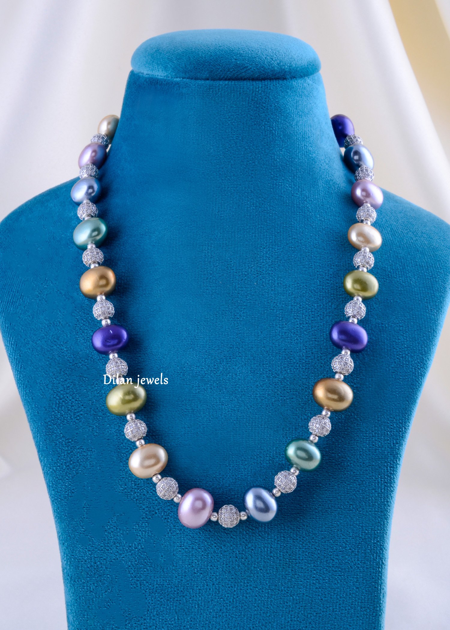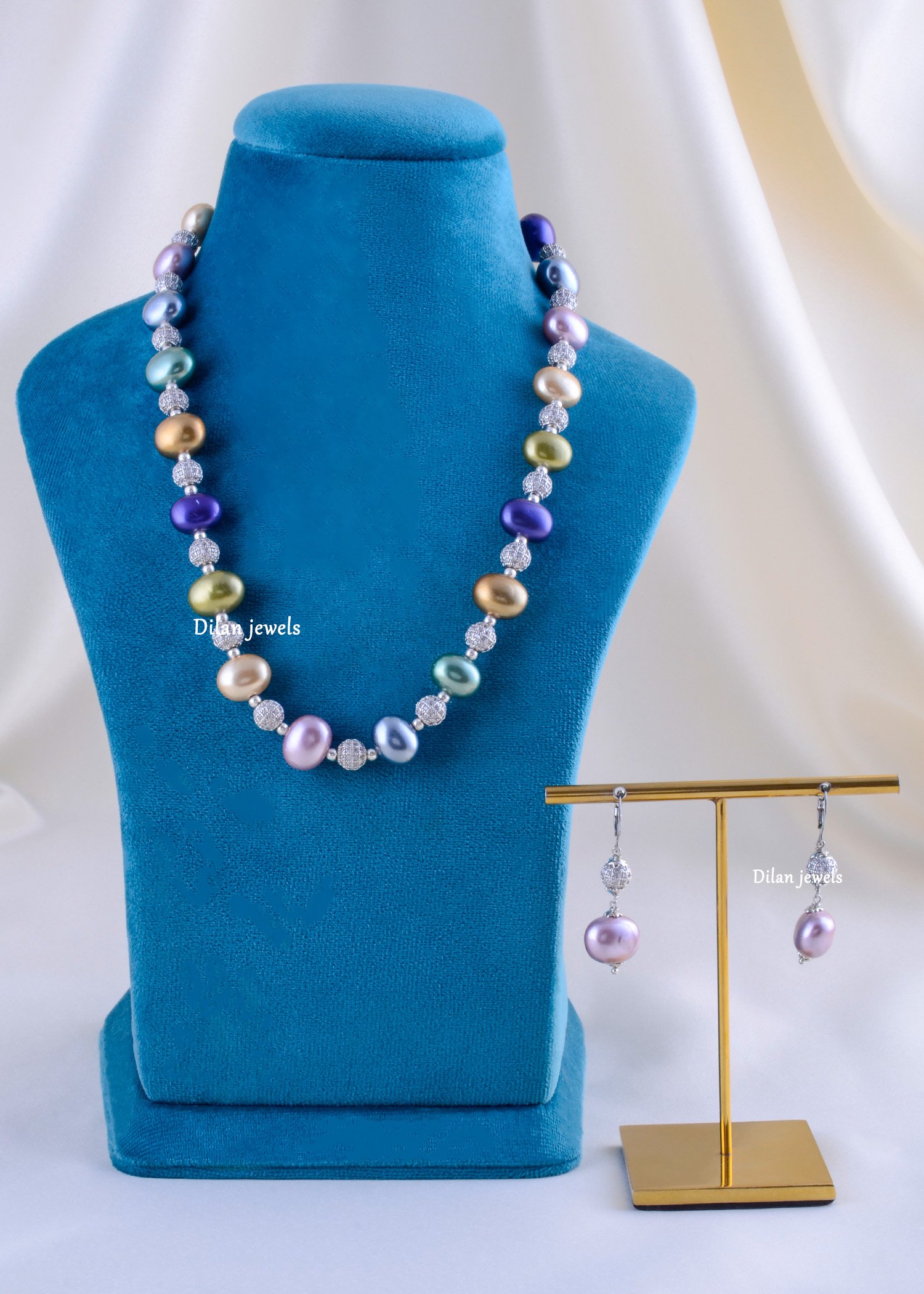 Add a splash of sophisticated color to your wardrobe with this stunning Multi-Color Baroque Pearl Necklace Set. The necklace features lustrous, organic-shaped pearls in a mesmerizing metallic palette of gold, deep purple, teal, and soft lavender. Each pearl is punctuated by a dazzling crystal-encrusted silver spacer, adding a modern shimmer to the classic pearl aesthetic. The set is completed with a pair of elegant lilac pearl drop earrings, suspended from comfortable lever-back hooks. Perfect for elevating a simple white shirt or complementing a cocktail dress, this set offers a unique blend of modern luxury and timeless charm.