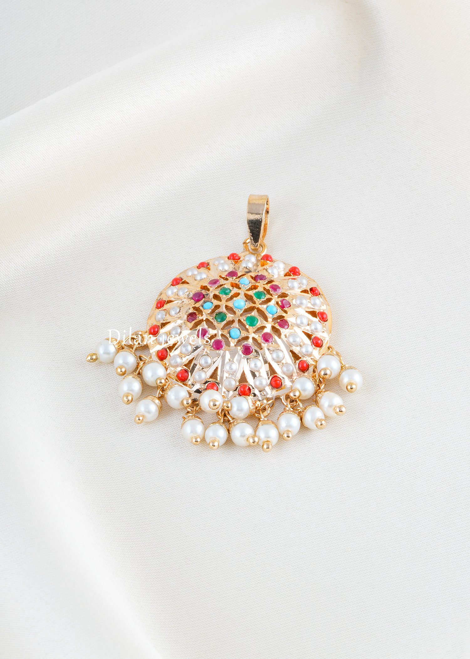 Radiate elegance with this stunning German silver pendant set featuring luminous freshwater pearls and shimmering multi-colored gemstone accents. The design showcases an intricate filigree pattern with vibrant stones in ruby, emerald, turquoise, and crystal tones, creating a mesmerizing visual appeal. Each pendant is complemented by gracefully cascading pearl drops that add sophisticated movement and dimension. The ornamental lattice work displays masterful craftsmanship blending traditional and contemporary aesthetics. Ideal for festive celebrations, weddings, and special occasions. This versatile jewelry piece elevates any ethnic or formal ensemble with timeless grace and radiant charm.
