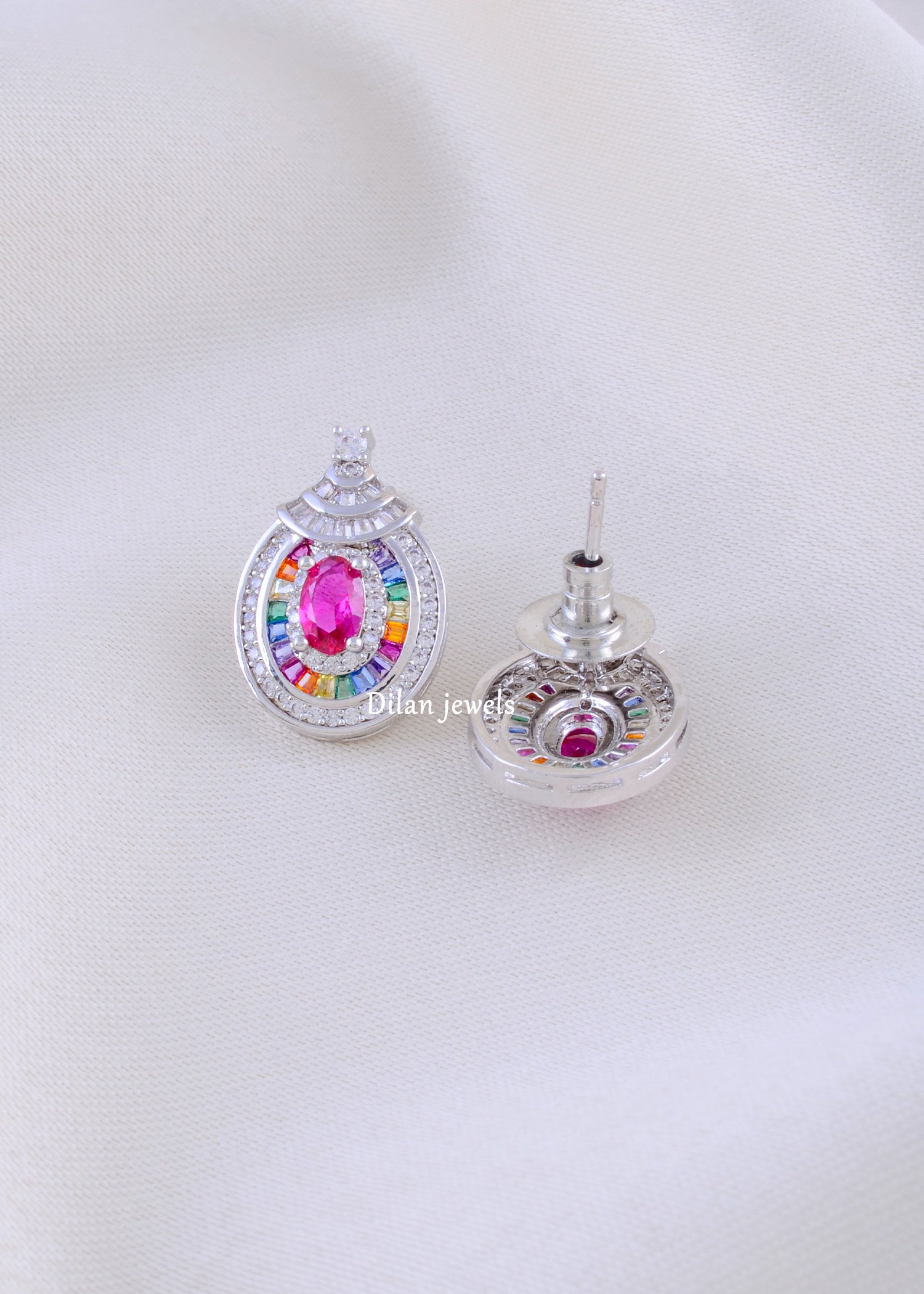 These stunning German silver earrings feature a vibrant fusion of rainbow baguette stones paired with a striking hot pink centerpiece. Surrounded by sparkling AAA-quality American Diamonds, the design radiates brilliance and color from every angle. The layered arch detailing on top adds an elegant touch, making this pair perfect for festive wear, parties, or statement styling. Lightweight yet premium in finish, these earrings beautifully blend modern glamour with traditional artistry, offering a unique and eye-catching accessory for any occasion.