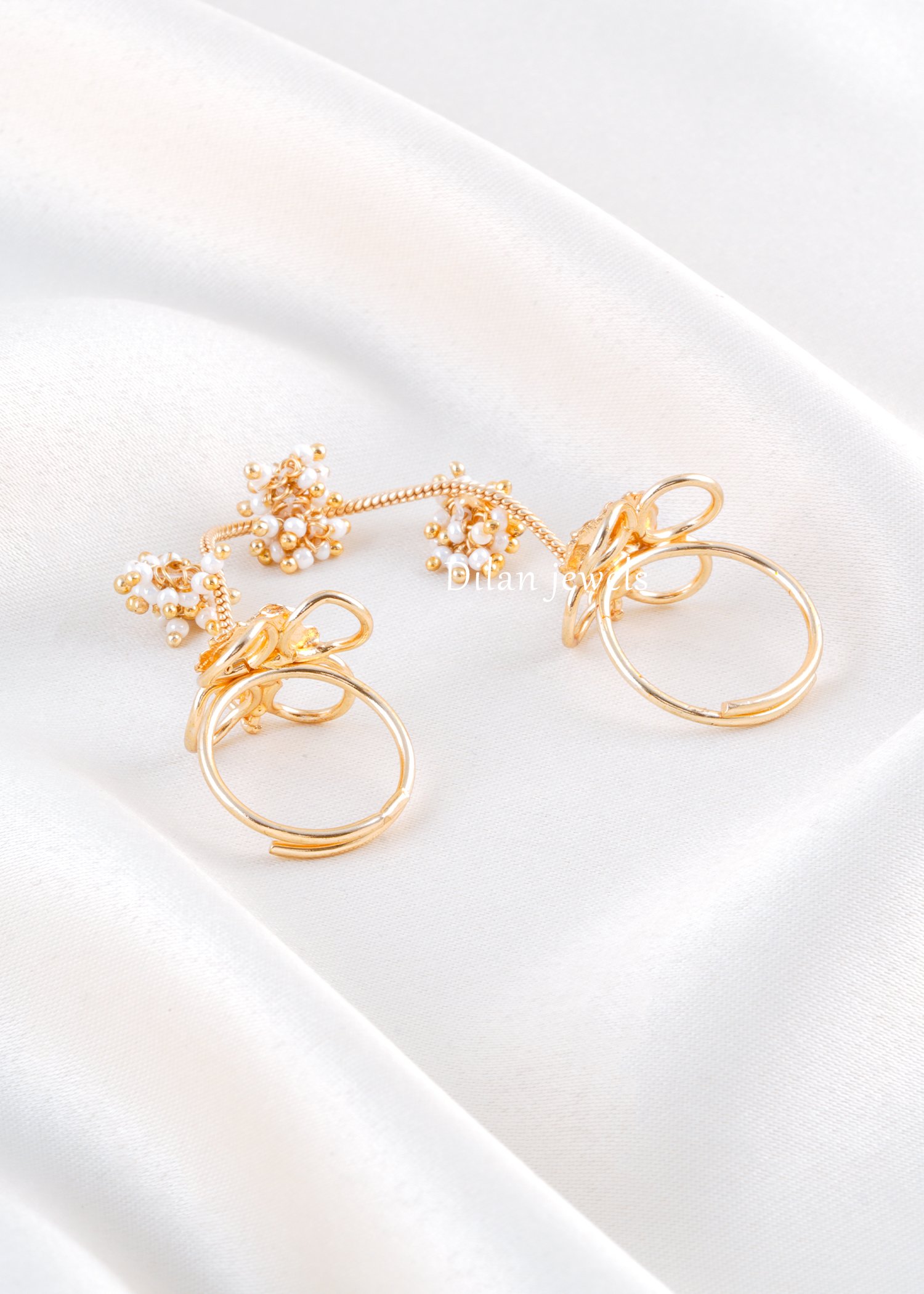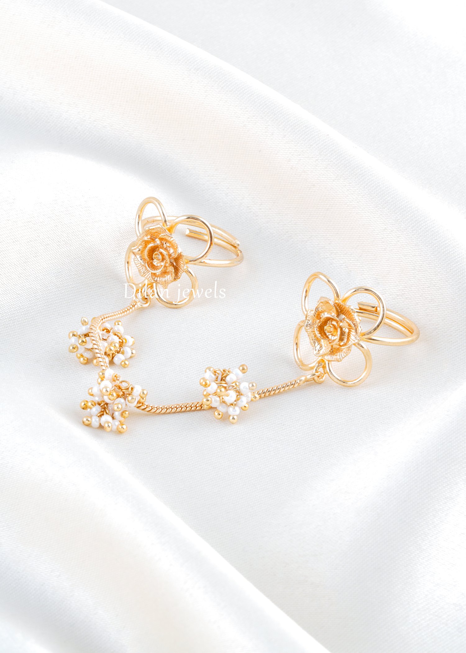 Delicate yet distinctive, this beautifully crafted double ring is made in premium German silver with a rich gold finish. Designed with intricate floral motifs, the rings are connected by a graceful chain adorned with tiny pearl clusters, adding movement and charm to the piece. The subtle Kundan detailing enhances its traditional appeal, making it perfect for festive occasions, weddings, and ethnic celebrations. Lightweight and comfortable to wear, this unique hand harness style ring adds a royal and feminine touch to your overall look. A timeless accessory that blends tradition with contemporary elegance.
