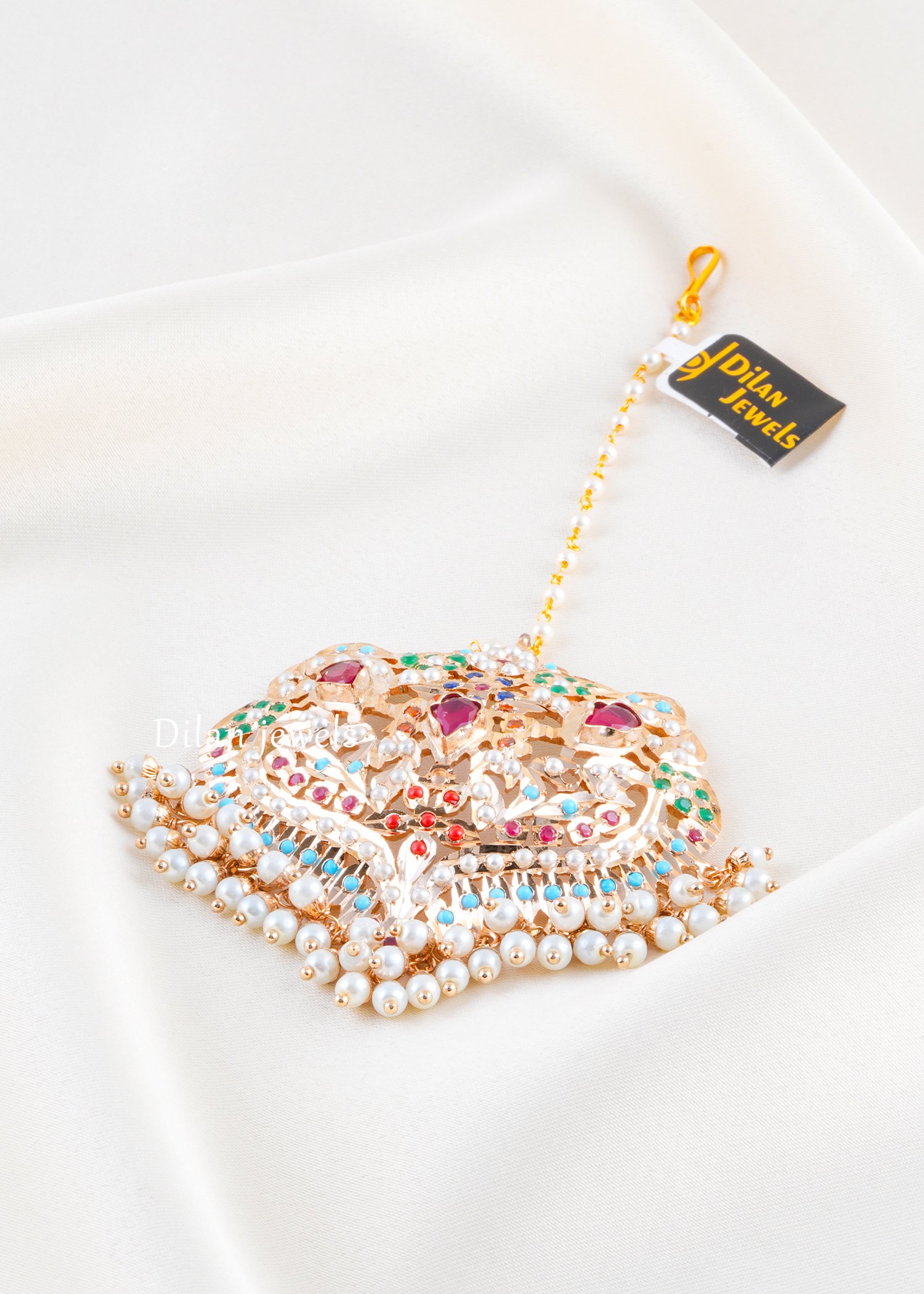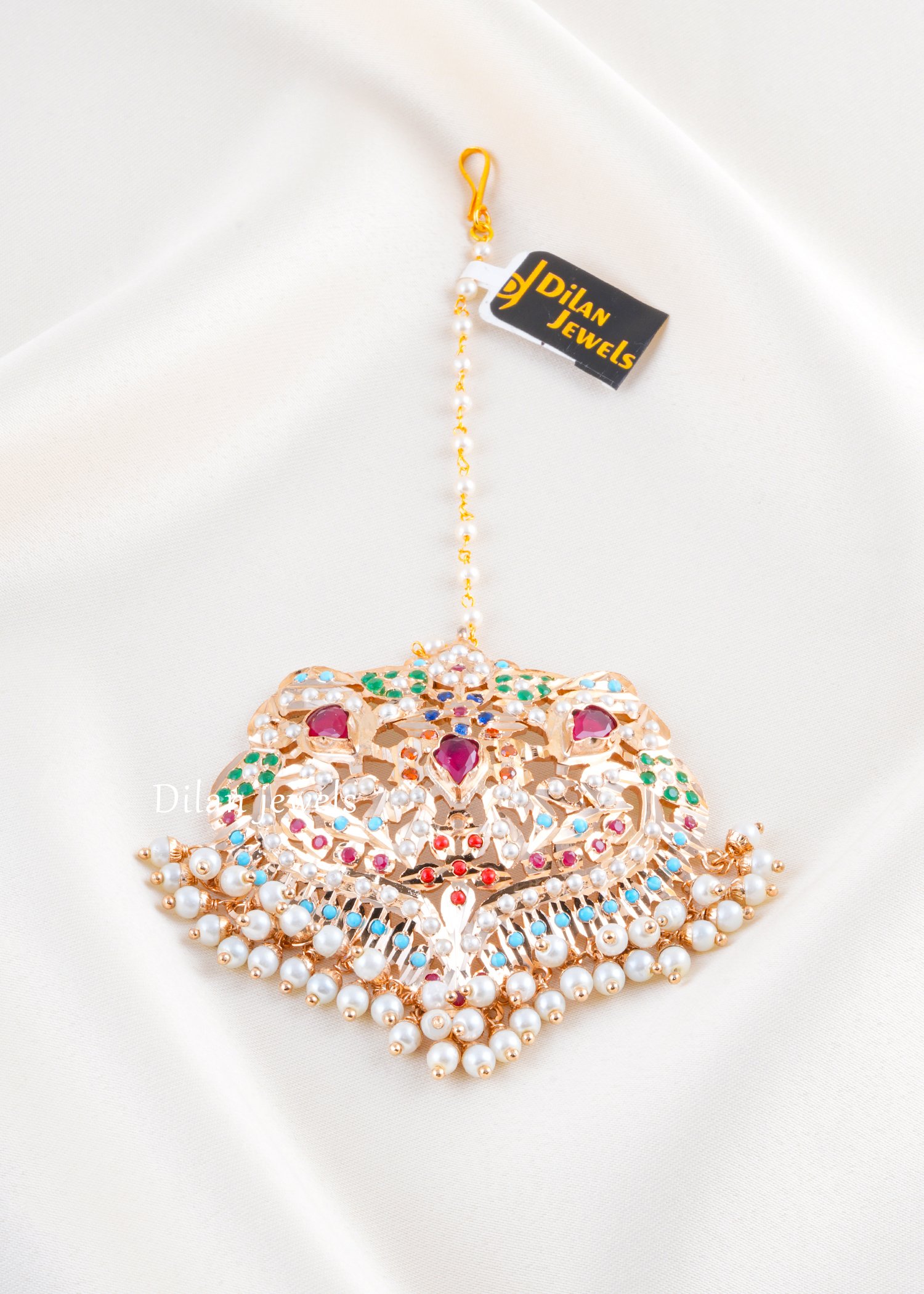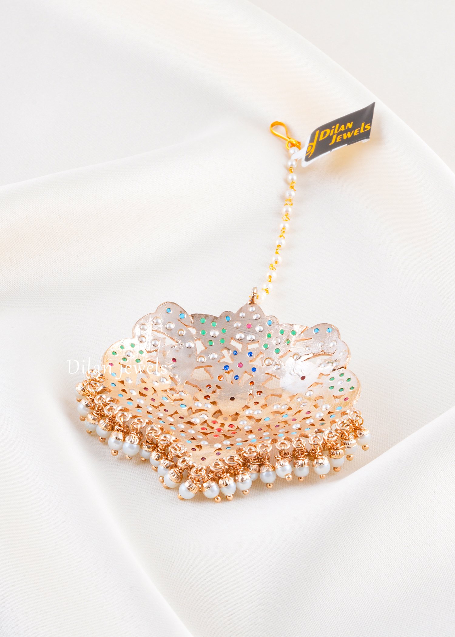 Add a regal finishing touch to your ethnic look with this beautifully crafted mang tikka, made in premium German silver and adorned with elegant pearl detailing. Designed with intricate traditional patterns, vibrant stone accents, and a graceful pearl drop fringe, this piece brings together heritage charm and festive sophistication. Its rich finish and detailed craftsmanship make it perfect for weddings, festivals, sangeet nights, and bridal styling. Lightweight yet statement-making, this mang tikka is ideal for anyone who loves timeless jewelry with a grand, graceful appeal.