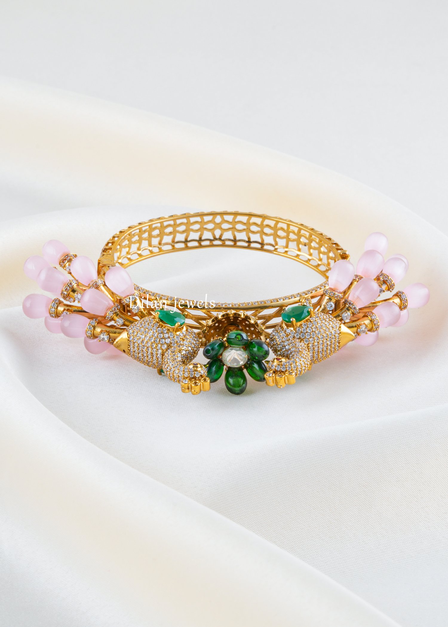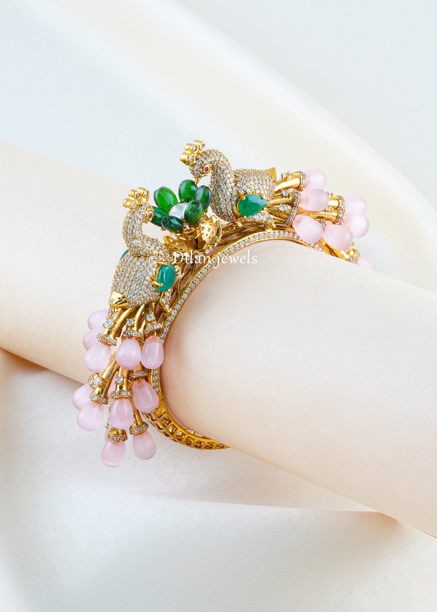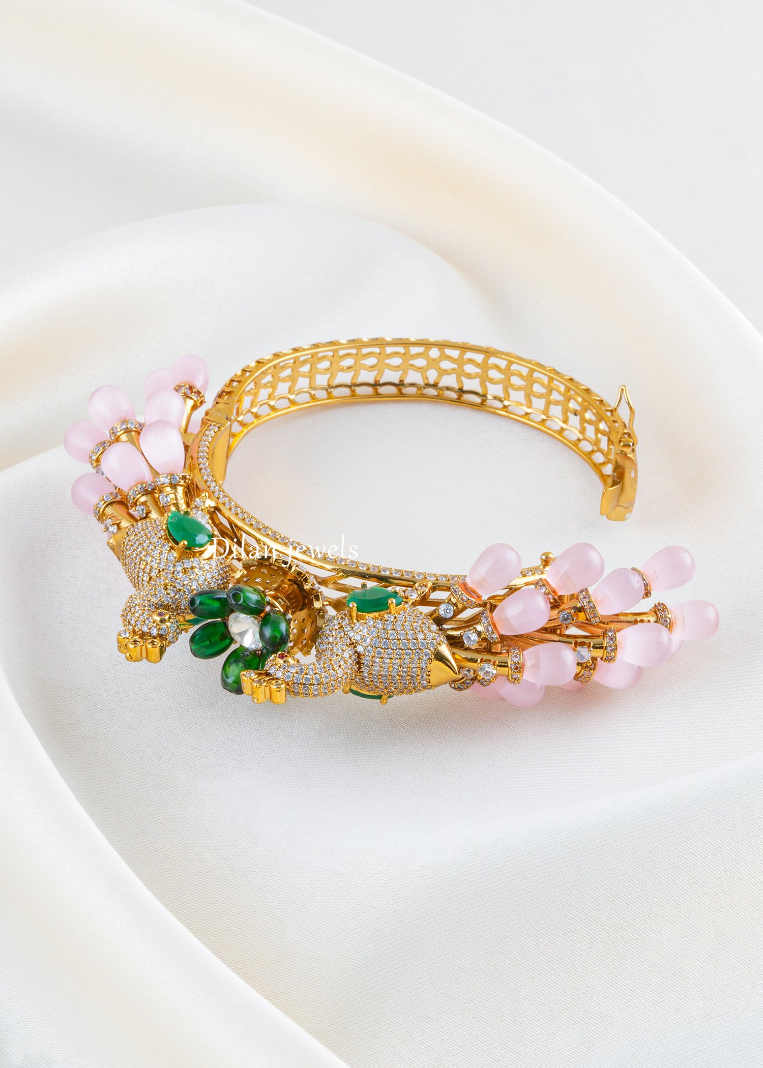 Make a striking style statement with this intricately crafted bracelet, made in premium German silver and embellished with AAA quality diamonds. Designed with two graceful peacock motifs, soft pink drop accents, and rich green stone detailing, this bracelet beautifully blends royal charm with artistic elegance. The sparkling finish and detailed craftsmanship give it a festive, luxurious appeal, making it ideal for weddings, parties, festive occasions, and special celebrations. Bold yet graceful, this bracelet is perfect for those who love standout jewelry with a traditional-inspired designer touch.
