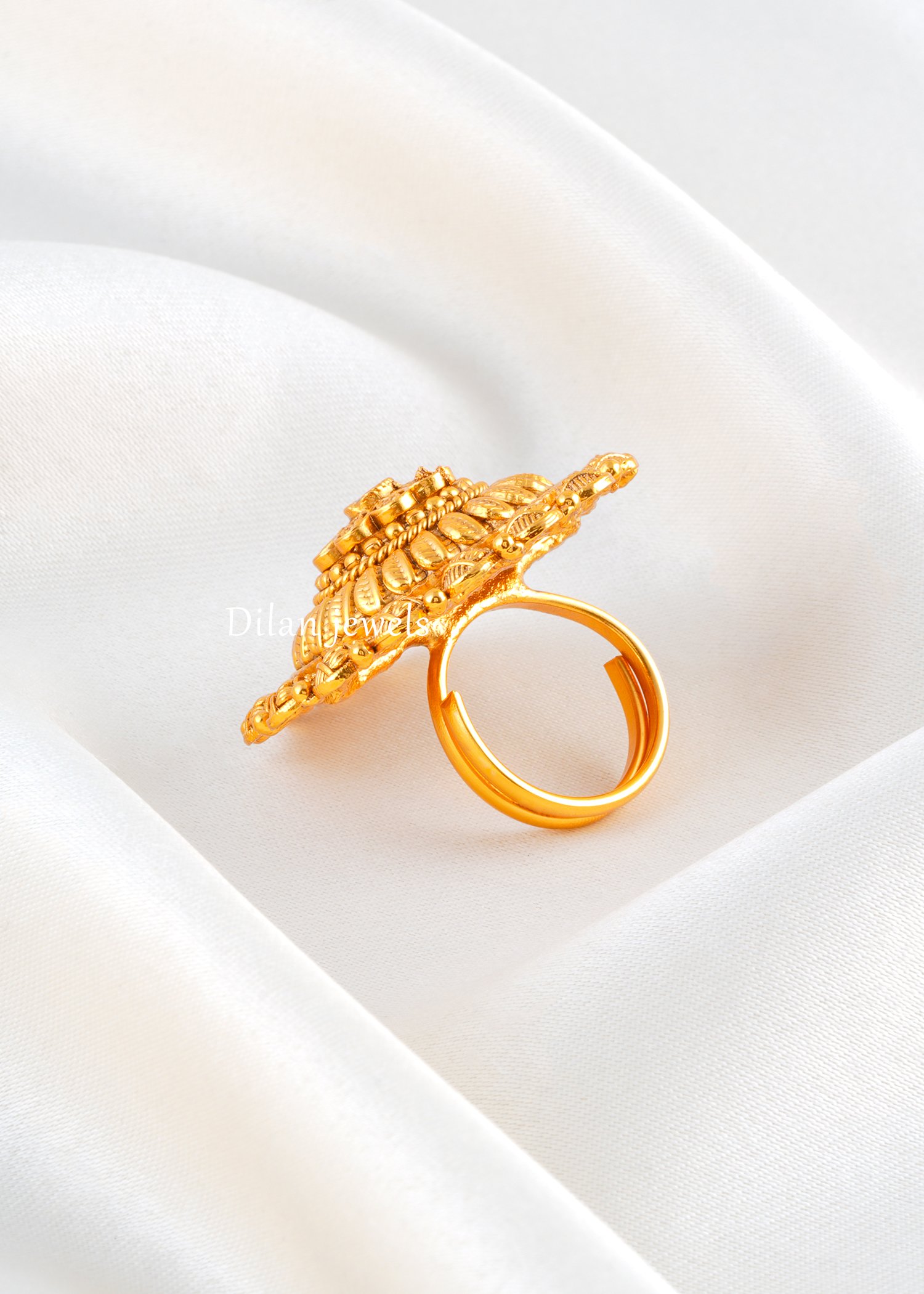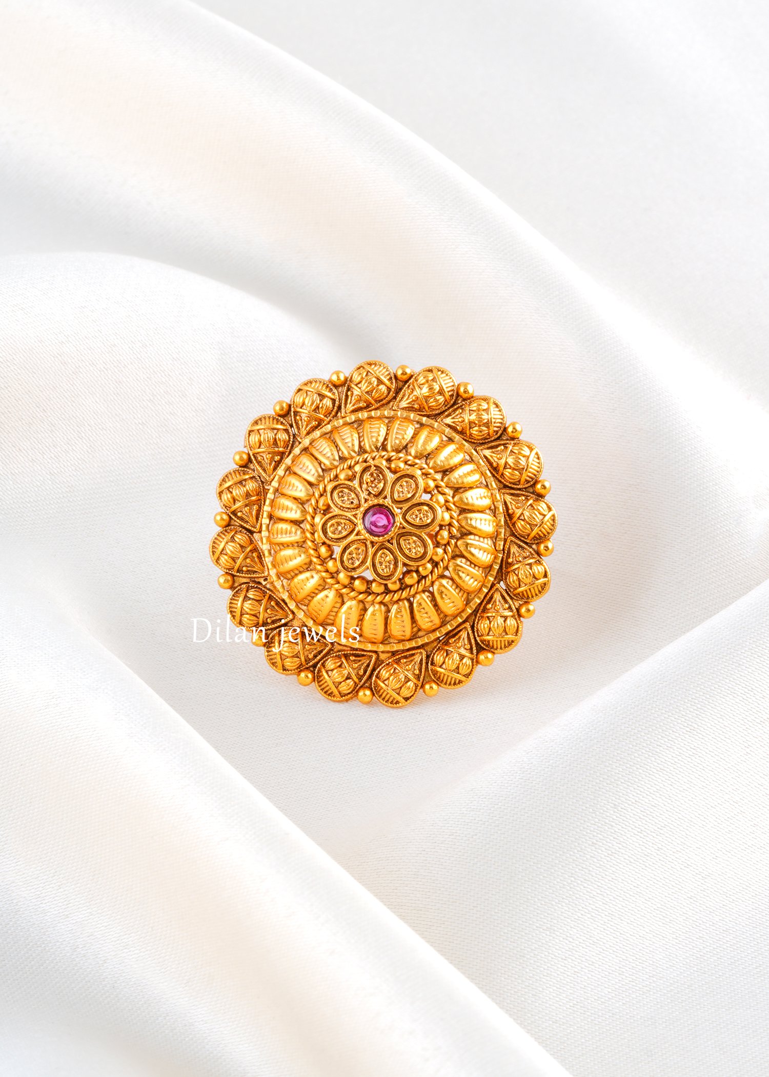 Add instant ethnic charm to your look with this German silver statement ring, finished in a regal gold tone and designed like a round medallion. The face features intricate, temple-inspired carving with layered petal details and a delicate beaded edge, highlighted by a pop of pink at the center for a traditional festive feel. The open, adjustable shank offers a comfortable fit and makes it easy to style on any finger. Perfect for weddings, festive wear, and gifting.