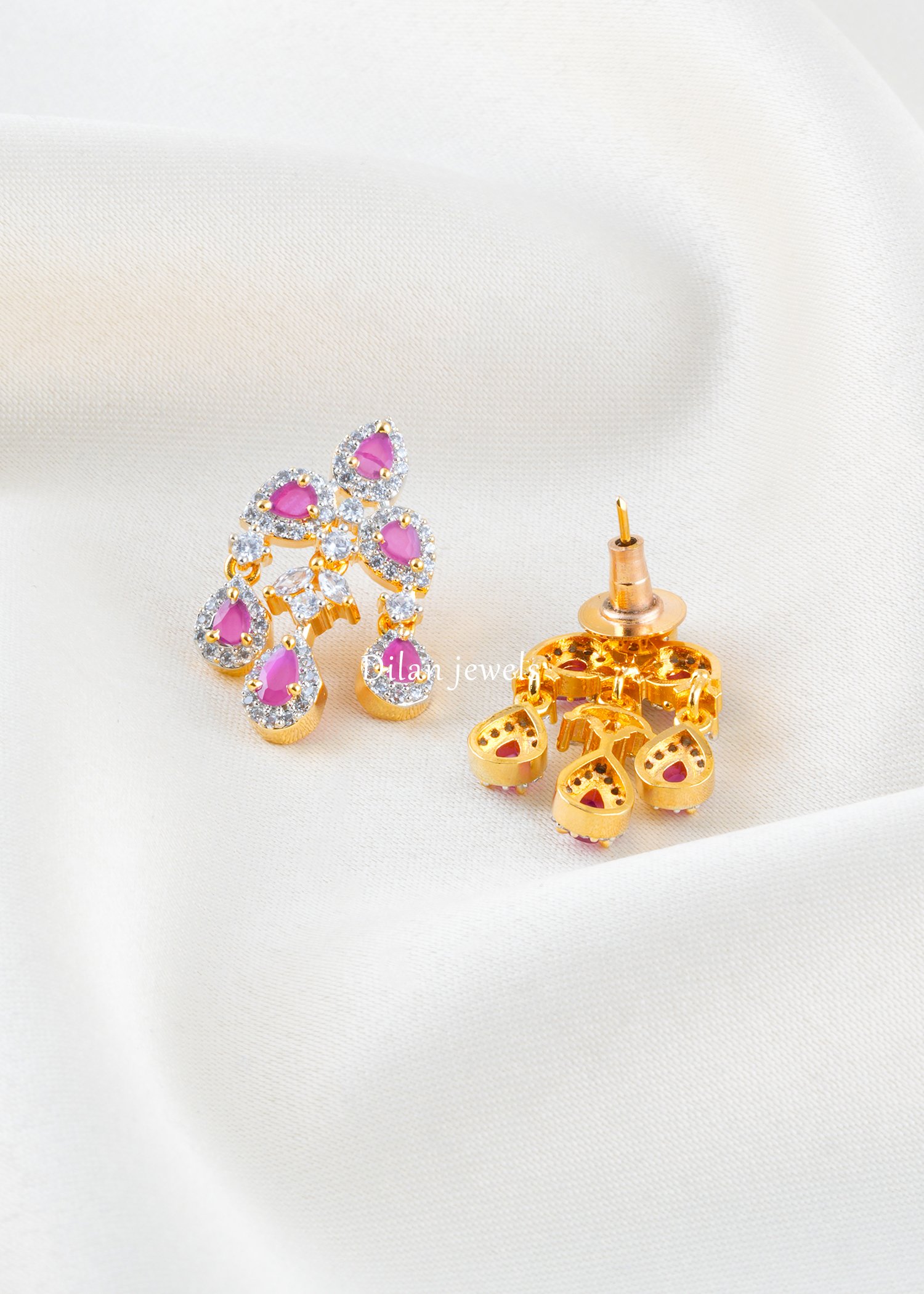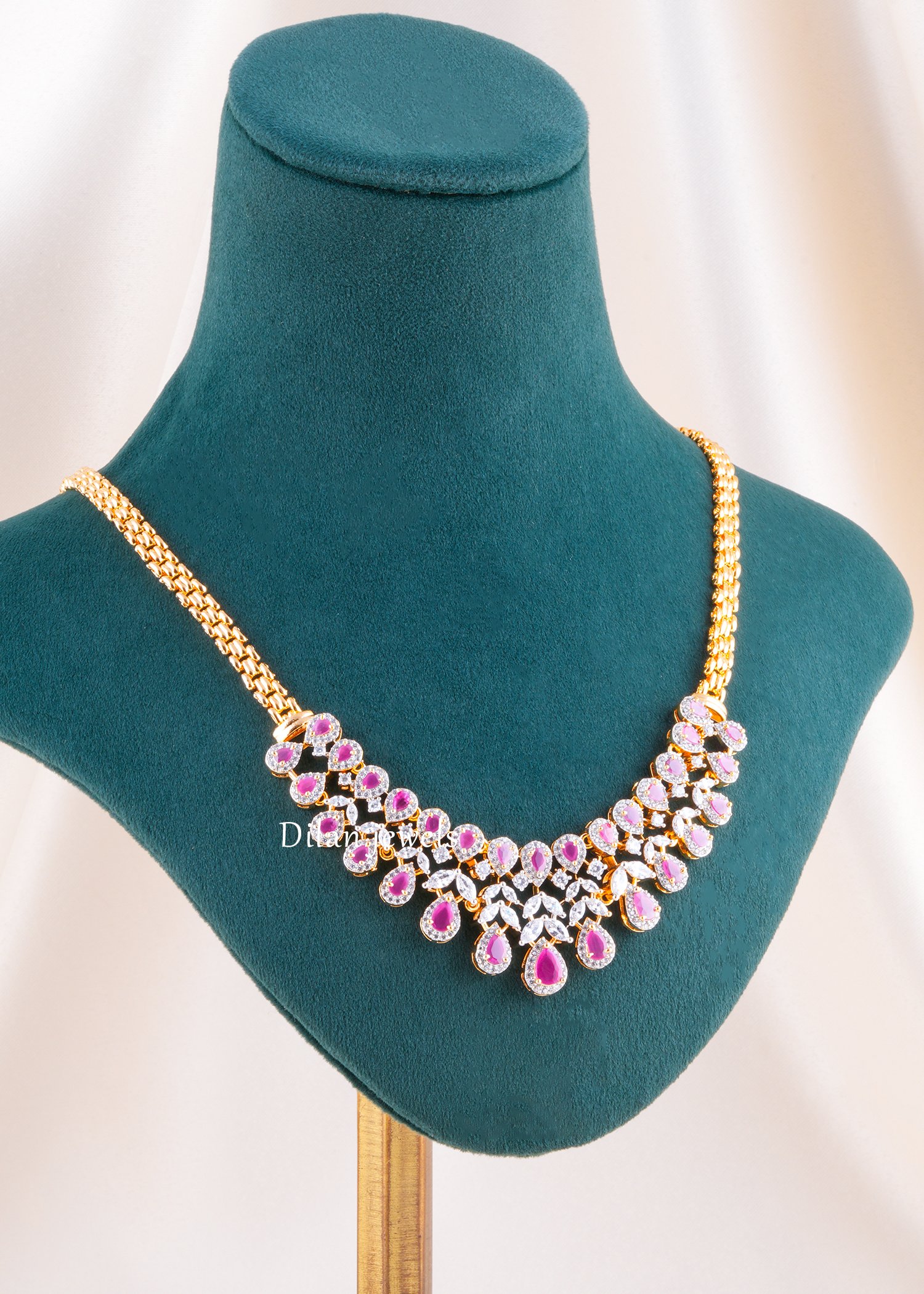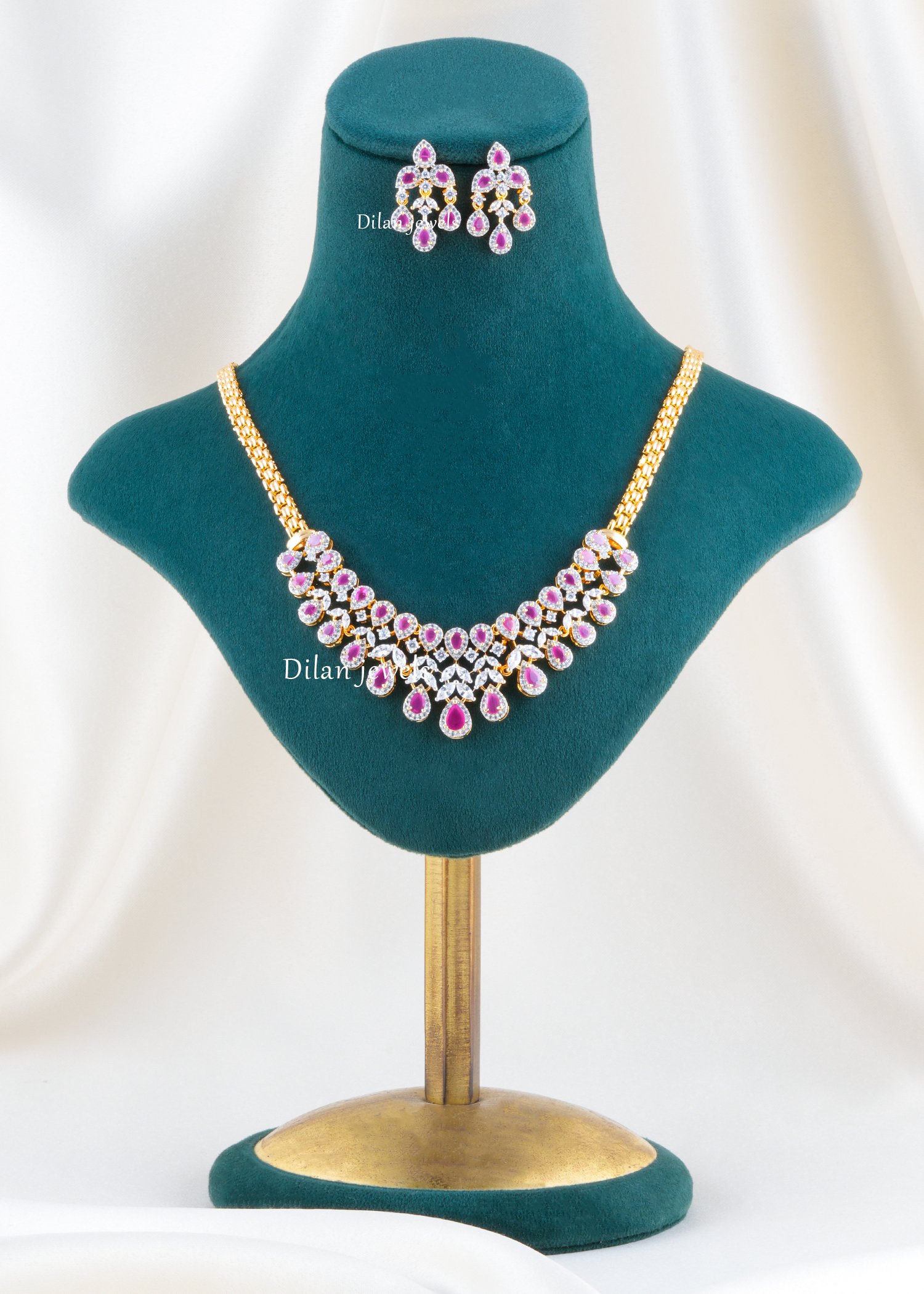 Add a touch of timeless glamour with this exquisite necklace set, crafted in premium German silver and embellished with AAA quality American diamonds. The design features a graceful arrangement of sparkling stones paired with rich ruby-pink teardrop accents, creating a perfect blend of elegance and vibrance. Its intricate craftsmanship and radiant finish make it ideal for weddings, festive occasions, and evening celebrations. The set is beautifully complemented by matching earrings (2.8 cm), offering a balanced and sophisticated look that enhances both traditional and contemporary outfits.