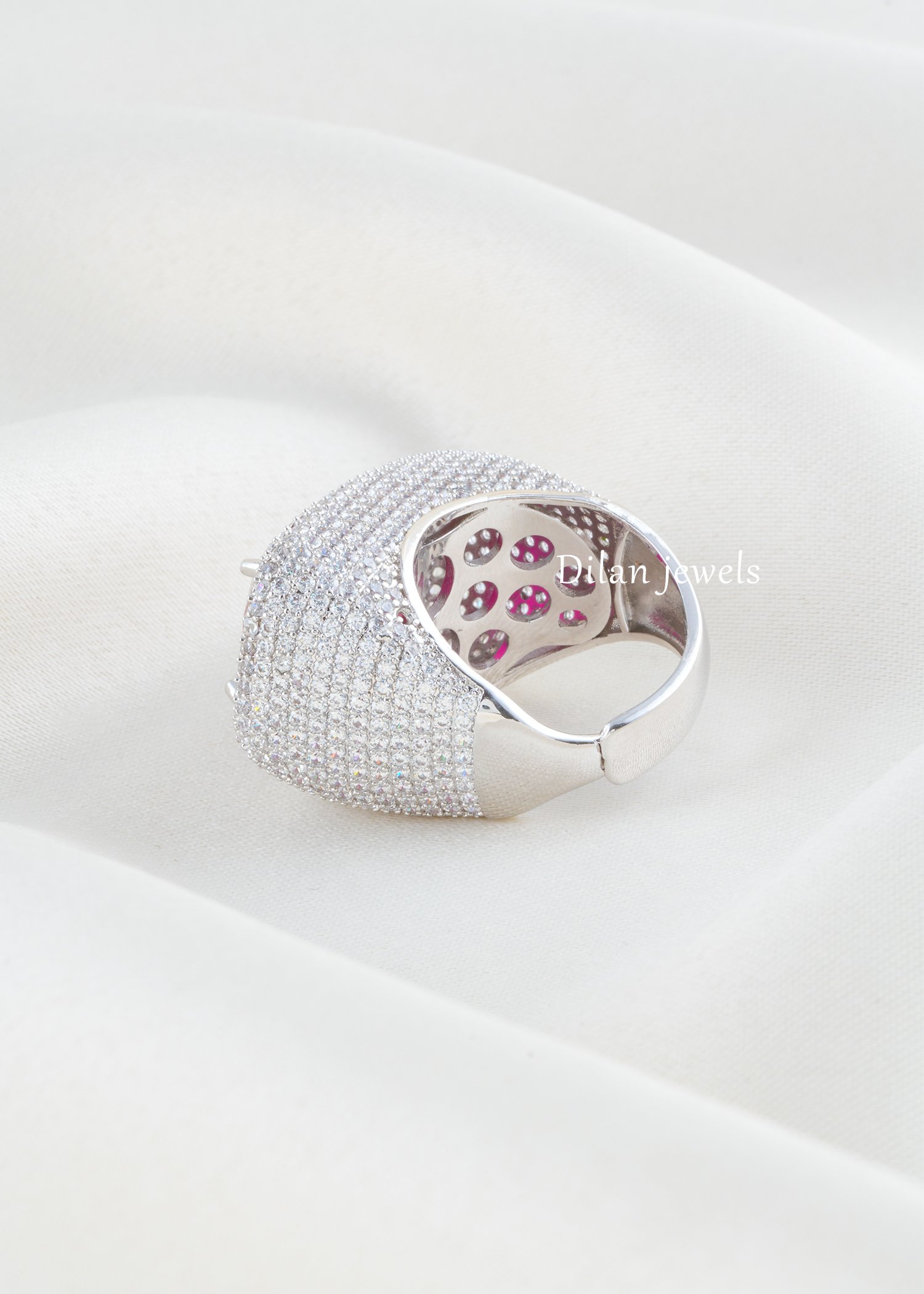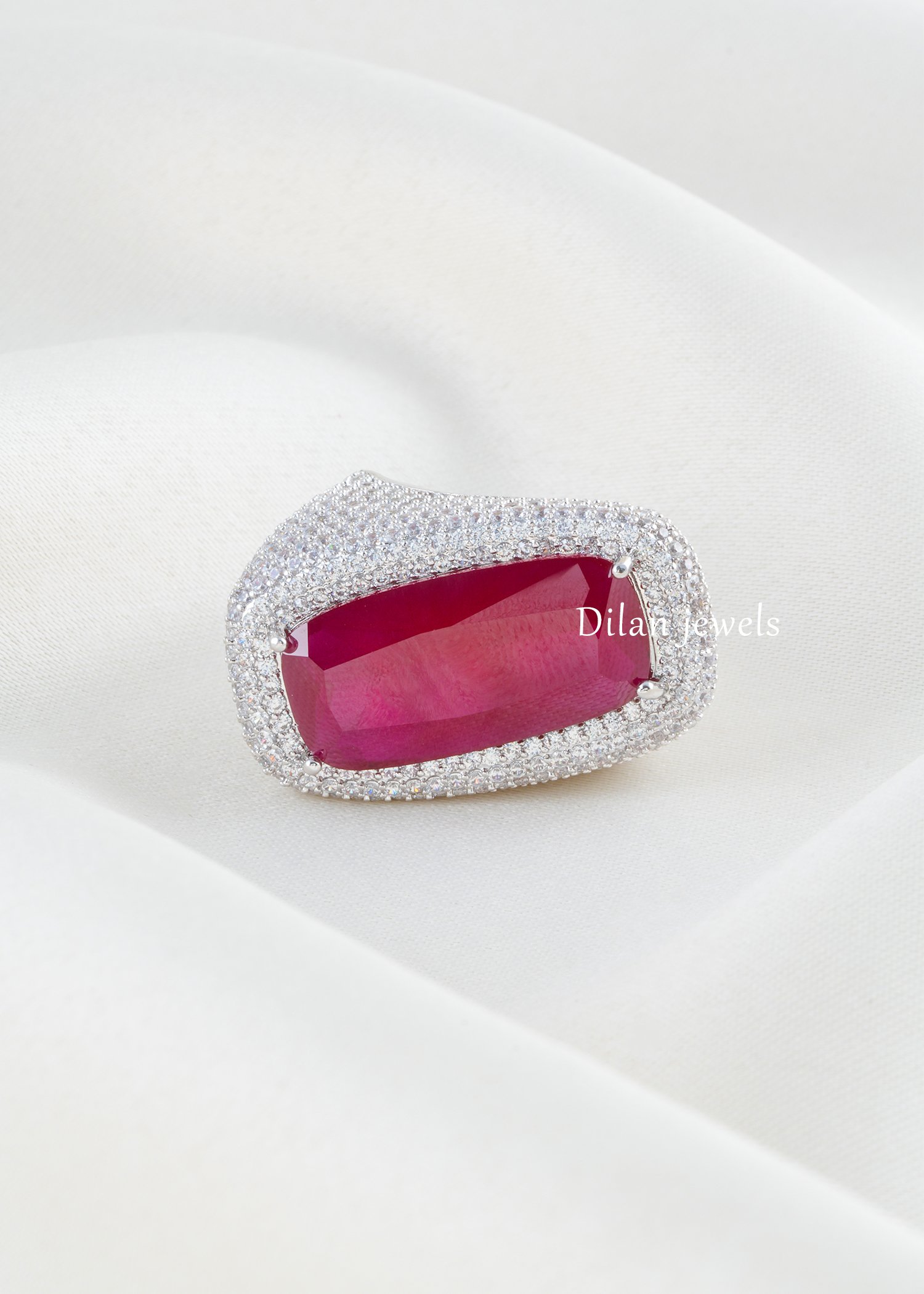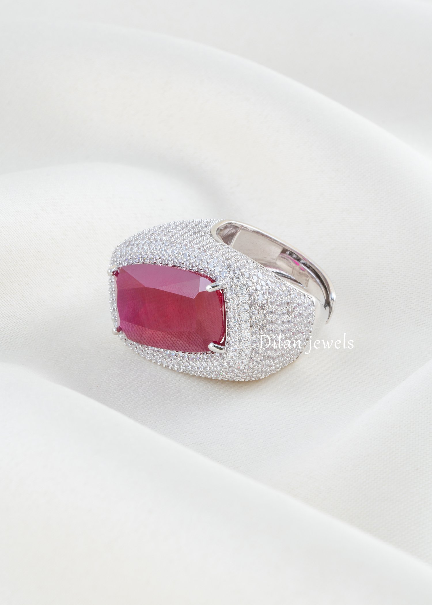 Exude regal magnificence with this stunning ruby cocktail ring, expertly crafted in premium German silver and finished in lustrous rhodium plating. The design showcases an exquisite cushion-cut ruby gemstone as the showstopping focal point, elegantly held in a secure setting and surrounded by a lavish pave of AAA-quality American diamonds that intensify the ruby’s rich crimson brilliance. The smooth, sculptural dome band ensures exceptional comfort for everyday sophistication. Perfect for weddings, celebrations, and special occasions, this timeless piece harmoniously blends passionate ruby hues with sparkling diamond accents, creating an unforgettable statement of refined elegance.