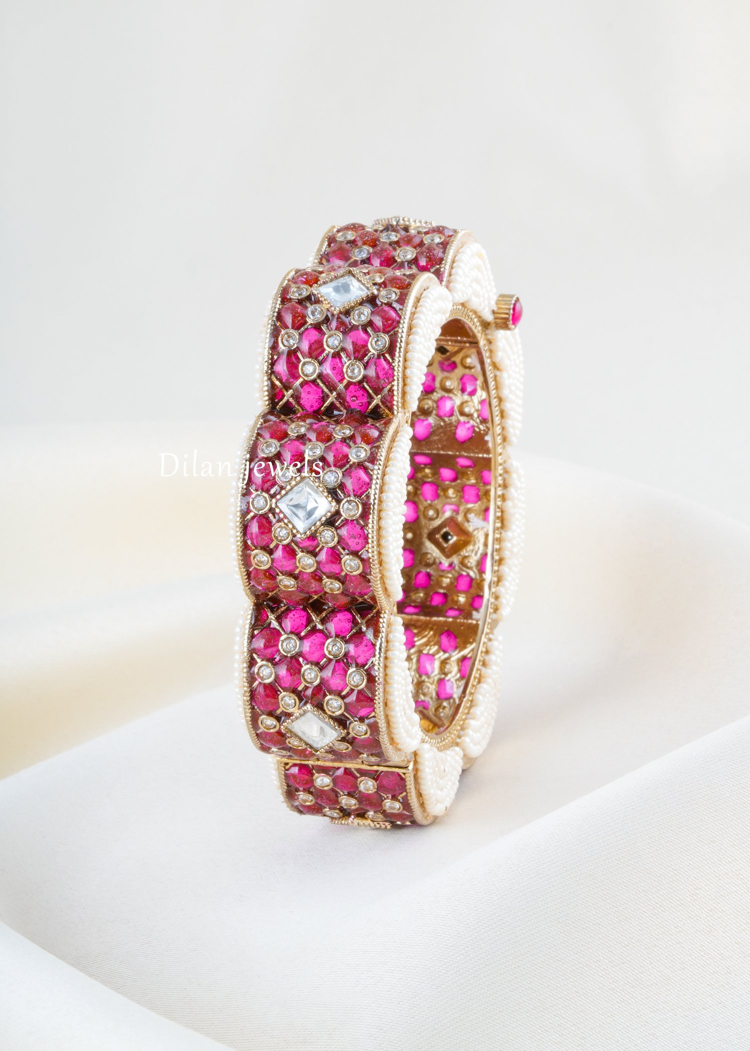 Embrace royal elegance with this stunning German silver bracelet showcasing vibrant ruby-red kundan stones and pristine freshwater pearls. The intricately segmented bangle features bold scalloped sections adorned with brilliant ruby kundan gems, diamond-shaped cubic zirconia accents, and shimmering pearl embellishments. Each curved panel displays traditional lattice detailing with ornate metalwork. The hinged clasp ensures secure, comfortable wear. Perfect for weddings, celebrations, and festive occasions, this opulent piece harmonizes traditional kundan artistry with contemporary design. The durable German silver construction guarantees lasting brilliance, making it an exquisite investment piece for discerning jewelry connoisseurs.