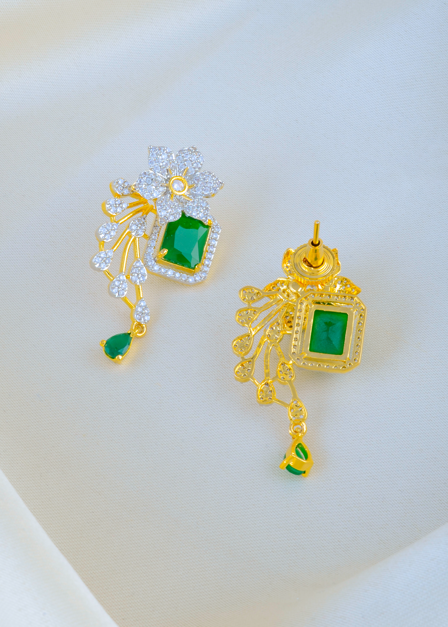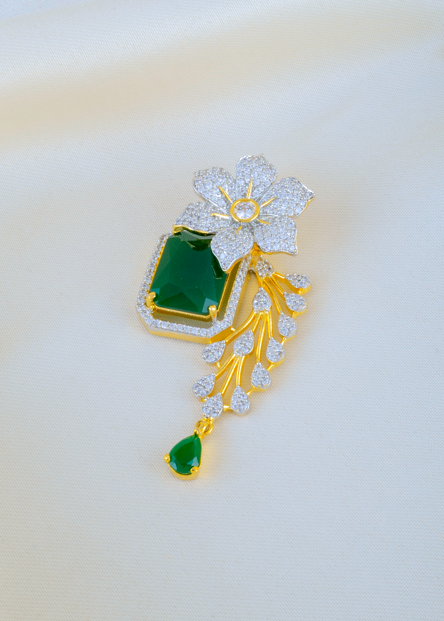 Grace meets glamour in this exquisite pendant set, crafted from premium German silver and encrusted with AAA-quality American diamonds. Featuring vibrant emerald-green stones set against a sparkling floral motif, the design evokes natural elegance with a regal twist. The pendant and matching earrings radiate sophistication with their gold-toned finish and intricate detailing, perfect for festive occasions or evening wear. Lightweight yet luxurious, this set is a must-have statement piece for anyone who loves bold, elegant jewelry with a contemporary flair. Locket Length: 6.00cm, Earring Length: 4.50cm