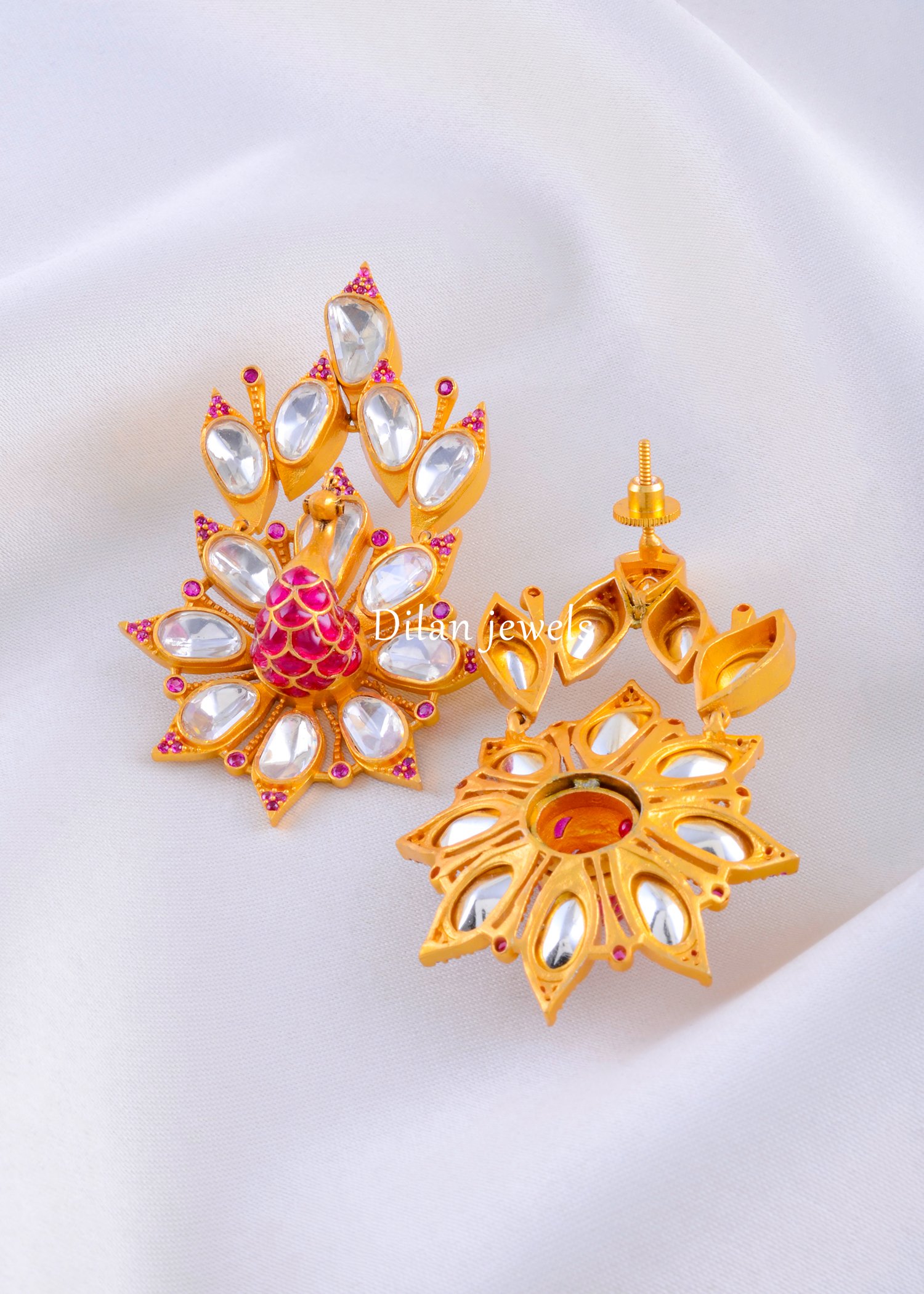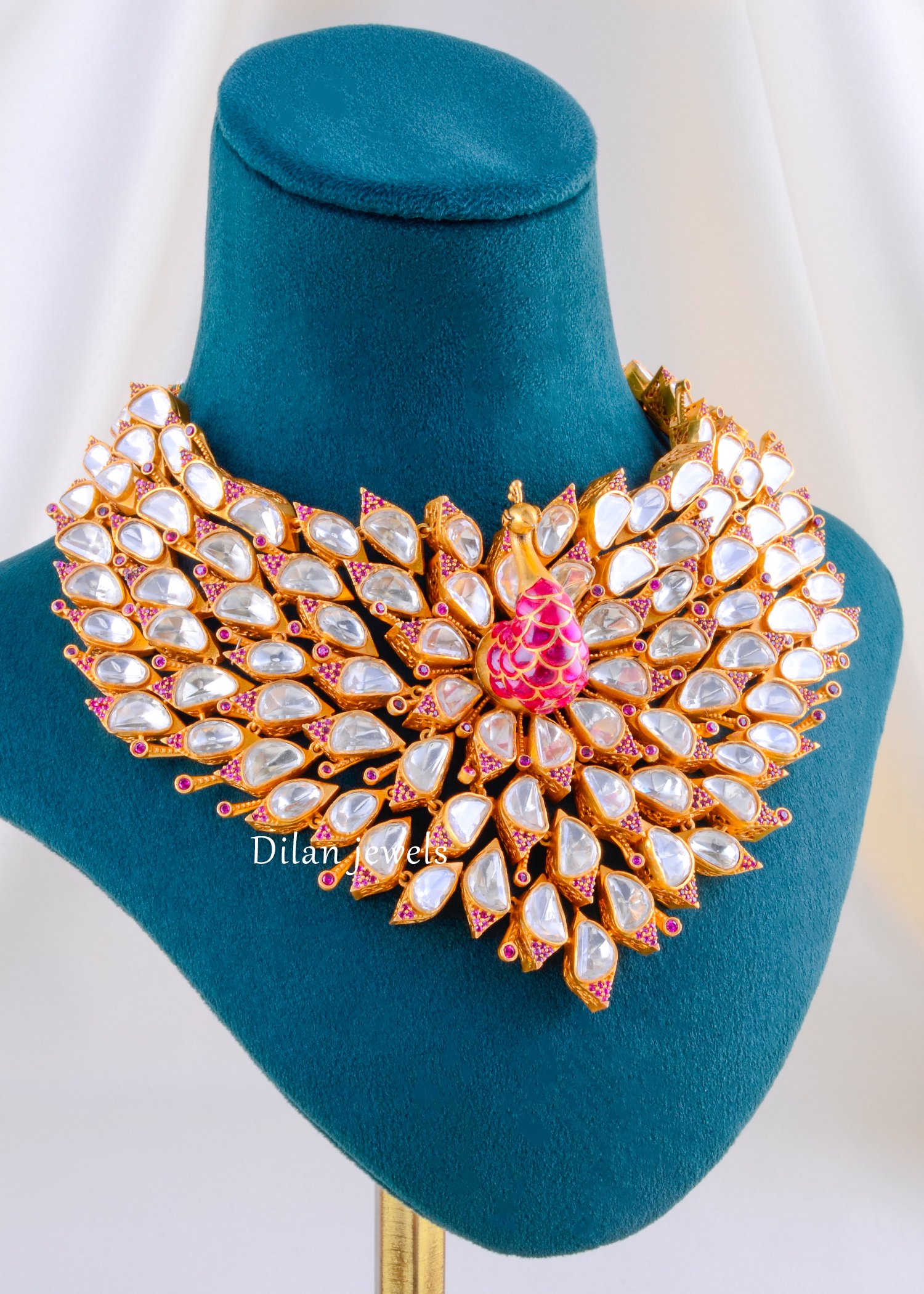 Unveil timeless elegance with this magnificent German Silver Necklace Set, featuring a breathtaking peacock centerpiece. The design is a celebration of heritage artistry, showcasing large, uncut Kundan-style stones meticulously set to form the peacock’s majestic plumage. The central peacock motif is highlighted with vibrant ruby-pink enameling, adding a striking pop of color. The heavy choker silhouette, combined with its intricate detailing, exudes regal charm. Paired with matching statement earrings that echo the peacock theme, this gold-plated set is perfect for brides and festive occasions, promising to be the crowning glory of your ethnic ensemble.