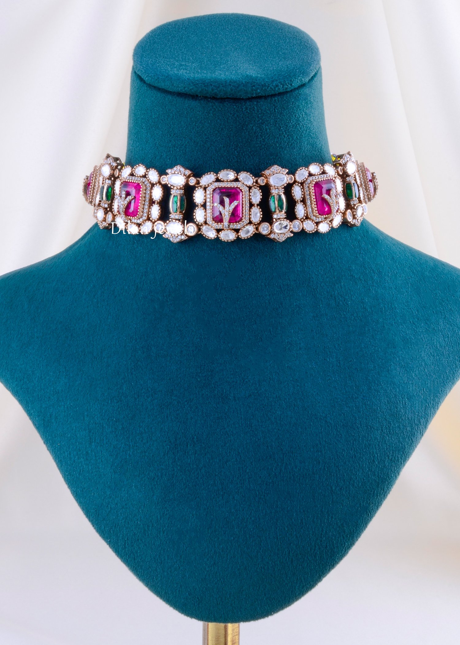 Indulge in royal opulence with this breathtaking choker necklace set, exquisitely crafted in premium German silver. The design features magnificent rectangular ruby-pink gemstones as the focal points, each framed by intricate halos of AAA-quality American diamonds and delicate emerald accents. The choker’s regal structure is enhanced by detailed craftsmanship, with each segment showcasing a harmonious blend of vibrant pink stones and glittering diamonds. Paired with matching statement stud earrings, this set exudes grandeur and sophistication. Perfect for weddings and grand festivities, this masterpiece offers a luxurious, heirloom-inspired look that commands attention.