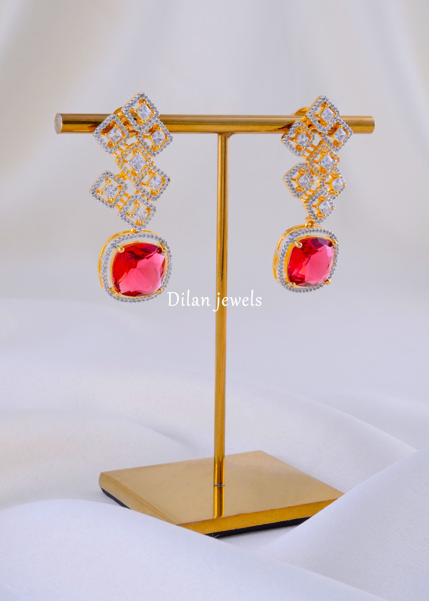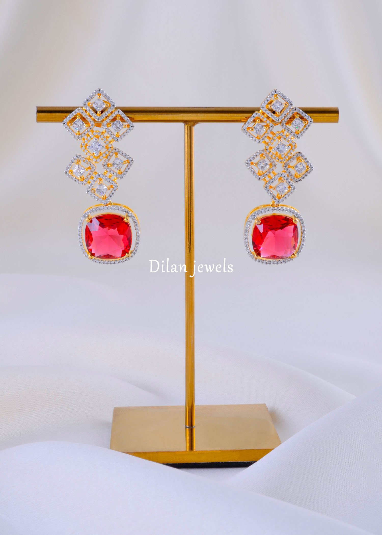 Elevate your style with these statement earrings, beautifully crafted in premium German silver and adorned with AAA quality American diamonds. Featuring a stunning red cushion-cut stone framed by sparkling diamonds, the design is complemented by an intricately floral diamond-studded top, adding a touch of regal charm. Lightweight yet luxurious, these earrings are perfect for weddings, festive occasions, or evening soirees, making them a versatile addition to your collection. Their fusion of classic elegance with modern craftsmanship ensures you shine effortlessly wherever you go.