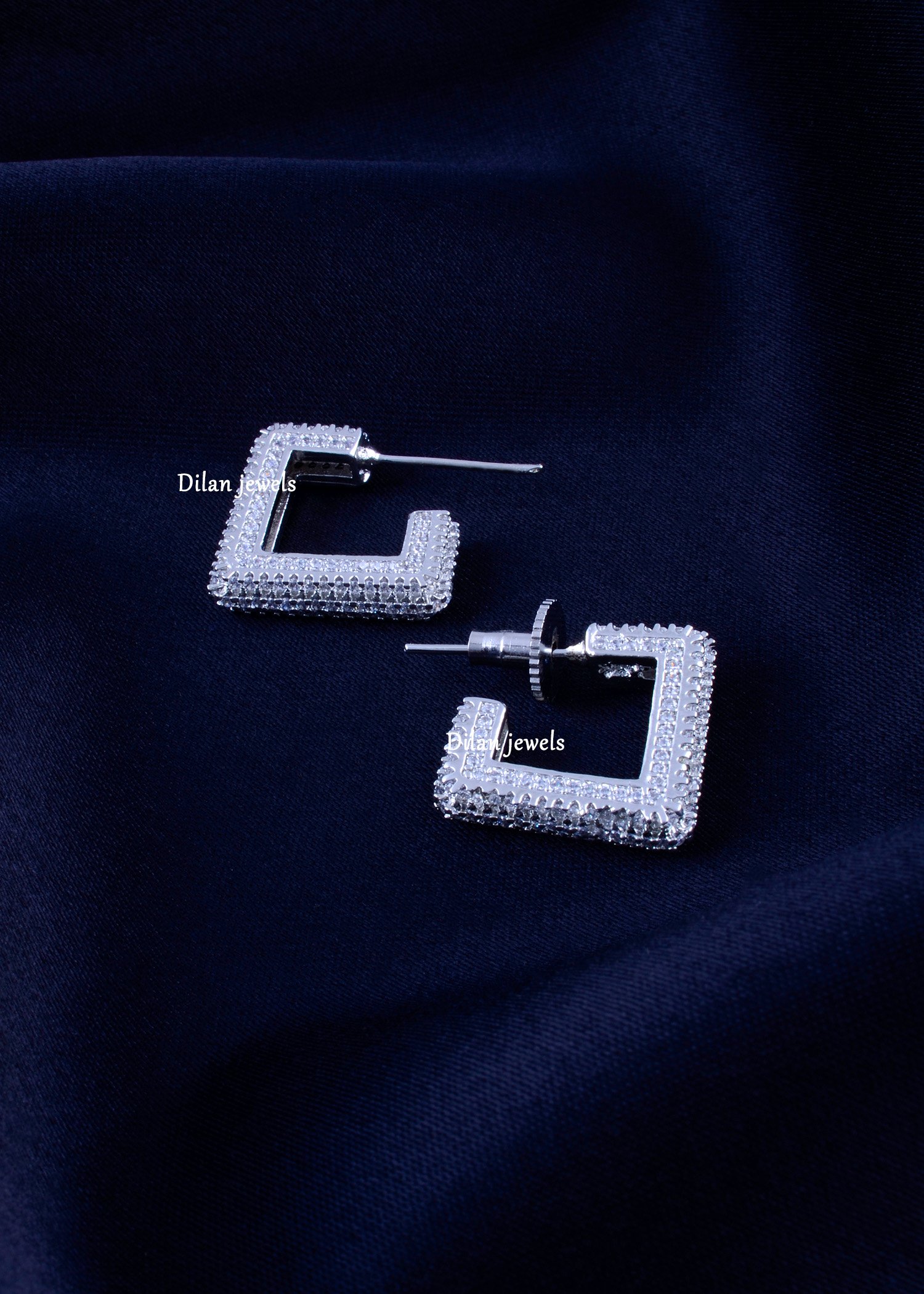 Showcase your modern style with these geometrically chic square hoop earrings. Crafted in premium German Silver and lavishly plated with a bright rhodium finish, these small, bold hoops feature a completely pavé-set surface. The meticulous setting of multiple rows of shimmering AAA-quality American Diamonds creates a dense, continuous sparkle. The contemporary square shape offers a fresh, edgy take on the classic hoop, perfect for daily wear or adding a touch of structure to a sophisticated outfit. They are secured with a sturdy push-back and post, ensuring a comfortable fit.