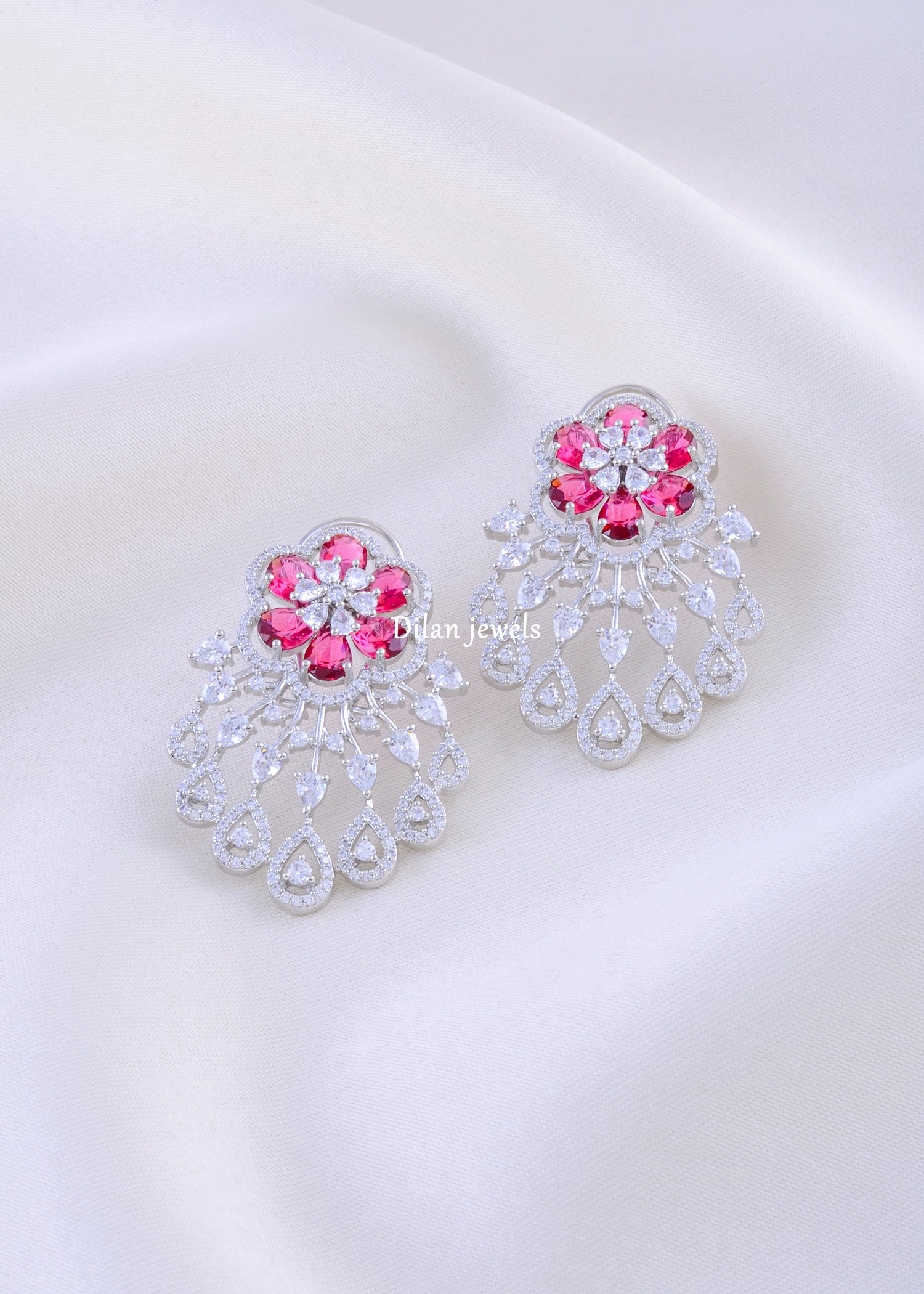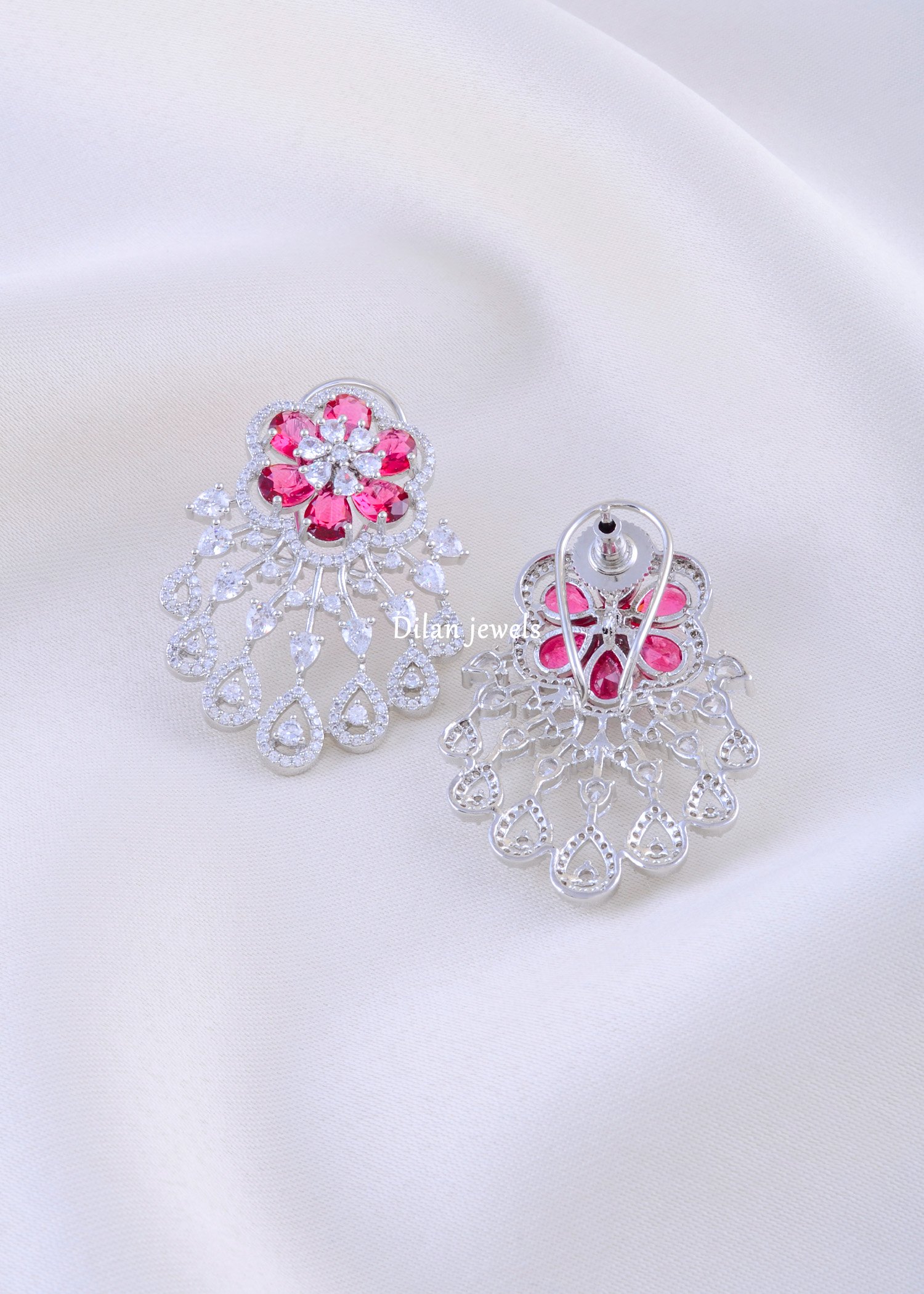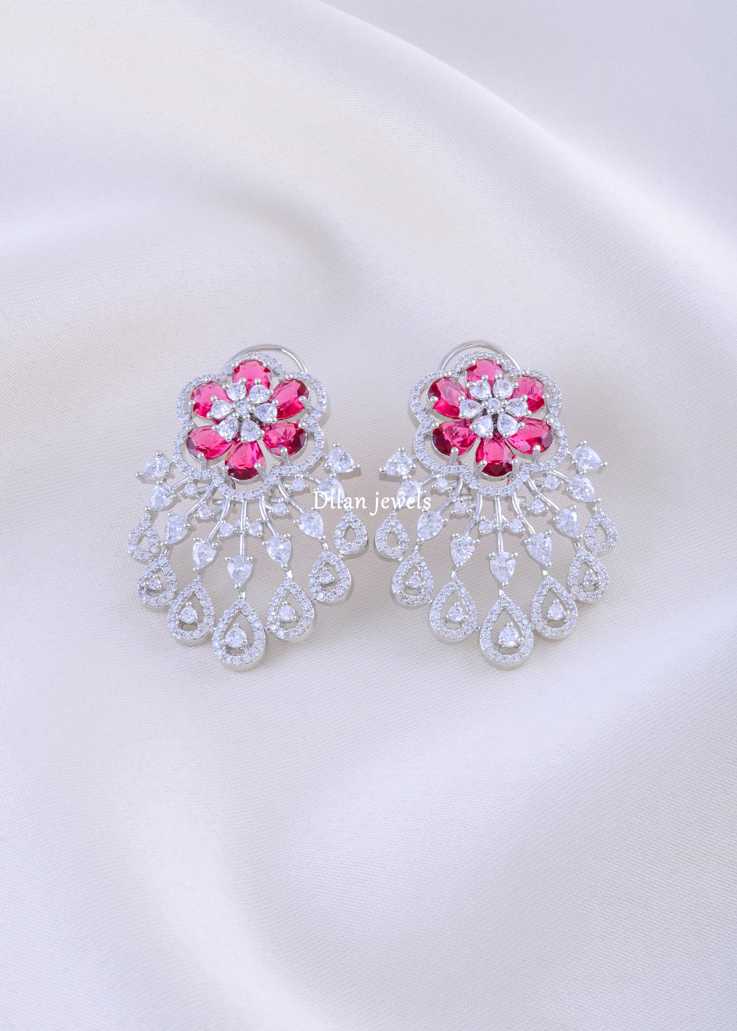 These beautifully crafted German silver earrings showcase a striking floral motif adorned with vibrant pink stones and sparkling AAA-quality American diamonds. The intricate layered design features elegant teardrop and heart-shaped diamond settings, creating a luxurious chandelier effect. Lightweight yet rich in detail, these earrings add a regal charm to any festive, bridal, or party look. Their flawless shine and premium craftsmanship make them a standout accessory for women who love glamorous, eye-catching jewellery. Perfect for weddings, celebrations, and evening events.