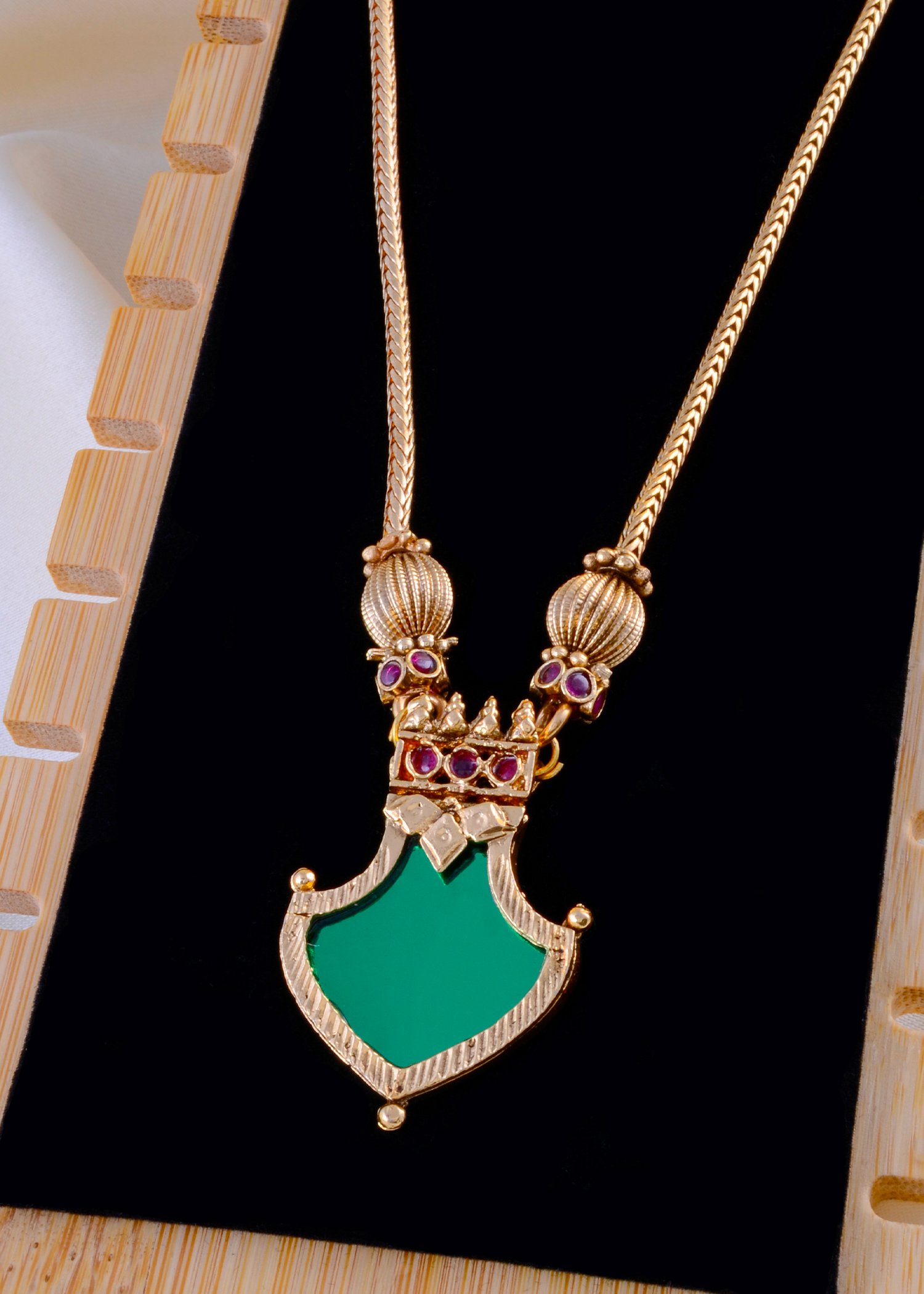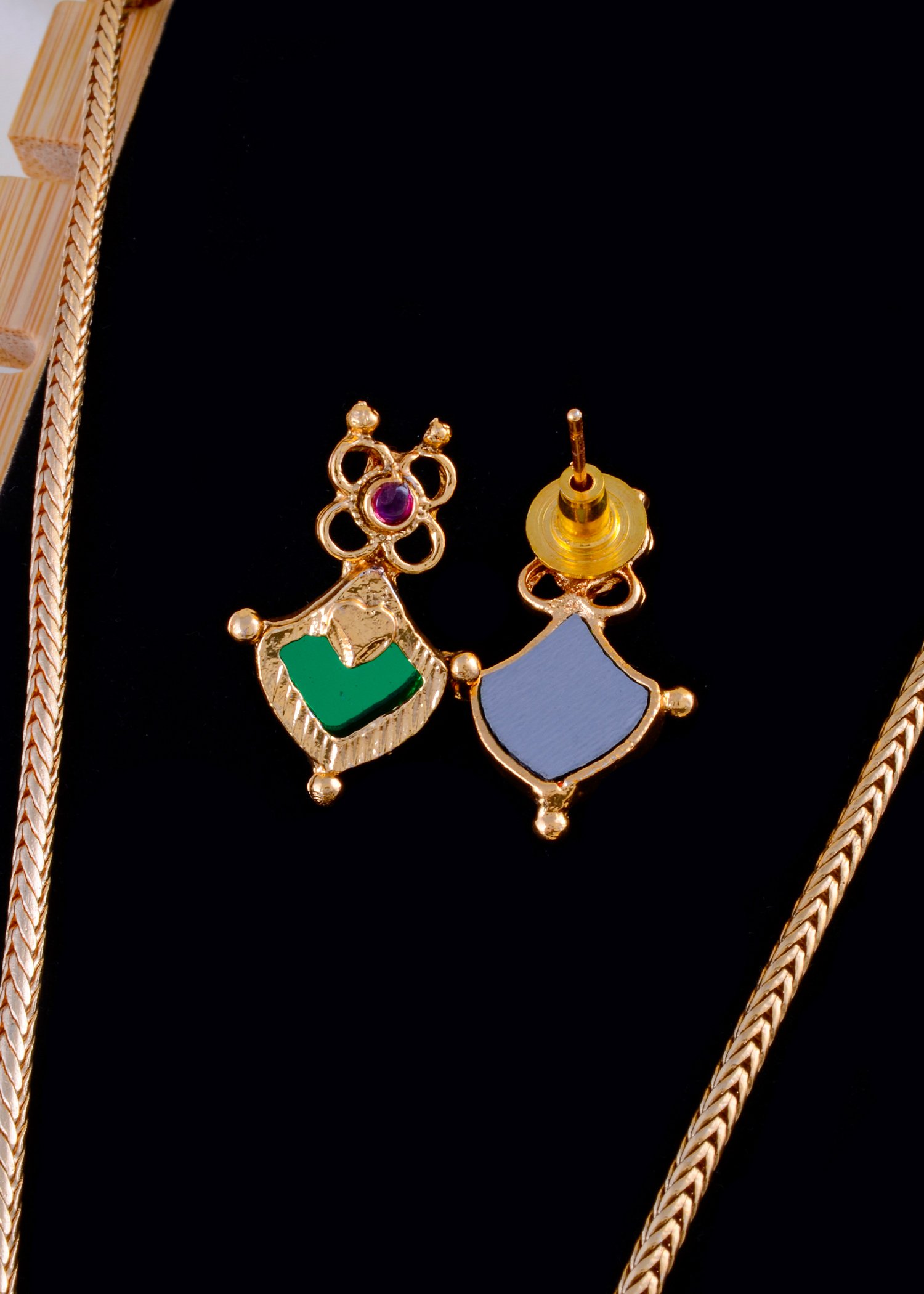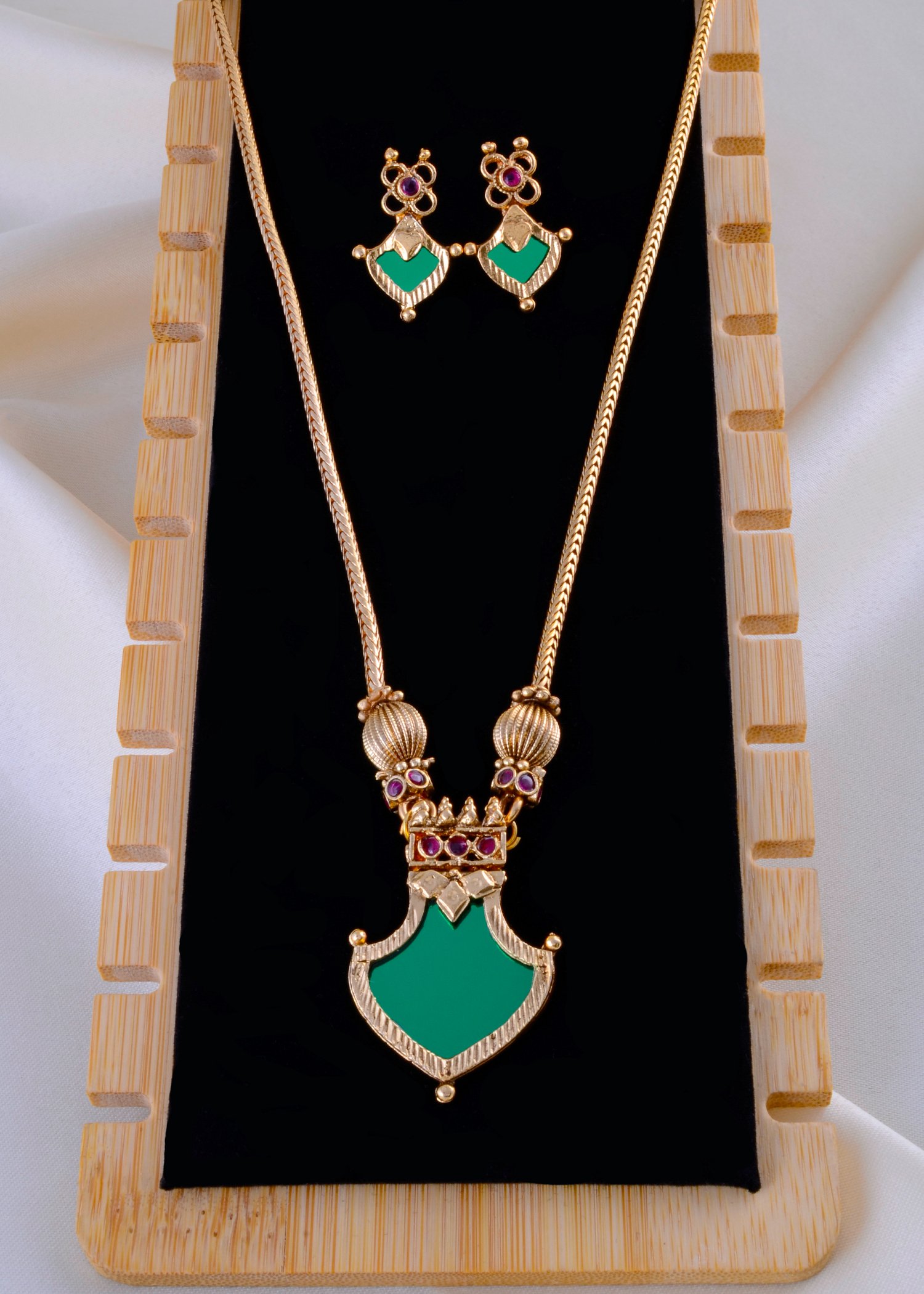 This exquisite German Silver necklace set reflects the charm of traditional artistry blended with modern elegance. The centerpiece features a bold green teardrop-shaped pendant encased in gold-tone detailing, crowned with intricate motifs and ruby-colored accents for a regal touch. Paired with matching earrings designed with leaf-inspired glass enamel work and gemstone embellishments, this set radiates sophistication and heritage appeal. Perfect for festive occasions, weddings, and cultural celebrations, its lightweight yet sturdy craftsmanship ensures comfort with durability. Comes with a lifetime guarantee on stones, making it a timeless addition to your jewelry collection.