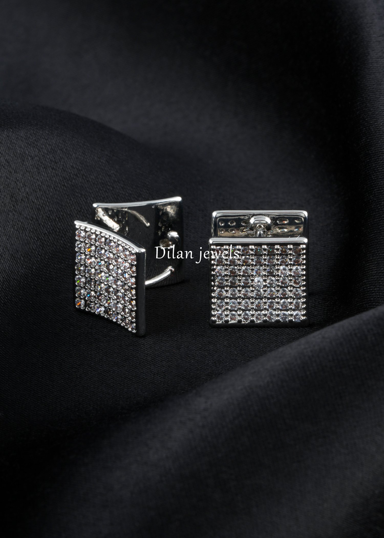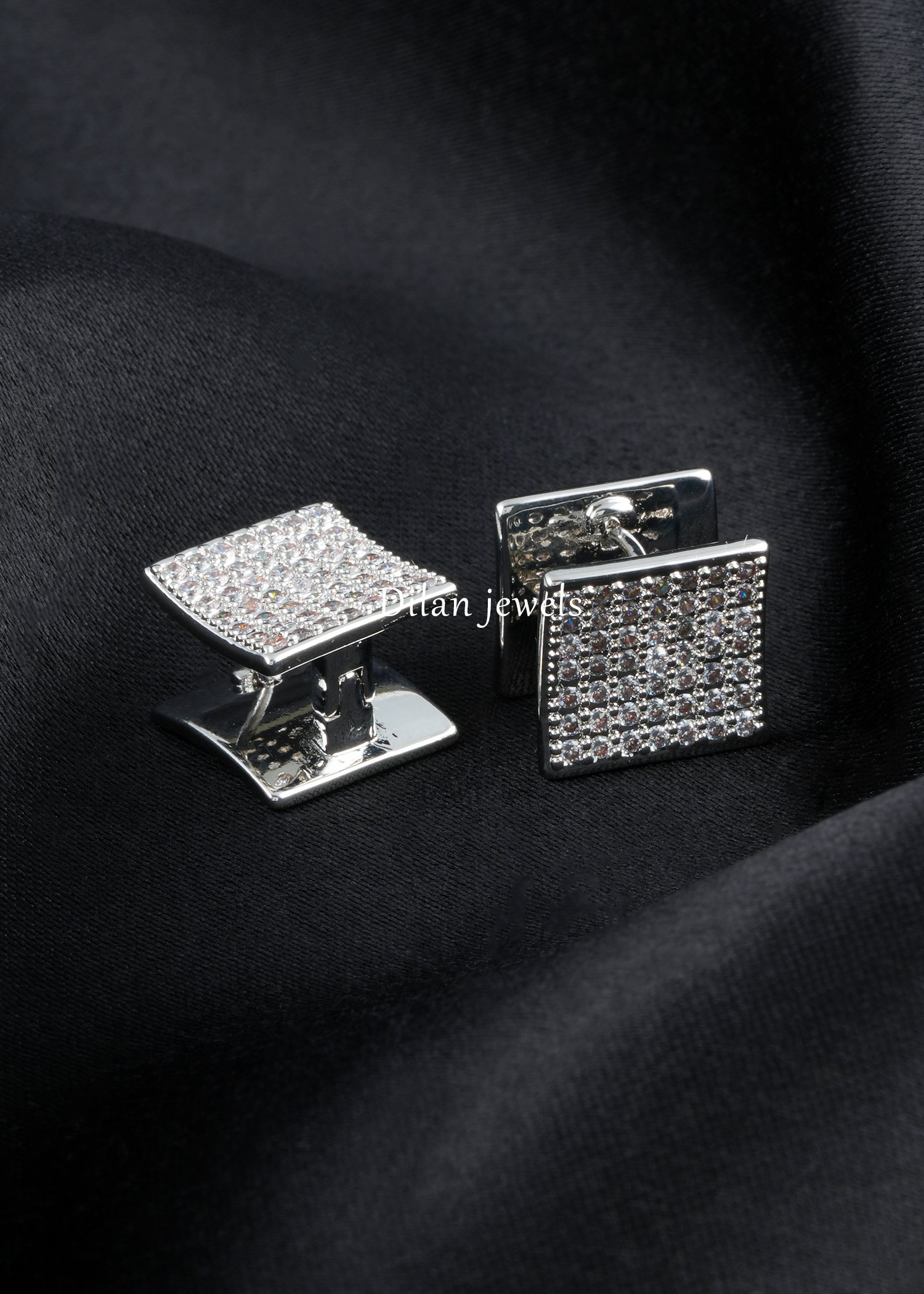 An elegant pair of German silver earrings featuring sophisticated square-shaped studs densely set with AAA-grade American diamonds in a pave design. The brilliant rectangular geometry combined with meticulous diamond craftsmanship creates exceptional sparkle and shine. Each earring boasts a sleek, polished back with secure push-post closure for comfortable, all-day wear. Perfect for everyday elegance, office wear, or special occasions. The timeless square silhouette complements any face shape and works seamlessly with various outfits. These luxurious studs deliver maximum brilliance in a minimalist aesthetic. Ideal for those seeking sophisticated, versatile jewelry that exudes refined taste and understated glamour while maintaining premium quality and durability.