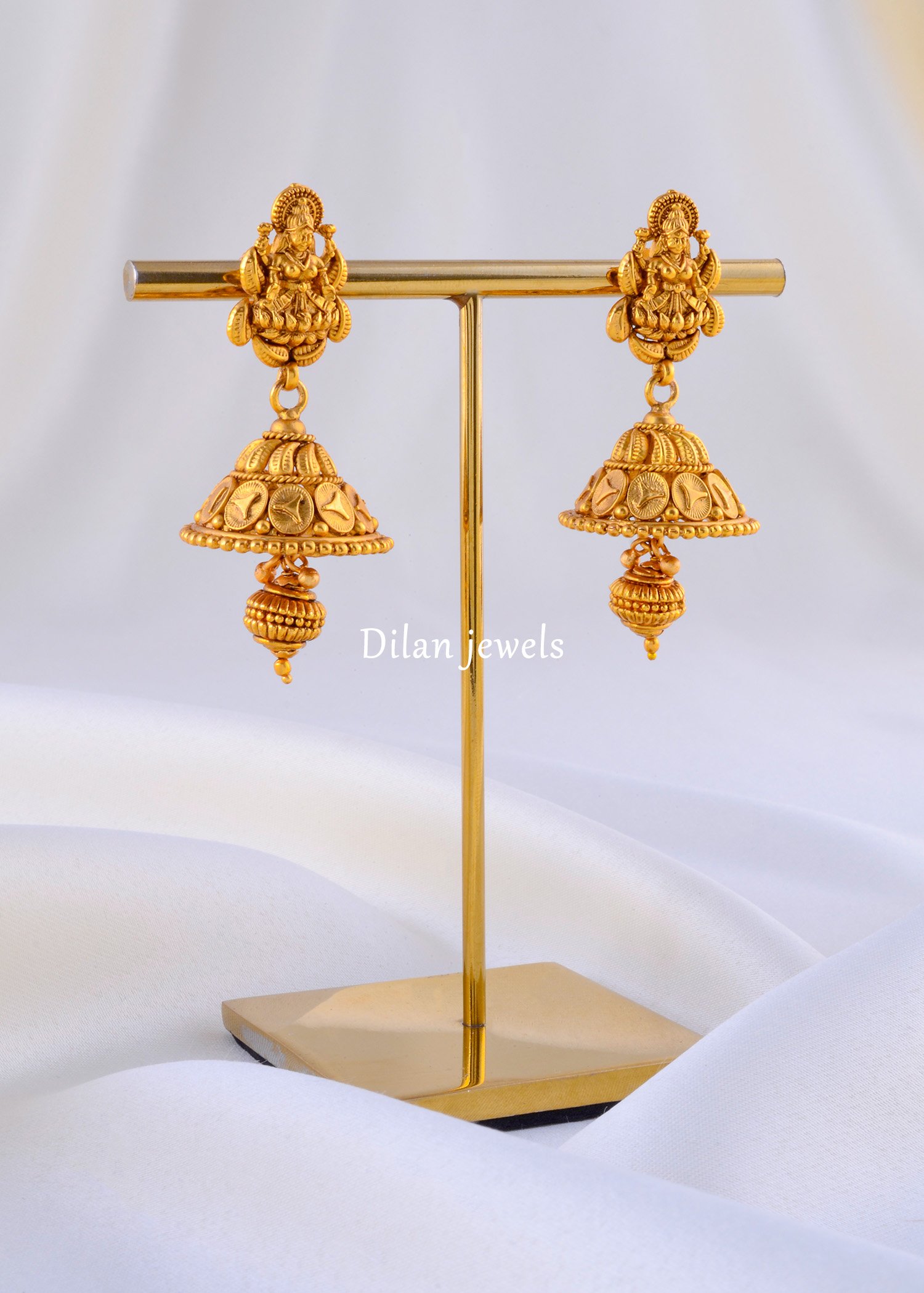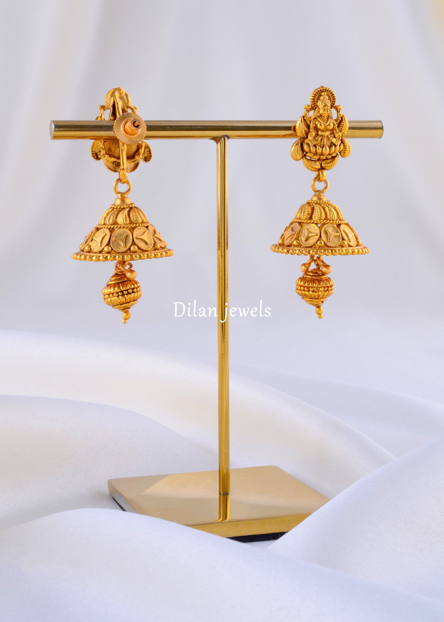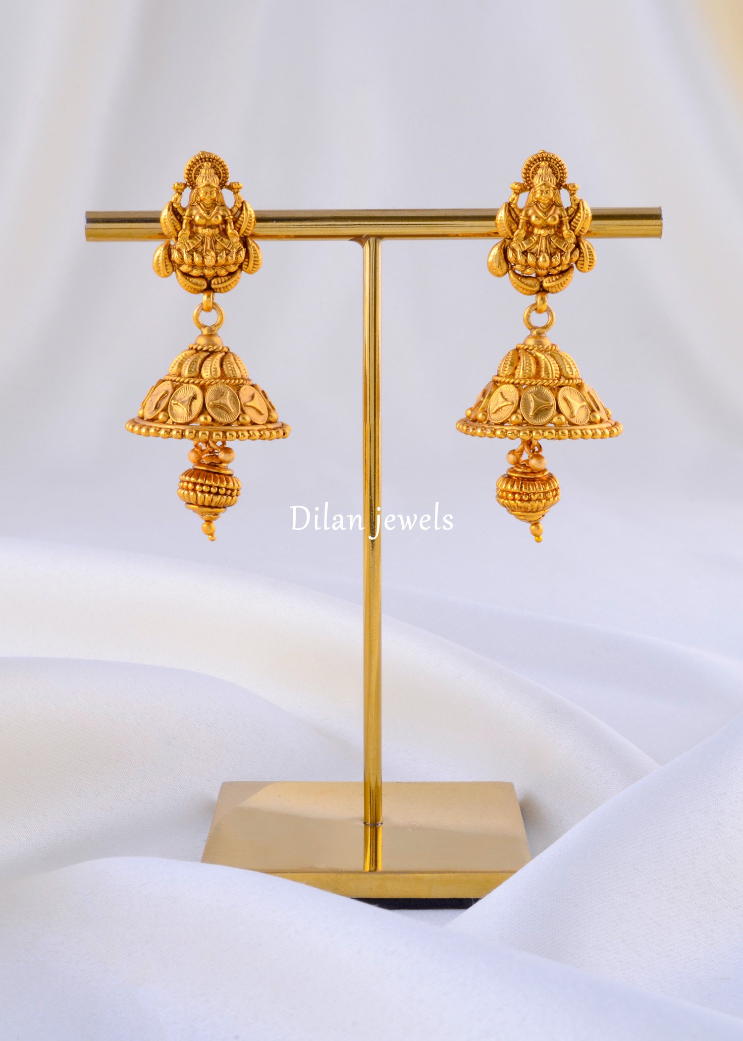 Invoke a sense of divine tradition with these exquisite Goddess Lakshmi Temple Jhumkas. The design begins with an intricately sculpted stud featuring the Goddess seated on a lotus, symbolizing prosperity and grace. Suspended below is a classic, bell-shaped jhumka dome detailed with textured ridges and a band of traditional circular coin motifs. A single golden bead dangles at the bottom, adding graceful movement. Finished in a rich antique gold tone, these earrings capture the regal essence of South Indian heritage jewelry, making them the perfect accessory for silk sarees, weddings, and festive religious ceremonies.