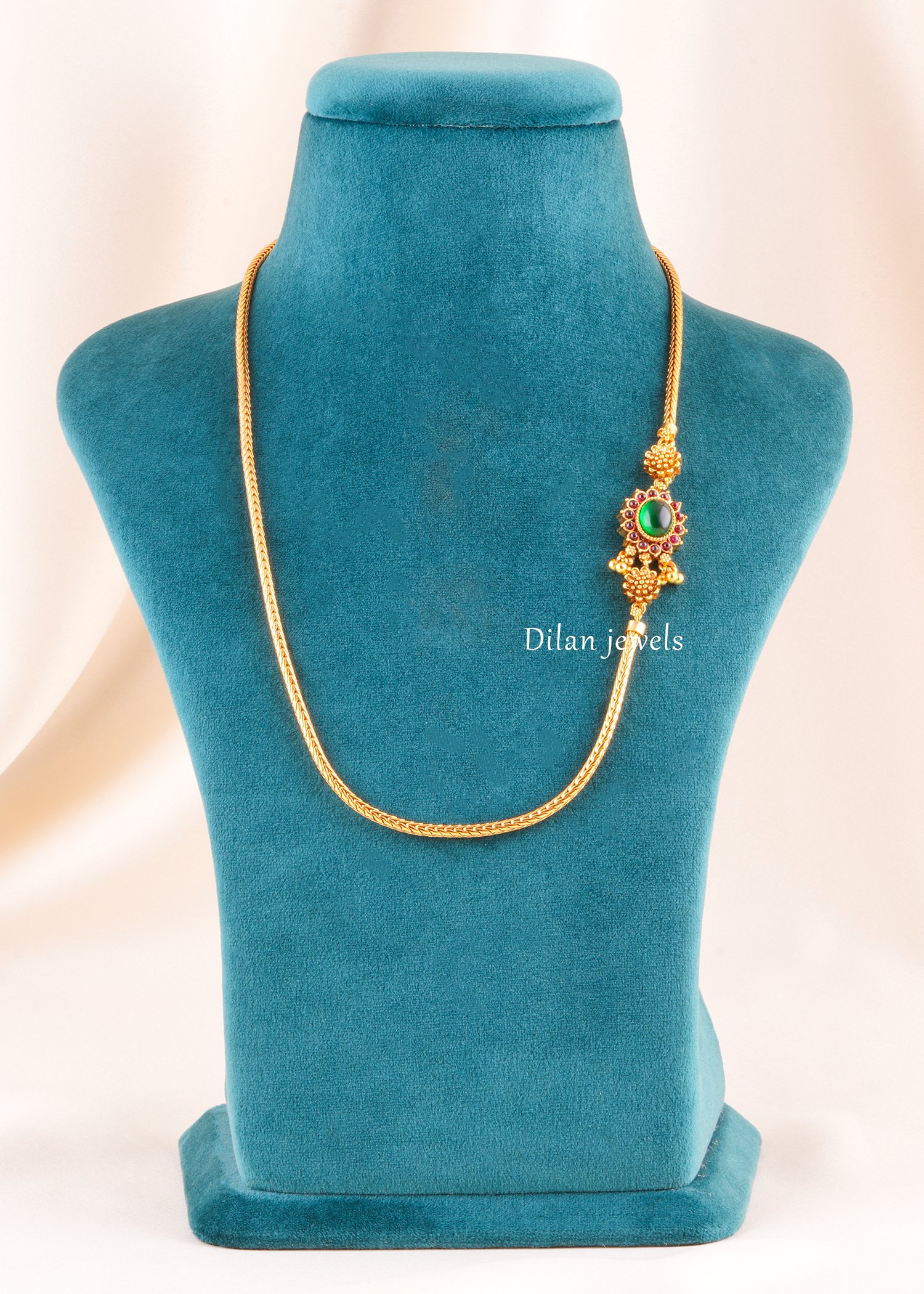 Elegant German silver necklace set featuring a sleek gold-tone chain and matching jhumka earrings. The necklace is adorned with an off-centre pendant showcasing a rich green stone surrounded by ruby-hued accents and delicate bead clusters, adding a graceful pop of colour. Intricately crafted dome-shaped jhumkas echo the pendant’s traditional detailing with ornate filigree and tiny dangling beads. Lightweight yet statement-worthy, this versatile set pairs beautifully with sarees, suits, and Indo‑western outfits, making it perfect for festive occasions, weddings, and everyday ethnic elegance.