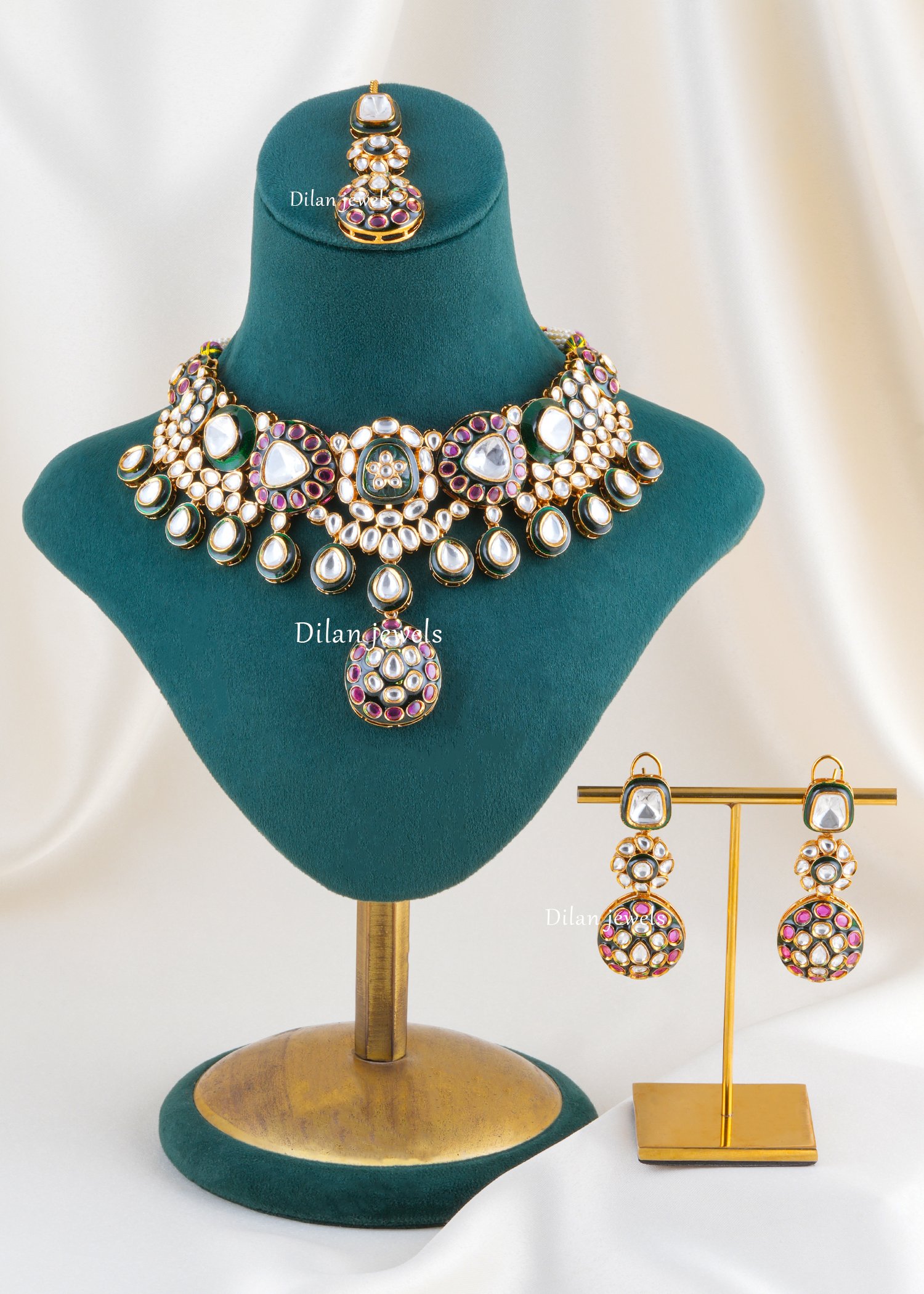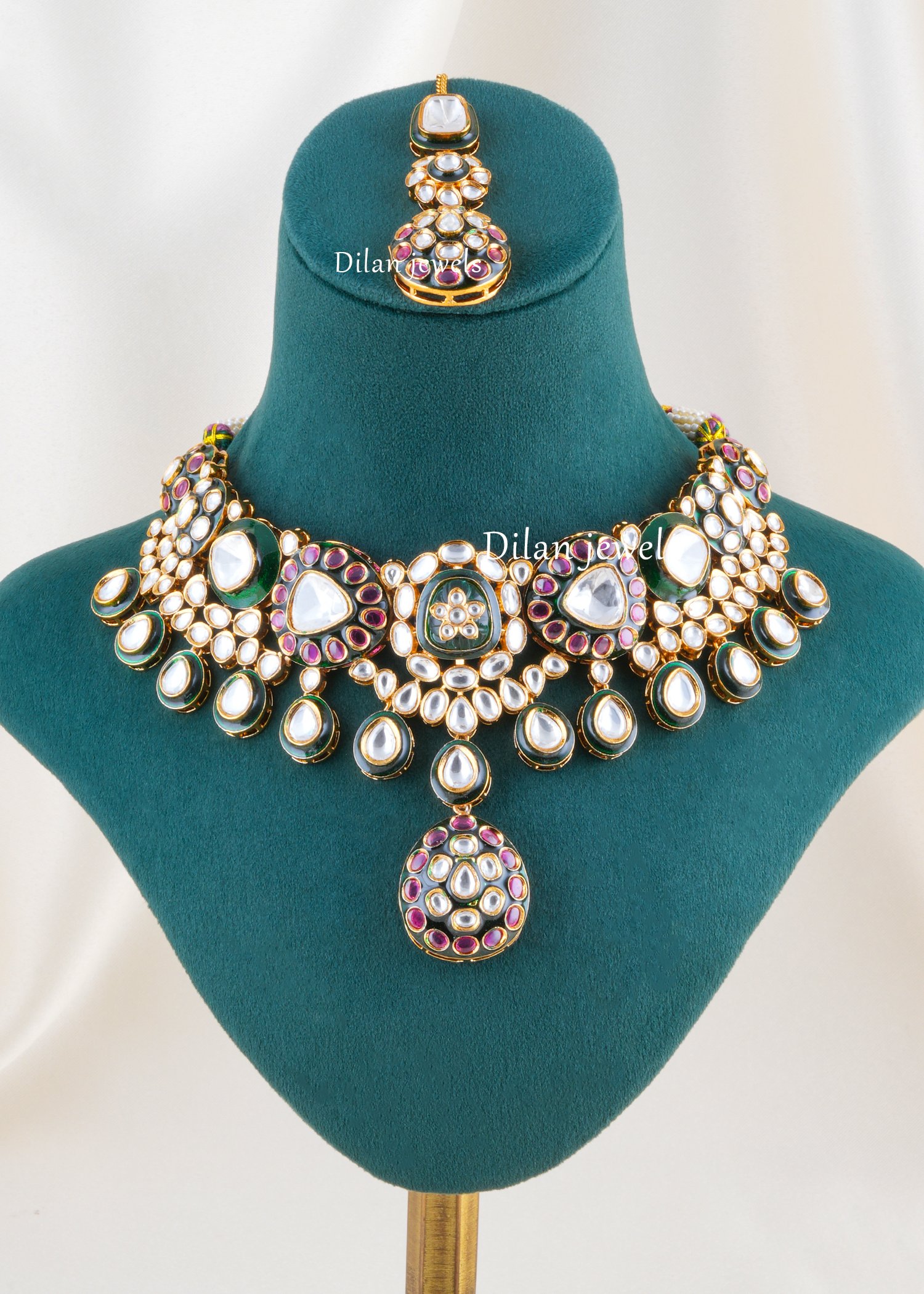 Make a regal statement with this stunning necklace set, crafted in premium German silver and adorned with AAA quality American diamonds. Inspired by traditional Kundan artistry, the design features intricate detailing with luminous white stones, rich green accents, and vibrant pink highlights, creating a luxurious and royal appeal. The bold centerpiece and elegant drop elements enhance its grandeur, making it perfect for weddings, festive occasions, and bridal wear. Paired with long, intricately designed earrings (6.7 cm), this set adds unmatched elegance and a timeless charm to your overall look.