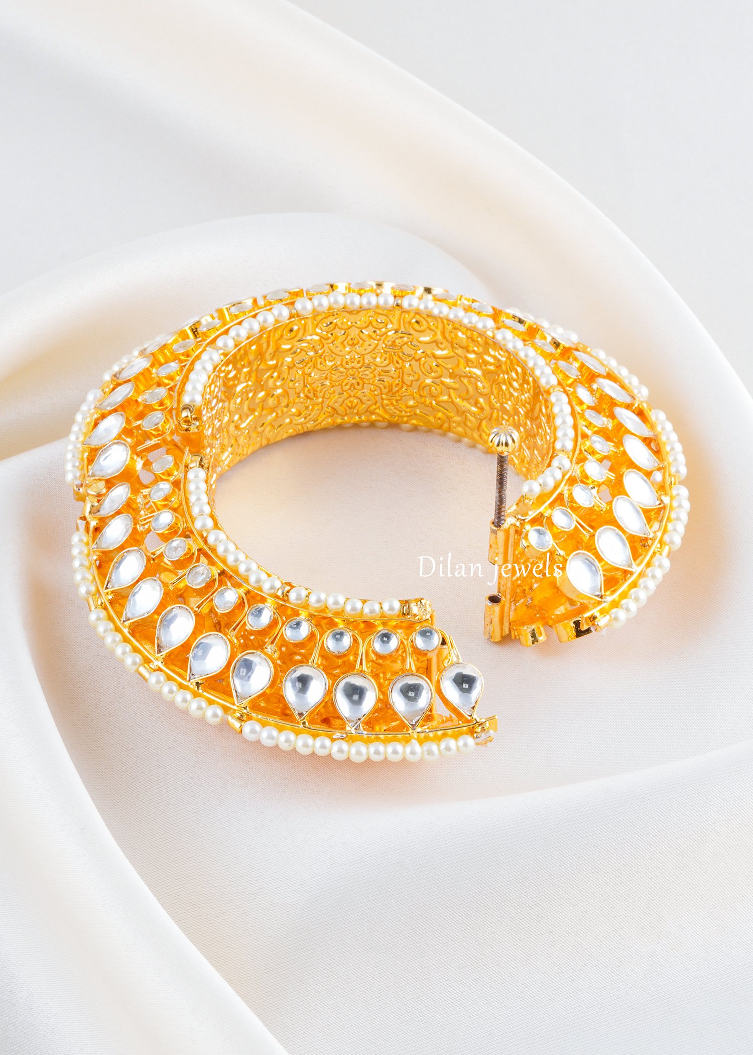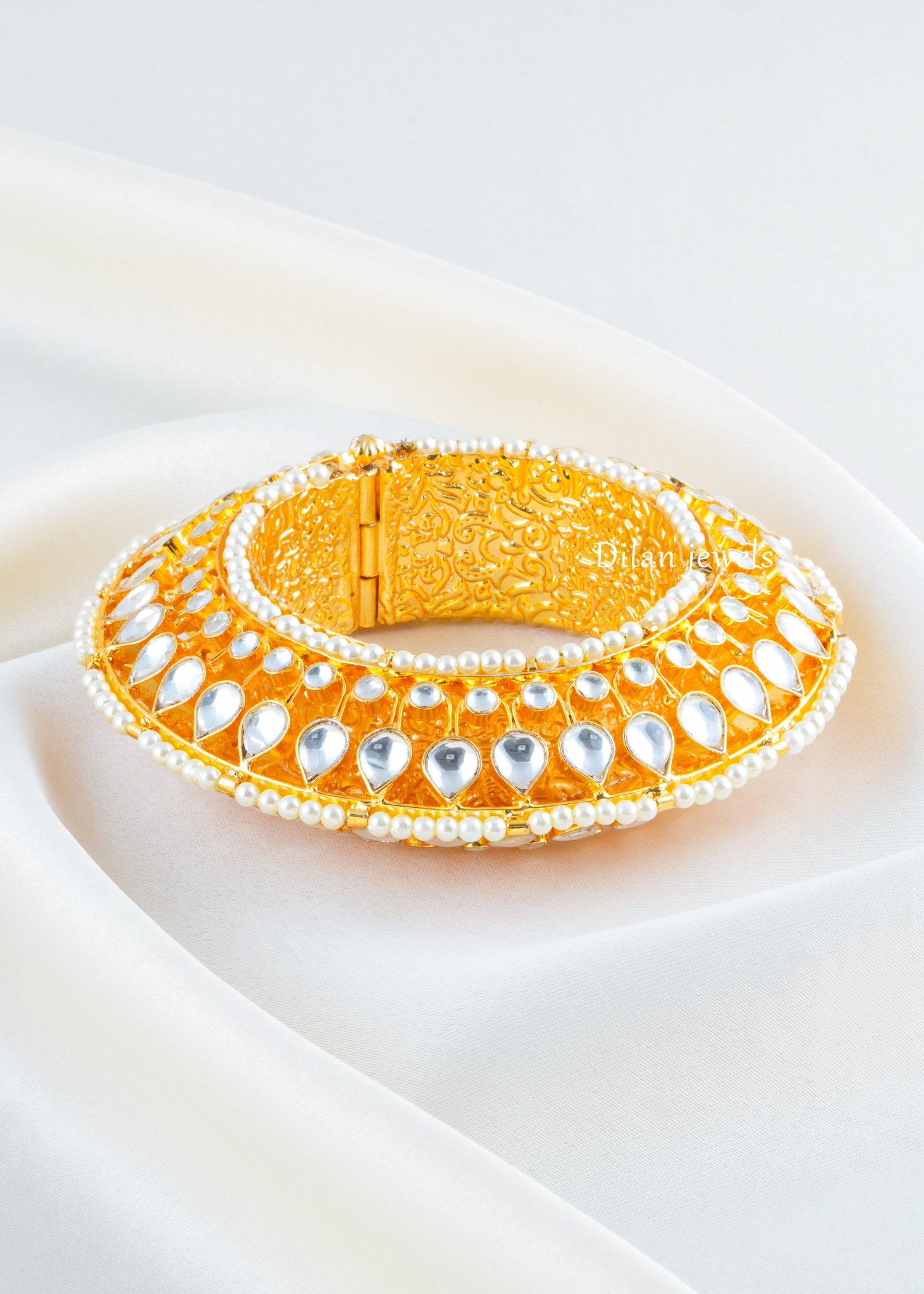 Add a regal touch to your collection with this stunning bangle crafted in premium German silver, embellished with AAA quality American diamonds for a radiant sparkle. Designed with intricate detailing, the piece features elegant teardrop and round stone patterns, beautifully framed with delicate pearl accents for a luxurious finish. The rich gold-tone polish enhances its traditional charm while maintaining durability and comfort. Perfect for weddings, festive occasions, or statement styling, this bangle effortlessly blends classic elegance with modern craftsmanship, making it a standout accessory for any ensemble.