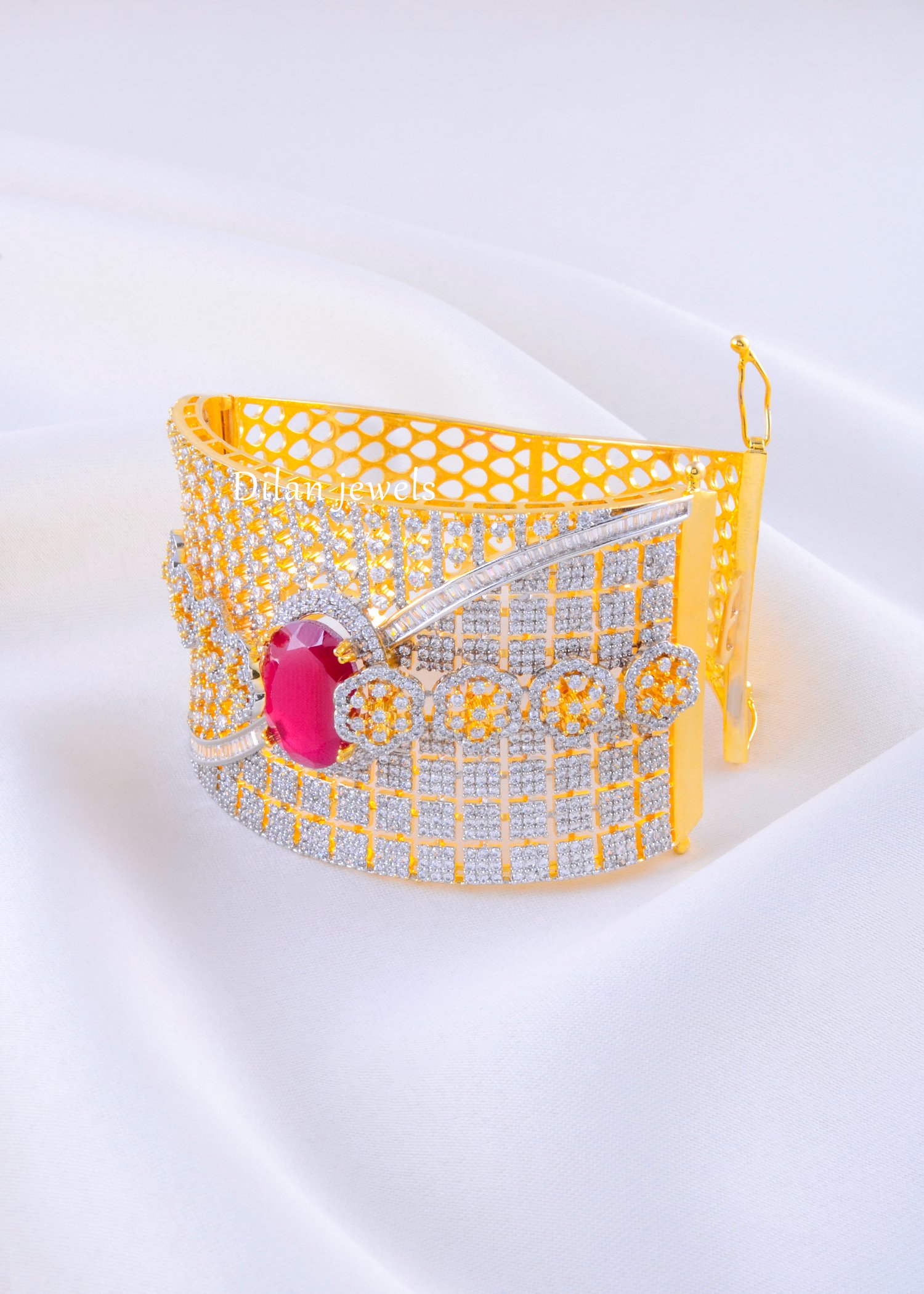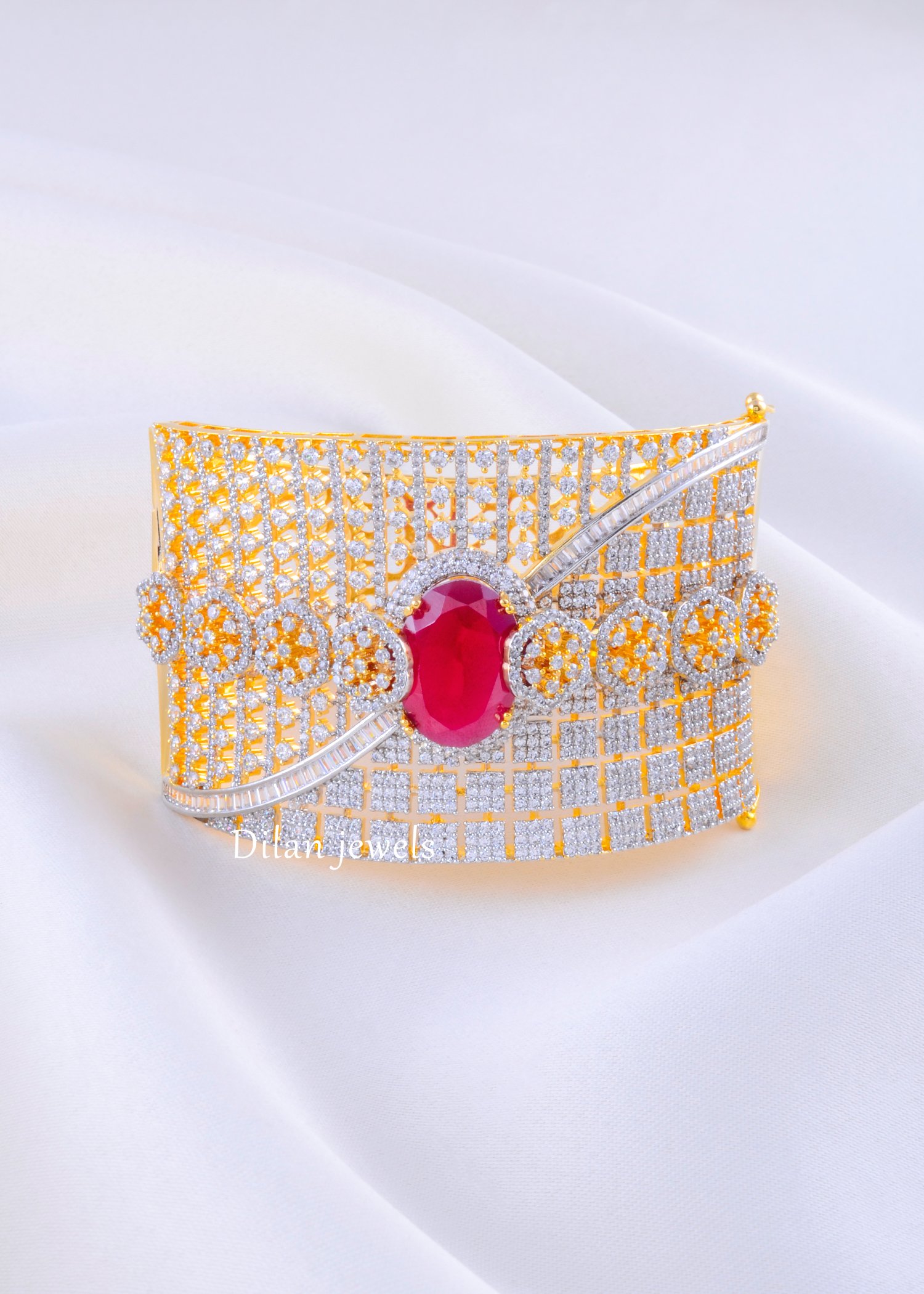 Make a grand statement with this exquisite openable bracelet, meticulously crafted from high-quality German Silver. The bracelet features a magnificent, wide mesh-like design encrusted with rows of sparkling AAA-quality American Diamonds, creating a shimmering canvas of light. At its heart lies a striking oval-cut ruby red stone, surrounded by a halo of brilliant diamonds, adding a bold pop of color and royal elegance. The convenient openable clasp ensures easy wearability and a secure fit for most wrist sizes. This luxurious piece blends traditional grandeur with contemporary sophistication, making it the perfect accessory for weddings, festive celebrations, or special occasions.