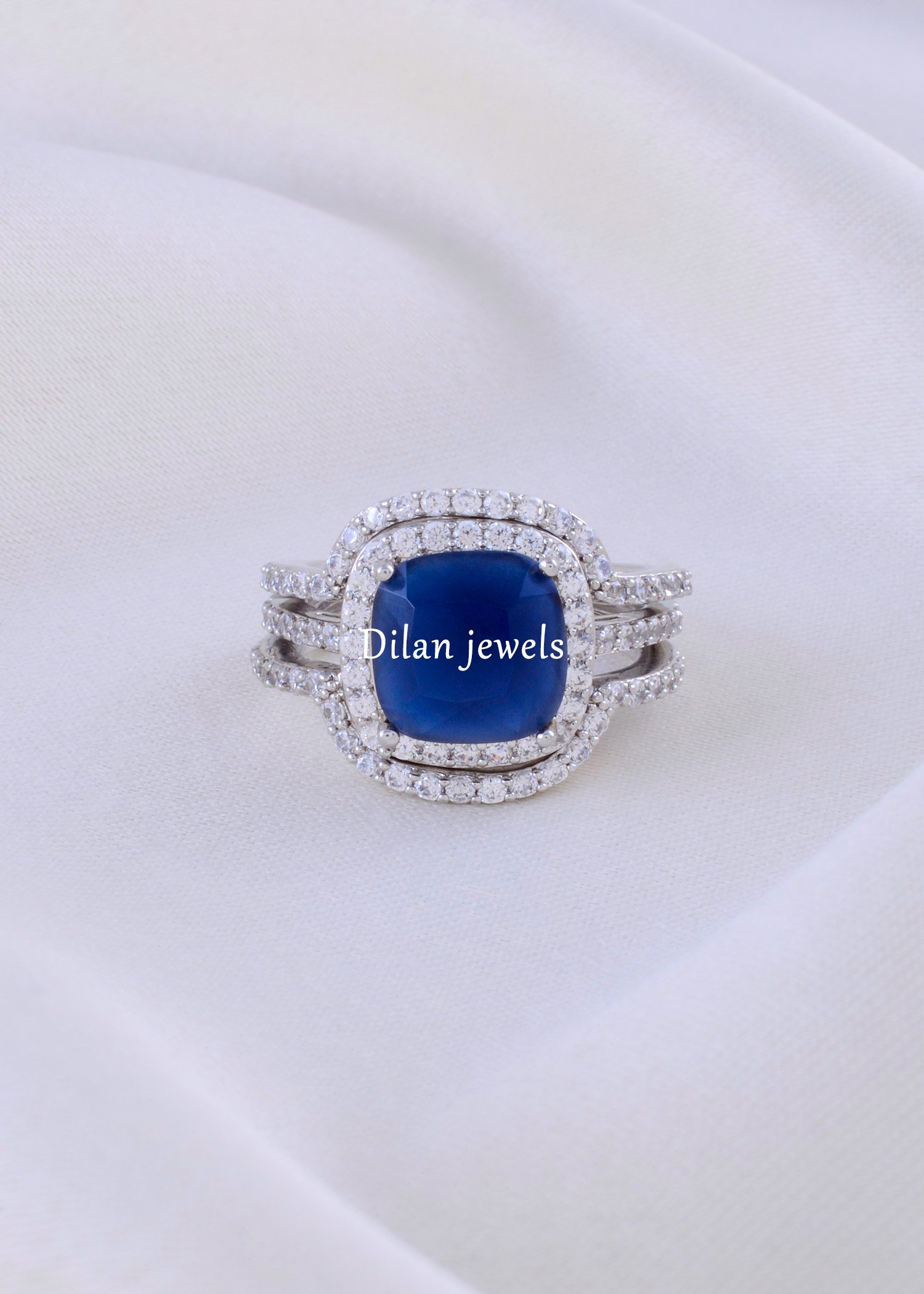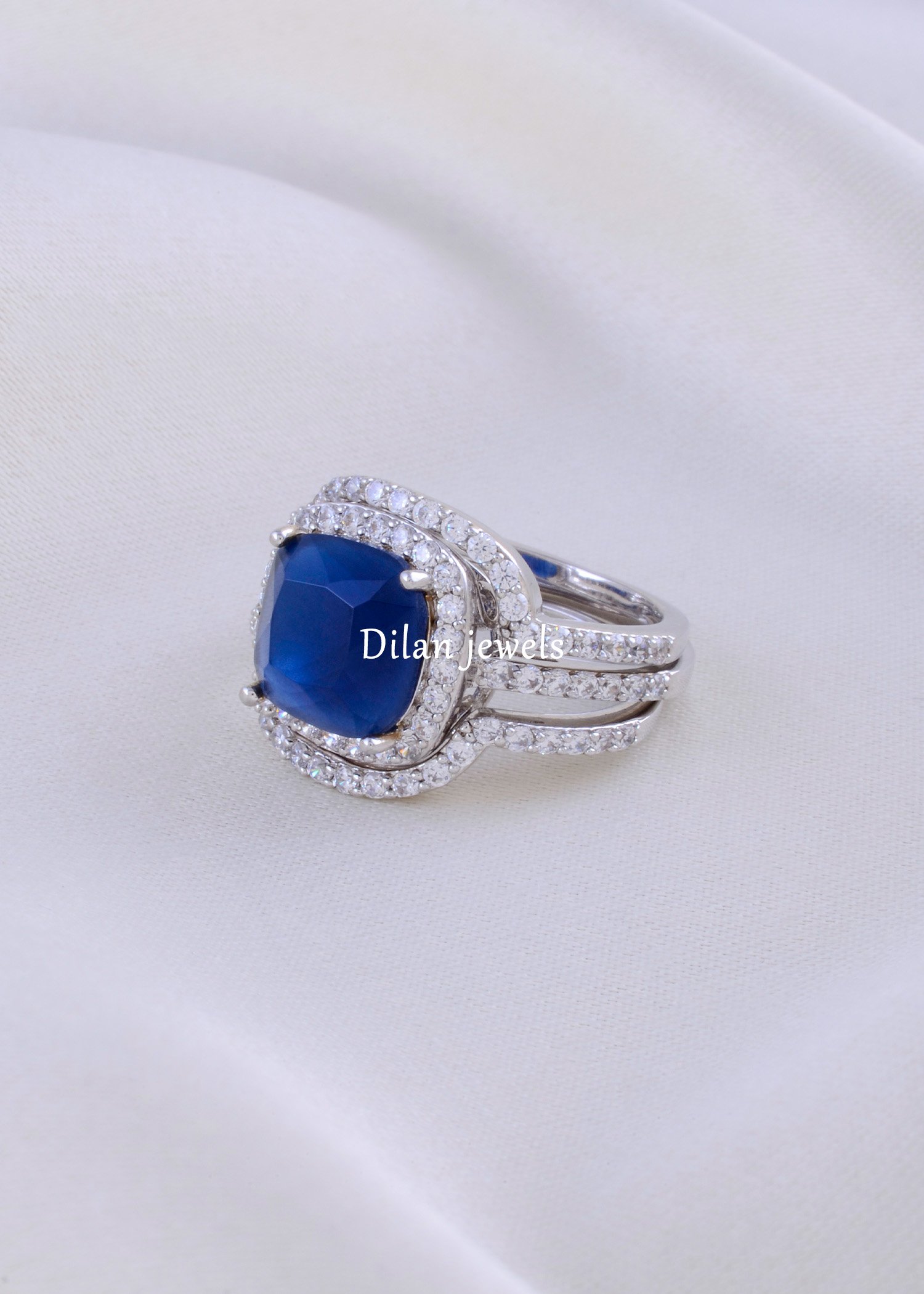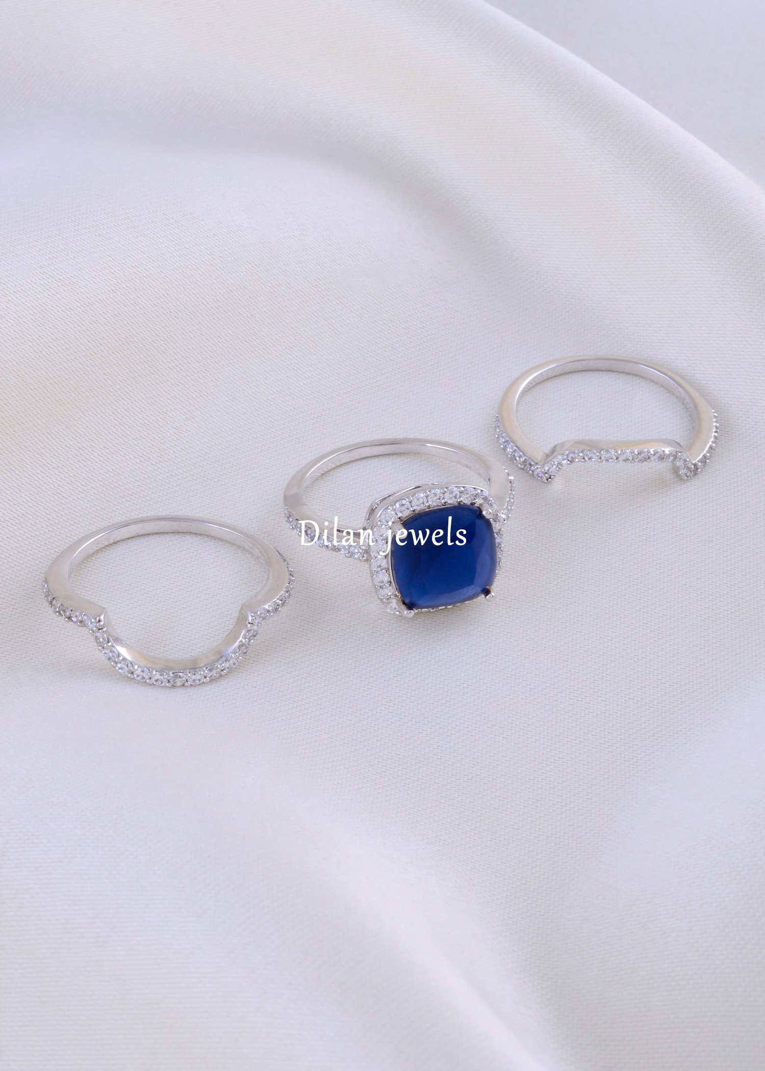 Channel royalty with this exquisite 3-Piece Royal Blue Stackable Ring Set. The showstopper is a deep, sapphire-hued cushion-cut gemstone, surrounded by a halo of shimmering American Diamonds (CZ). This versatile set includes two matching curved eternity bands—known as ring jackets—that slot perfectly above and below the solitaire, instantly amplifying its brilliance. Crafted with a sleek silver finish, this convertible design adapts to your style: wear the single stone for understated elegance or the full triple stack for a dramatic, high-fashion cocktail look. It is luxury and versatility combined.