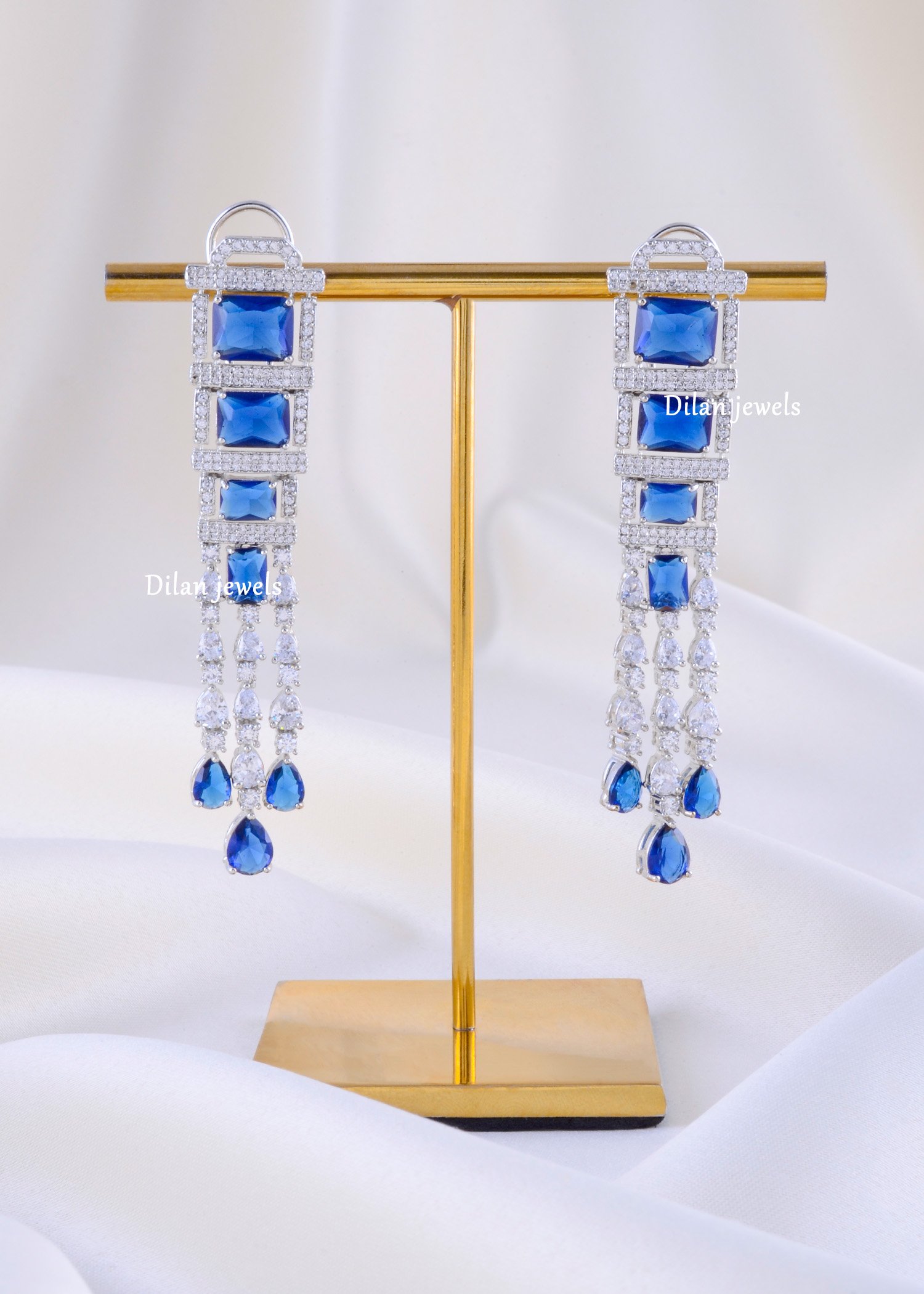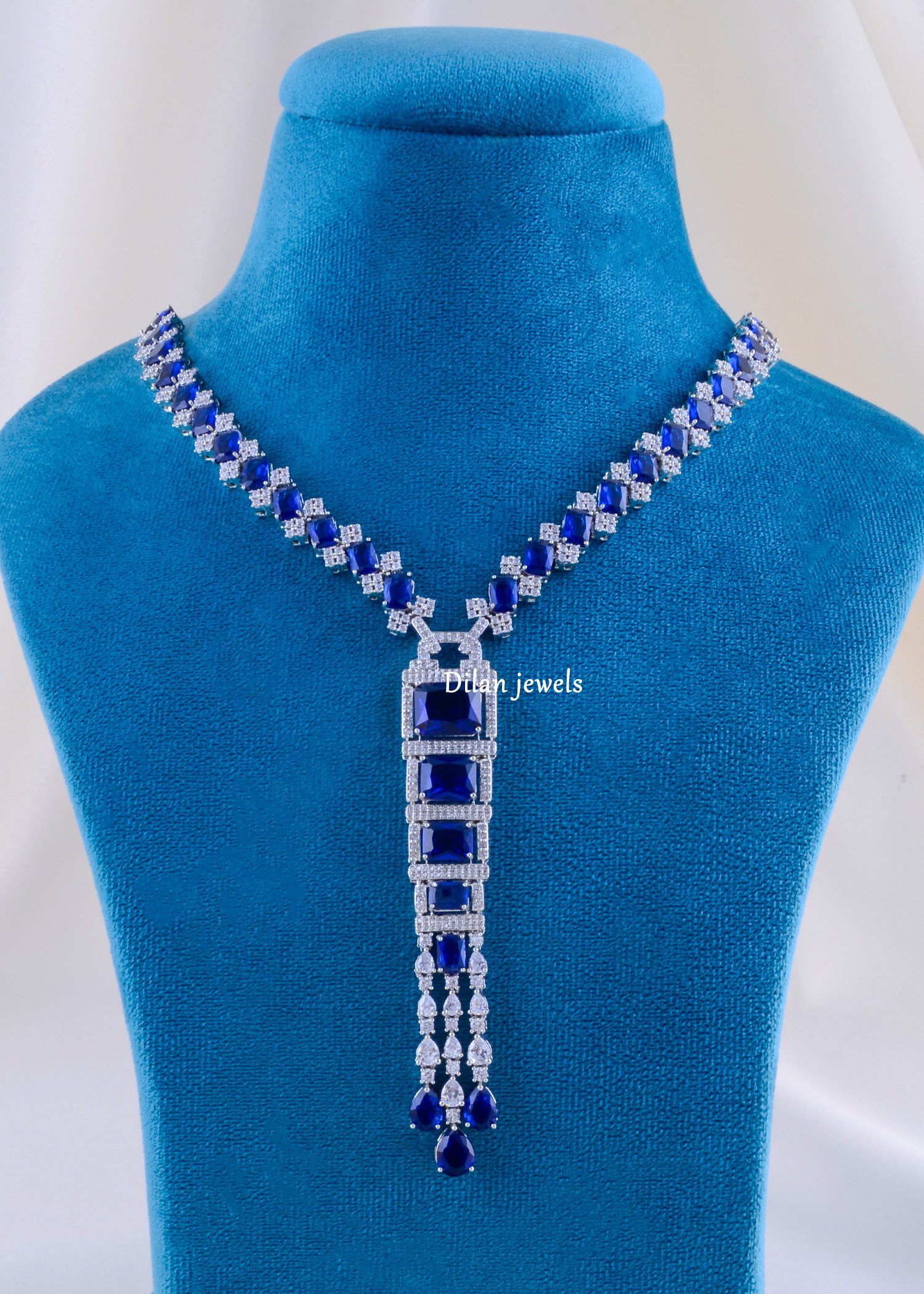 Make a breathtaking statement with this luxurious German Silver necklace set. The choker-style chain features continuous links of pavé-set AAA-quality American Diamonds surrounding brilliant sapphire-blue square-cut stones. A dramatic drop pendant, combining blue baguettes and dazzling AD clusters, creates an exquisite V-neckline. The matching long dangle earrings mirror the tiered pendant design for a cohesive, high-fashion look. Finished in a premium rhodium polish, this set is the perfect glamorous accessory for weddings, receptions, or gala events.